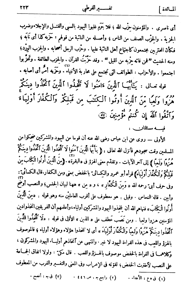 فِيهِ مَسْأَلَتَانِ: الْأُولَى: رُوِيَ عَنِ ابْنِ عَبَّاسٍ رَضِيَ اللَّهُ عَنْهُ أَنَّ قَوْمًا مِنَ الْيَهُودِ وَالْمُشْرِكِينَ ضَحِكُوا مِنَ الْمُسْلِمِينَ وَقْتَ سُجُودِهِمْ فَأَنْزَلَ اللَّهُ تَعَالَى: يَا أَيُّهَا الَّذِينَ آمَنُوا لَا تَتَّخِذُوا الَّذِينَ اتَّخَذُوا دِينَكُمْ هُزُواً وَلَعِباً إِلَى آخِرِ الْآيَاتِ. وَتَقَدَّمَ مَعْنَى الْهُزُؤِ فِي" الْبَقَرَةِ" «٢»." مِنَ الَّذِينَ أُوتُوا الْكِتابَ مِنْ قَبْلِكُمْ وَالْكُفَّارَ أَوْلِياءَ" قَرَأَهُ أَبُو عَمْرٍو وَالْكِسَائِيُّ بِالْخَفْضِ بِمَعْنَى وَمِنَ الْكُفَّارِ. قَالَ الْكِسَائِيُّ: وَفِي حَرْفِ أُبَيٍّ رَحِمَهُ اللَّهُ" وَمِنَ الْكُفَّارِ"، و" من" هَاهُنَا لِبَيَانِ الْجِنْسِ، وَالنَّصْبُ أَوْضَحُ «٣» وَأَبْيَنُ. قَالَهُ النَّحَّاسُ. وَقِيلَ: هُوَ مَعْطُوفٌ عَلَى أَقْرَبِ الْعَامِلَيْنِ مِنْهُ وَهُوَ قَوْلُهُ:" مِنَ الَّذِينَ أُوتُوا الْكِتابَ" فَنَهَاهُمُ اللَّهُ أَنْ يَتَّخِذُوا الْيَهُودَ وَالْمُشْرِكِينَ أَوْلِيَاءَ، وَأَعْلَمَهُمْ أَنَّ الْفَرِيقَيْنِ اتَّخَذُوا دِينَ الْمُؤْمِنِينَ هُزُوًا وَلَعِبًا. وَمَنْ نَصَبَ عَطَفَ عَلَى" الَّذِينَ" الْأَوَّلِ فِي قَوْلِهِ:" لَا تَتَّخِذُوا الَّذِينَ اتَّخَذُوا دِينَكُمْ هُزُواً وَلَعِباً وَالْكُفَّارَ أَوْلِياءَ" أَيْ لَا تَتَّخِذُوا هَؤُلَاءِ وَهَؤُلَاءِ أولياء، فالموصوف بالهزو وَاللَّعِبِ فِي هَذِهِ الْقِرَاءَةِ الْيَهُودُ لَا غَيْرَ. وَالْمَنْهِيُّ عَنِ اتِّخَاذِهِمْ أَوْلِيَاءَ الْيَهُودُ وَالْمُشْرِكُونَ، وَكِلَاهُمَا في القراءة بالخفض موصوف بالهزو وَاللَّعِبِ. قَالَ مَكِّيٌّ: وَلَوْلَا اتِّفَاقُ الْجَمَاعَةِ عَلَى النَّصْبِ لَاخْتَرْتُ الْخَفْضَ، لِقُوَّتِهِ فِي الْإِعْرَابِ وَفِي المعنى والتفسير والقرب من المعطوف