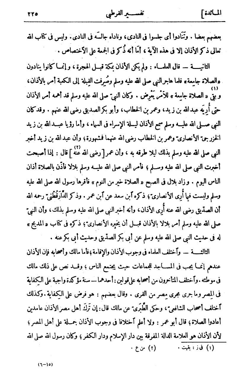 بَعْضُهُمْ بَعْضًا. وَتَنَادَوْا أَيْ جَلَسُوا فِي النَّادِي، وَنَادَاهُ جَالَسَهُ فِي النَّادِي. وَلَيْسَ فِي كِتَابِ اللَّهِ تَعَالَى ذِكْرُ الْأَذَانِ إِلَّا فِي هَذِهِ الْآيَةِ، أَمَا إِنَّهُ ذُكِرَ فِي الْجُمُعَةِ عَلَى الِاخْتِصَاصِ. الثَّانِيَةُ- قَالَ الْعُلَمَاءُ: وَلَمْ يَكُنِ الْأَذَانُ بمكة فبل الهجرة، وإنما كانوا ينادون" الصلاة جامعة" فلم هَاجَرَ النَّبِيُّ صَلَّى اللَّهُ عَلَيْهِ وَسَلَّمَ وَصُرِفَتِ الْقِبْلَةُ إِلَى الْكَعْبَةِ أُمِرَ بِالْأَذَانِ، وَبَقِيَ «١» " الصَّلَاةَ جَامِعَةً" لِلْأَمْرِ يَعْرِضُ. وَكَانَ النَّبِيُّ صَلَّى اللَّهُ عَلَيْهِ وَسَلَّمَ قَدْ أَهَمَّهُ أَمْرُ الْأَذَانِ حَتَّى أُرِيَهُ عَبْدُ اللَّهِ بْنُ زَيْدٍ، وَعُمَرُ بْنُ الخطاب، وأبو بكر الصديق رضي الله عنه. وَقَدْ كَانَ النَّبِيُّ صَلَّى اللَّهُ عَلَيْهِ وَسَلَّمَ سَمِعَ الْأَذَانَ لَيْلَةَ الْإِسْرَاءِ فِي السَّمَاءِ، وَأَمَّا رُؤْيَا عَبْدِ اللَّهِ بْنِ زَيْدٍ الْخَزْرَجِيِّ الْأَنْصَارِيِّ وَعُمَرَ بْنِ الْخَطَّابِ رَضِيَ اللَّهُ عَنْهُمَا فَمَشْهُورَةٌ، وَأَنَّ عَبْدَ اللَّهِ بْنَ زَيْدٍ أَخْبَرَ النَّبِيَّ صَلَّى اللَّهُ عَلَيْهِ وَسَلَّمَ بِذَلِكَ لَيْلًا طَرَقَهُ بِهِ، وَأَنَّ عُمَرَ] رَضِيَ اللَّهُ عَنْهُ [«٢» قَالَ: إِذَا أَصْبَحْتُ أَخْبَرْتُ النَّبِيَّ صَلَّى اللَّهُ عَلَيْهِ وَسَلَّمَ، فَأَمَرَ النَّبِيُّ صَلَّى اللَّهُ عَلَيْهِ وَسَلَّمَ بِلَالًا فَأَذَّنَ بِالصَّلَاةِ أَذَانَ النَّاسِ الْيَوْمَ. وَزَادَ بِلَالٌ فِي الصُّبْحِ" الصَّلَاةُ خَيْرٌ مِنَ النَّوْمِ" فَأَقَرَّهَا رَسُولُ اللَّهِ صَلَّى اللَّهُ عَلَيْهِ وَسَلَّمَ وَلَيْسَتْ فِيمَا أُرِيَ الْأَنْصَارِيُّ، ذَكَرَهُ ابْنُ سَعْدٍ عَنِ ابْنِ عُمَرَ. وَذَكَرَ الدَّارَقُطْنِيُّ رَحِمَهُ اللَّهُ أَنَّ الصِّدِّيقَ رَضِيَ اللَّهُ عَنْهُ أُرِيَ الْأَذَانَ، وَأَنَّهُ أَخْبَرَ النَّبِيَّ صَلَّى اللَّهُ عَلَيْهِ وَسَلَّمَ بِذَلِكَ، وَأَنَّ النَّبِيَّ صَلَّى اللَّهُ عَلَيْهِ وَسَلَّمَ أَمَرَ بلالا بالأذان قَبْلَ أَنْ يُخْبِرَهُ الْأَنْصَارِيُّ، ذَكَرَهُ فِي كِتَابِ" المدبج" لَهُ فِي حَدِيثِ النَّبِيِّ صَلَّى اللَّهُ عَلَيْهِ وَسَلَّمَ عَنْ أَبِي بَكْرٍ الصِّدِّيقِ وَحَدِيثِ أَبِي بَكْرٍ عَنْهُ. الثَّالِثَةُ- وَاخْتَلَفَ الْعُلَمَاءُ فِي وُجُوبِ الْأَذَانِ وَالْإِقَامَةِ، فَأَمَّا مَالِكٌ وَأَصْحَابُهُ فَإِنَّ الْأَذَانَ عندهم إنما بجب فِي الْمَسَاجِدِ لِلْجَمَاعَاتِ حَيْثُ يَجْتَمِعُ النَّاسُ، وَقَدْ نَصَّ عَلَى ذَلِكَ مَالِكٌ فِي مُوَطَّئِهِ. وَاخْتَلَفَ الْمُتَأَخِّرُونَ مِنْ أَصْحَابِهِ عَلَى قَوْلَيْنِ: أَحَدُهُمَا: سُنَّةٌ مُؤَكَّدَةٌ وَاجِبَةٌ عَلَى الْكِفَايَةِ فِي الْمِصْرِ وَمَا جرى مجرى مصر مِنَ الْقُرَى. وَقَالَ بَعْضُهُمْ: هُوَ فَرْضٌ عَلَى الْكِفَايَةِ. وَكَذَلِكَ اخْتَلَفَ أَصْحَابُ الشَّافِعِيِّ، وَحَكَى الطَّبَرِيُّ عَنْ مَالِكٍ قَالَ: إِنْ تَرَكَ أَهْلُ مِصْرَ الْأَذَانَ عَامِدِينَ أَعَادُوا الصَّلَاةَ، قَالَ أَبُو عُمَرَ: وَلَا أَعْلَمُ اخْتِلَافًا فِي وُجُوبِ الْأَذَانِ جُمْلَةً عَلَى أَهْلِ الْمِصْرِ، لِأَنَّ الْأَذَانَ هُوَ الْعَلَامَةُ الدَّالَّةُ الْمُفَرِّقَةُ بَيْنَ دَارِ الْإِسْلَامِ وَدَارِ الْكُفْرِ، وكان رسول الله صلى الله