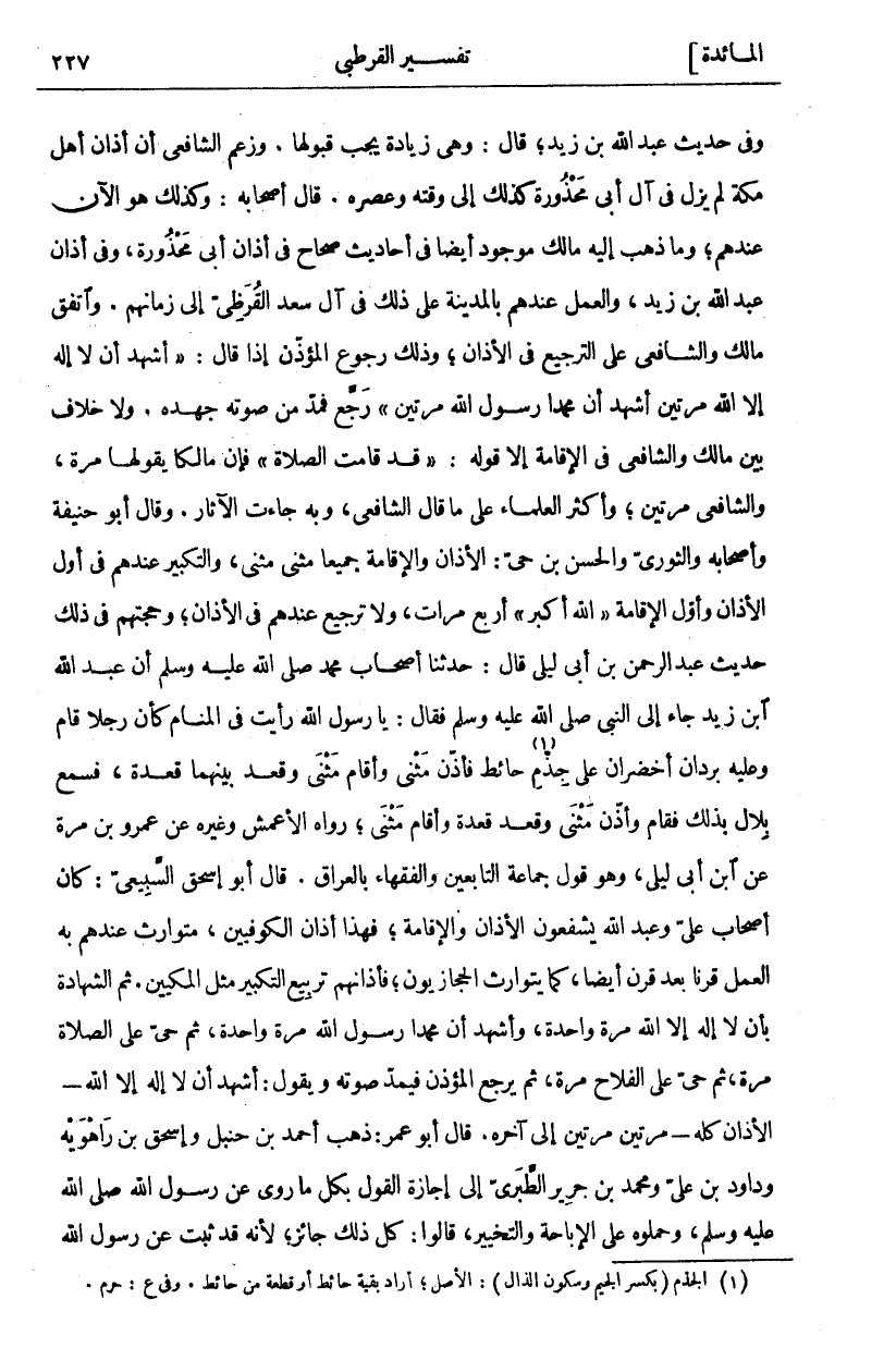 وَفِي حَدِيثِ عَبْدِ اللَّهِ بْنِ زَيْدٍ، قَالَ: وَهِيَ زِيَادَةٌ يَجِبُ قَبُولُهَا. وَزَعَمَ الشَّافِعِيُّ أَنَّ أَذَانَ أَهْلِ مَكَّةَ لَمْ يَزَلْ فِي آلِ أَبِي مَحْذُورَةَ كَذَلِكَ إِلَى وَقْتِهِ وَعَصْرِهِ. قَالَ أَصْحَابُهُ: وَكَذَلِكَ هُوَ الْآنَ عِنْدَهُمْ، وَمَا ذَهَبَ إِلَيْهِ مَالِكٌ مَوْجُودٌ أَيْضًا فِي أَحَادِيثَ صِحَاحٍ فِي أَذَانِ أَبِي مَحْذُورَةَ، وَفِي أَذَانِ عَبْدِ اللَّهِ بْنِ زَيْدٍ، وَالْعَمَلُ عِنْدَهُمْ بِالْمَدِينَةِ عَلَى ذَلِكَ فِي آلِ سَعْدٍ الْقُرَظِيِّ إِلَى زَمَانِهِمْ. وَاتَّفَقَ مَالِكٌ وَالشَّافِعِيُّ عَلَى التَّرْجِيعِ فِي الْأَذَانِ، وَذَلِكَ رُجُوعُ الْمُؤَذِّنِ إِذَا قَالَ:" أَشْهَدُ أَنْ لَا إِلَهَ إِلَّا اللَّهُ مَرَّتَيْنِ أَشْهَدُ أَنَّ مُحَمَّدًا رَسُولُ اللَّهِ مَرَّتَيْنِ" رَجَّعَ فَمَدَّ مِنْ صَوْتِهِ جَهْدَهُ. وَلَا خِلَافَ بَيْنَ مَالِكٍ وَالشَّافِعِيِّ فِي الْإِقَامَةِ إِلَّا قَوْلَهُ:" قَدْ قَامَتِ الصَّلَاةُ" فَإِنَّ مَالِكًا يَقُولُهَا مَرَّةً، وَالشَّافِعِيَّ مَرَّتَيْنِ، وَأَكْثَرُ الْعُلَمَاءِ عَلَى مَا قَالَ الشَّافِعِيُّ، وَبِهِ جَاءَتِ الْآثَارُ. وَقَالَ أَبُو حَنِيفَةَ وَأَصْحَابُهُ وَالثَّوْرِيُّ وَالْحَسَنُ بْنُ حَيٍّ: الْأَذَانُ وَالْإِقَامَةُ جَمِيعًا مَثْنَى مَثْنَى، وَالتَّكْبِيرُ عِنْدَهُمْ فِي أَوَّلِ الْأَذَانِ وَأَوَّلِ الْإِقَامَةِ" اللَّهُ أَكْبَرُ" أَرْبَعَ مَرَّاتٍ، وَلَا تَرْجِيعَ عِنْدِهِمْ فِي الْأَذَانِ، وَحُجَّتُهُمْ فِي ذَلِكَ حَدِيثُ عَبْدِ الرَّحْمَنِ بْنِ أَبِي لَيْلَى قَالَ: حَدَّثَنَا أَصْحَابُ مُحَمَّدٍ صَلَّى اللَّهُ عَلَيْهِ وَسَلَّمَ أَنَّ عَبْدَ الله ابن زَيْدٍ جَاءَ إِلَى النَّبِيِّ صَلَّى اللَّهُ عَلَيْهِ وَسَلَّمَ فَقَالَ: يَا رَسُولَ اللَّهِ، رَأَيْتُ فِي الْمَنَامِ كَانَ رَجُلًا قَامَ وَعَلَيْهِ بُرْدَانِ أَخْضَرَانِ عَلَى جِذْمِ «١» حَائِطٍ فَأَذَّنَ مَثْنَى وَأَقَامَ مَثْنَى وَقَعَدَ بَيْنَهُمَا قَعْدَةً، فَسَمِعَ بِلَالُ بِذَلِكَ فَقَامَ وَأَذَّنَ مَثْنَى وَقَعَدَ قَعْدَةً وَأَقَامَ مَثْنَى، رَوَاهُ الْأَعْمَشُ وَغَيْرُهُ عَنْ عَمْرِو بْنِ مُرَّةَ عَنِ ابْنِ أَبِي لَيْلَى، وَهُوَ قَوْلُ جَمَاعَةِ التَّابِعِينَ وَالْفُقَهَاءِ بِالْعِرَاقِ. قَالَ أَبُو إِسْحَاقَ السَّبِيعِيُّ: كَانَ أَصْحَابُ عَلِيٍّ وَعَبْدِ اللَّهِ يَشْفَعُونَ الْأَذَانَ وَالْإِقَامَةَ، فَهَذَا أَذَانُ الْكُوفِيِّينَ، مُتَوَارَثٌ عِنْدَهُمْ بِهِ الْعَمَلُ قَرْنًا بَعْدَ قَرْنٍ أَيْضًا، كَمَا يَتَوَارَثُ الْحِجَازِيُّونَ، فَأَذَانُهُمْ تَرْبِيعُ التَّكْبِيرِ مِثْلُ الْمَكِّيِّينَ. ثُمَّ الشَّهَادَةُ بِأَنْ لَا إِلَهَ إِلَّا اللَّهُ مَرَّةً وَاحِدَةً، وَأَشْهَدُ أَنَّ مُحَمَّدًا رَسُولُ اللَّهِ مَرَّةً وَاحِدَةً، ثُمَّ حَيَّ عَلَى الصَّلَاةِ مَرَّةً، ثُمَّ حَيَّ عَلَى الْفَلَاحِ مَرَّةً، ثُمَّ يُرَجِّعُ الْمُؤَذِّنُ فَيَمُدُّ صَوْتَهُ وَيَقُولُ: أَشْهَدُ أَنْ لَا إِلَهَ إِلَّا اللَّهُ- الْأَذَانُ كُلُّهُ- مَرَّتَيْنِ مَرَّتَيْنِ إِلَى آخِرِهِ. قَالَ أَبُو عُمَرَ: ذَهَبَ أَحْمَدُ بْنُ حَنْبَلٍ وَإِسْحَاقُ بْنُ رَاهَوَيْهِ وَدَاوُدُ بْنُ عَلِيٍّ وَمُحَمَّدُ بْنُ جَرِيرٍ الطَّبَرِيُّ إِلَى إِجَازَةِ الْقَوْلِ بِكُلِّ مَا رُوِيَ عَنْ رَسُولِ اللَّهِ صَلَّى اللَّهُ عَلَيْهِ وَسَلَّمَ، وَحَمَلُوهُ عَلَى الْإِبَاحَةِ وَالتَّخْيِيرِ، قَالُوا: كُلُّ ذَلِكَ جَائِزٌ، لِأَنَّهُ قَدْ ثَبَتَ عَنْ رسول الله