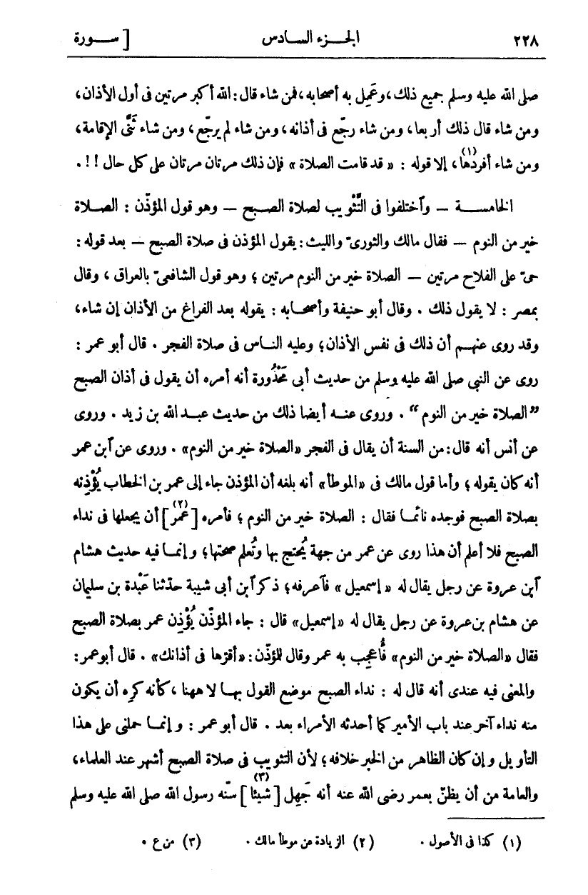 صَلَّى اللَّهُ عَلَيْهِ وَسَلَّمَ جَمِيعُ ذَلِكَ، وَعَمِلَ بِهِ أَصْحَابُهُ، فَمَنْ شَاءَ قَالَ: اللَّهُ أَكْبَرُ مَرَّتَيْنِ فِي أَوَّلِ الْأَذَانِ، وَمَنْ شَاءَ قَالَ ذَلِكَ أَرْبَعًا، وَمَنْ شَاءَ رَجَّعَ فِي أَذَانِهِ، وَمَنْ شَاءَ لَمْ يُرَجِّعْ، وَمَنْ شَاءَ ثَنَّى الْإِقَامَةَ، وَمَنْ شَاءَ أَفْرَدَهَا «١»، إِلَّا قَوْلَهُ:" قَدْ قَامَتِ الصَّلَاةُ" فَإِنَّ ذَلِكَ مَرَّتَانِ مَرَّتَانِ عَلَى كُلِّ حَالٍ!!. الْخَامِسَةُ- وَاخْتَلَفُوا فِي التَّثْوِيبِ لِصَلَاةِ الصُّبْحِ- وَهُوَ قَوْلُ الْمُؤَذِّنِ: الصَّلَاةُ خَيْرٌ مِنَ النَّوْمِ- فَقَالَ مَالِكٌ وَالثَّوْرِيُّ وَاللَّيْثُ: يَقُولُ الْمُؤَذِّنُ فِي صَلَاةِ الصُّبْحِ- بَعْدَ قَوْلِهِ: حَيَّ عَلَى الْفَلَاحِ مَرَّتَيْنِ- الصَّلَاةُ خَيْرٌ مِنَ النَّوْمِ مَرَّتَيْنِ، وَهُوَ قَوْلُ الشَّافِعِيِّ بِالْعِرَاقِ، وَقَالَ بِمِصْرَ: لَا يَقُولُ ذَلِكَ. وَقَالَ أَبُو حَنِيفَةَ وَأَصْحَابُهُ: يَقُولُهُ بَعْدَ الْفَرَاغِ مِنَ الْأَذَانِ إِنْ شَاءَ، وَقَدْ رُوِيَ عَنْهُمْ أَنَّ ذَلِكَ فِي نَفْسِ الْأَذَانِ، وَعَلَيْهِ النَّاسُ فِي صَلَاةِ الْفَجْرِ. قَالَ أَبُو عُمَرَ: رُوِيَ عَنِ النَّبِيِّ صَلَّى اللَّهُ عَلَيْهِ وَسَلَّمَ مِنْ حَدِيثِ أَبِي مَحْذُورَةَ أَنَّهُ أَمَرَهُ أَنْ يَقُولَ فِي أَذَانِ الصُّبْحِ (الصَّلَاةُ خَيْرٌ مِنَ النَّوْمِ). وَرُوِيَ عَنْهُ أَيْضًا ذَلِكَ مِنْ حَدِيثِ عَبْدِ اللَّهِ بْنِ زَيْدٍ. وَرُوِيَ عَنْ أَنَسٍ أَنَّهُ قَالَ: مِنْ السُّنَّةِ أَنْ يُقَالَ فِي الْفَجْرِ" الصَّلَاةُ خَيْرٌ مِنَ النَّوْمِ". وَرُوِيَ عَنِ ابْنِ عُمَرَ أَنَّهُ كَانَ يَقُولُهُ، وَأَمَّا قَوْلُ مَالِكٍ فِي" الْمُوَطَّأِ" أَنَّهُ بَلَغَهُ أَنَّ الْمُؤَذِّنَ جَاءَ إِلَى عُمَرَ بْنِ الْخَطَّابِ يُؤْذِنُهُ بِصَلَاةِ الصُّبْحِ فَوَجَدَهُ نَائِمًا فَقَالَ: الصَّلَاةُ خَيْرٌ مِنَ النَّوْمِ، فَأَمَرَهُ] عُمَرُ [«٢» أَنْ يَجْعَلَهَا فِي نِدَاءِ الصُّبْحِ فَلَا أَعْلَمُ أَنَّ هَذَا رُوِيَ عَنْ عُمَرَ مِنْ جِهَةٍ يُحْتَجُّ بِهَا وتعلم صحتها، وإنما فيه حديث هشام ابن عُرْوَةَ عَنْ رَجُلٍ يُقَالُ لَهُ" إِسْمَاعِيلُ" فَاعْرِفْهُ، ذَكَرَ ابْنُ أَبِي شَيْبَةَ حَدَّثَنَا عَبْدَةُ بْنُ سُلَيْمَانَ عَنْ هِشَامِ بْنِ عُرْوَةَ عَنْ رَجُلٍ يُقَالُ لَهُ" إِسْمَاعِيلُ" قَالَ: جَاءَ الْمُؤَذِّنُ يُؤْذِنُ عُمَرَ بِصَلَاةِ الصُّبْحِ فَقَالَ" الصَّلَاةُ خَيْرٌ مِنَ النَّوْمِ" فَأُعْجِبَ بِهِ عُمَرُ وَقَالَ لِلْمُؤَذِّنِ:" أَقِرَّهَا فِي أَذَانِكَ". قَالَ أَبُو عُمَرَ: وَالْمَعْنَى فِيهِ عِنْدِي أَنَّهُ قَالَ لَهُ: نِدَاءُ الصُّبْحِ مَوْضِعُ الْقَوْلِ بِهَا لَا هَاهُنَا، كَأَنَّهُ كَرِهَ أَنْ يَكُونَ مِنْهُ نِدَاءٌ آخَرُ عِنْدَ بَابِ الْأَمِيرِ كَمَا أَحْدَثَهُ الْأُمَرَاءُ بَعْدُ. قَالَ أَبُو عُمَرَ: وَإِنَّمَا حَمَلَنِي عَلَى هَذَا التَّأْوِيلِ وَإِنْ كَانَ الظَّاهِرُ مِنَ الْخَبَرِ خِلَافُهُ، لِأَنَّ التَّثْوِيبَ فِي صَلَاةِ الصُّبْحِ أَشْهَرُ عِنْدَ الْعُلَمَاءِ، وَالْعَامَّةِ مِنْ أَنْ يُظَنَّ بِعُمَرَ رَضِيَ اللَّهُ عَنْهُ أَنَّهُ جَهِلَ] شَيْئًا [«٣» سُنَّةِ رَسُولِ اللَّهِ صَلَّى اللَّهُ عَلَيْهِ وَسَلَّمَ
