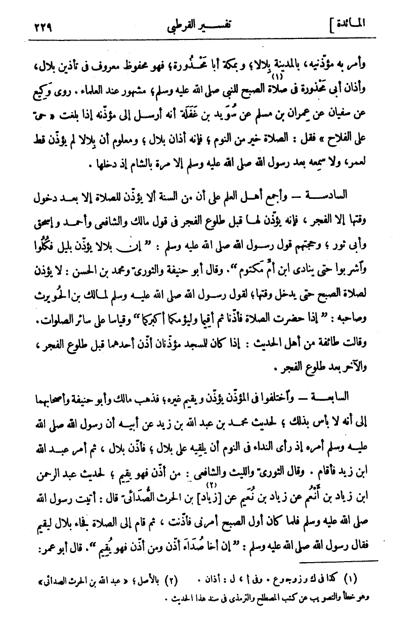 وَأَمَرَ بِهِ مُؤَذِّنِيهِ، بِالْمَدِينَةِ بِلَالًا، وَبِمَكَّةَ أَبَا مَحْذُورَةَ، فَهُوَ مَحْفُوظٌ مَعْرُوفٌ فِي تَأْذِينِ بِلَالٍ، وَأَذَانُ أَبِي مَحْذُورَةَ فِي صَلَاةِ «١» الصُّبْحِ لِلنَّبِيِّ صَلَّى اللَّهُ عَلَيْهِ وَسَلَّمَ، مَشْهُورٌ عِنْدَ الْعُلَمَاءِ. رَوَى وَكِيعٌ عَنْ سُفْيَانَ عَنْ عِمْرَانَ بْنِ مُسْلِمٍ عَنْ سُوَيْدِ بْنِ غَفَلَةَ أَنَّهُ أَرْسَلَ إِلَى مُؤَذِّنِهِ إِذَا بَلَغْتَ" حَيَّ عَلَى الْفَلَاحِ" فَقُلْ: الصَّلَاةُ خَيْرٌ مِنَ النَّوْمِ، فَإِنَّهُ أَذَانُ بِلَالٍ، وَمَعْلُومٌ أَنَّ بِلَالًا لَمْ يُؤَذِّنْ قَطُّ لِعُمَرَ، وَلَا سَمِعَهُ بَعْدَ رَسُولِ اللَّهِ صَلَّى اللَّهُ عَلَيْهِ وَسَلَّمَ إِلَّا مَرَّةً بِالشَّامِ إِذْ دَخَلَهَا. السَّادِسَةُ- وَأَجْمَعَ أَهْلُ الْعِلْمِ عَلَى أَنَّ مِنَ السُّنَّةِ أَلَّا يُؤَذَّنَ لِلصَّلَاةِ إِلَّا بَعْدَ دُخُولِ وَقْتِهَا إِلَّا الْفَجْرَ، فَإِنَّهُ يُؤَذَّنُ لَهَا قَبْلَ طُلُوعِ الْفَجْرِ فِي قَوْلِ مَالِكٍ وَالشَّافِعِيِّ وَأَحْمَدَ وَإِسْحَاقَ وَأَبِي ثَوْرِ، وَحُجَّتُهُمْ قَوْلُ رَسُولِ اللَّهِ صَلَّى اللَّهُ عَلَيْهِ وَسَلَّمَ: (إِنَّ بِلَالًا يُؤَذِّنُ بِلَيْلٍ فَكُلُوا وَاشْرَبُوا حَتَّى يُنَادِيَ ابْنُ أُمِّ مَكْتُومٍ). وَقَالَ أَبُو حَنِيفَةَ وَالثَّوْرِيُّ وَمُحَمَّدُ بْنُ الْحَسَنِ: لَا يؤدن لِصَلَاةِ الصُّبْحِ حَتَّى يَدْخُلَ وَقْتُهَا، لِقَوْلِ رَسُولِ اللَّهِ صَلَّى اللَّهُ عَلَيْهِ وَسَلَّمَ لِمَالِكِ بْنِ الْحُوَيْرِثِ وَصَاحِبِهِ: (إِذَا حَضَرَتِ الصَّلَاةُ فَأَذِّنَا ثُمَّ أَقِيمَا وَلْيَؤُمَّكُمَا أَكْبَرُكُمَا) وَقِيَاسًا عَلَى سَائِرِ الصَّلَوَاتِ. وَقَالَتْ طَائِفَةٌ مِنْ أَهْلِ الْحَدِيثِ: إِذَا كَانَ لِلْمَسْجِدِ مُؤَذِّنَانِ أَذَّنَ أَحَدُهُمَا قَبْلَ طُلُوعِ الْفَجْرِ، وَالْآخَرُ بَعْدَ طُلُوعِ الْفَجْرِ. السَّابِعَةُ- وَاخْتَلَفُوا فِي الْمُؤَذِّنِ يُؤَذِّنُ وَيُقِيمُ غَيْرُهُ، فَذَهَبَ مَالِكٌ وَأَبُو حَنِيفَةَ وَأَصْحَابُهُمَا إِلَى أَنَّهُ لَا بَأْسَ بِذَلِكَ، لِحَدِيثِ مُحَمَّدِ بْنِ عَبْدِ اللَّهِ بْنِ زَيْدٍ عَنْ أَبِيهِ أَنَّ رَسُولَ اللَّهِ صَلَّى اللَّهُ عَلَيْهِ وَسَلَّمَ أَمَرَهُ إِذْ رَأَى النِّدَاءَ فِي النوم أن يلقيه على بلال، فأذن بلال، ثم أمر عبد الله ابن زَيْدٍ فَأَقَامَ. وَقَالَ الثَّوْرِيُّ وَاللَّيْثُ وَالشَّافِعِيُّ: مَنْ أذن فهو يقيم، لحديث عبد الرحمن ابن زِيَادِ بْنِ أَنْعُمٍ عَنْ زِيَادِ بْنِ نُعَيْمٍ عن] زياد [«٢» بن الحرث الصُّدَائِيِّ قَالَ: أَتَيْتُ رَسُولَ اللَّهِ صَلَّى اللَّهُ عَلَيْهِ وَسَلَّمَ فَلَمَّا كَانَ أَوَّلُ الصُّبْحِ أَمَرَنِي فَأَذَّنْتُ، ثُمَّ قَامَ إِلَى الصَّلَاةِ فَجَاءَ بِلَالٌ لِيُقِيمَ. فَقَالَ رَسُولُ اللَّهِ صَلَّى اللَّهُ عَلَيْهِ وَسَلَّمَ: (إِنَّ أَخَا صُدَاءٍ أَذَّنَ وَمَنْ أَذَّنَ فهو يقيم). قال أبو عمر: