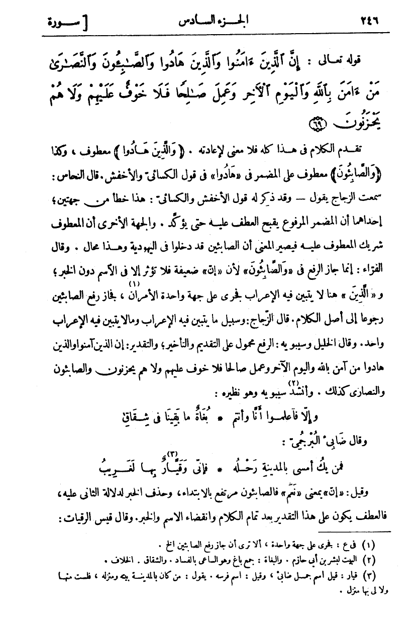 تَقَدَّمَ الكلام فَلَا مَعْنَى لِإِعَادَتِهِ." وَالَّذِينَ هادُوا" مَعْطُوفٌ، وَكَذَا" وَالصَّابِئُونَ" مَعْطُوفٌ عَلَى الْمُضْمَرِ فِي" هادُوا" فِي قَوْلِ الْكِسَائِيِّ وَالْأَخْفَشِ. قَالَ النَّحَّاسُ: سَمِعْتُ الزَّجَّاجَ يَقُولُ: وَقَدْ ذُكِرَ لَهُ قَوْلُ الْأَخْفَشِ وَالْكِسَائِيِّ: هَذَا خَطَأٌ مِنْ جِهَتَيْنِ، إِحْدَاهُمَا أَنَّ الْمُضْمَرَ الْمَرْفُوعَ يَقْبُحُ الْعَطْفُ عَلَيْهِ حَتَّى يُؤَكَّدَ. وَالْجِهَةُ الْأُخْرَى أَنَّ الْمَعْطُوفَ شَرِيكُ الْمَعْطُوفِ عَلَيْهِ فَيَصِيرُ الْمَعْنَى أَنَّ الصَّابِئِينَ قَدْ دَخَلُوا فِي الْيَهُودِيَّةِ وَهَذَا مُحَالٌ. وَقَالَ الْفَرَّاءُ: إِنَّمَا جَازَ الرَّفْعُ فِي" وَالصَّابِئُونَ" لِأَنَّ" إِنَّ" ضَعِيفَةٌ فَلَا تُؤَثِّرُ إلا في الاسم دون الخبر، و" الَّذِينَ" هُنَا لَا يَتَبَيَّنُ فِيهِ الْإِعْرَابُ فَجَرَى عَلَى جِهَةٍ وَاحِدَةٍ الْأَمْرَانِ «١»، فَجَازَ رَفْعُ الصَّابِئِينَ رُجُوعًا إِلَى أَصْلِ الْكَلَامِ. قَالَ الزَّجَّاجُ: وَسَبِيلُ مَا يَتَبَيَّنُ فِيهِ الْإِعْرَابُ وَمَا لَا يَتَبَيَّنُ فِيهِ الْإِعْرَابُ وَاحِدٌ. وَقَالَ الْخَلِيلُ وَسِيبَوَيْهِ: الرَّفْعُ مَحْمُولٌ عَلَى التَّقْدِيمِ وَالتَّأْخِيرِ، وَالتَّقْدِيرُ: إِنَّ الَّذِينَ آمَنُوا وَالَّذِينَ هَادُوا مَنْ آمَنَ بِاللَّهِ وَالْيَوْمِ الْآخِرِ وَعَمِلَ صَالِحًا فَلَا خَوْفٌ عَلَيْهِمْ وَلَا هُمْ يَحْزَنُونَ وَالصَّابِئُونَ وَالنَّصَارَى كَذَلِكَ. وَأَنْشَدَ «٢» سِيبَوَيْهِ وَهُوَ نَظِيرُهُ: