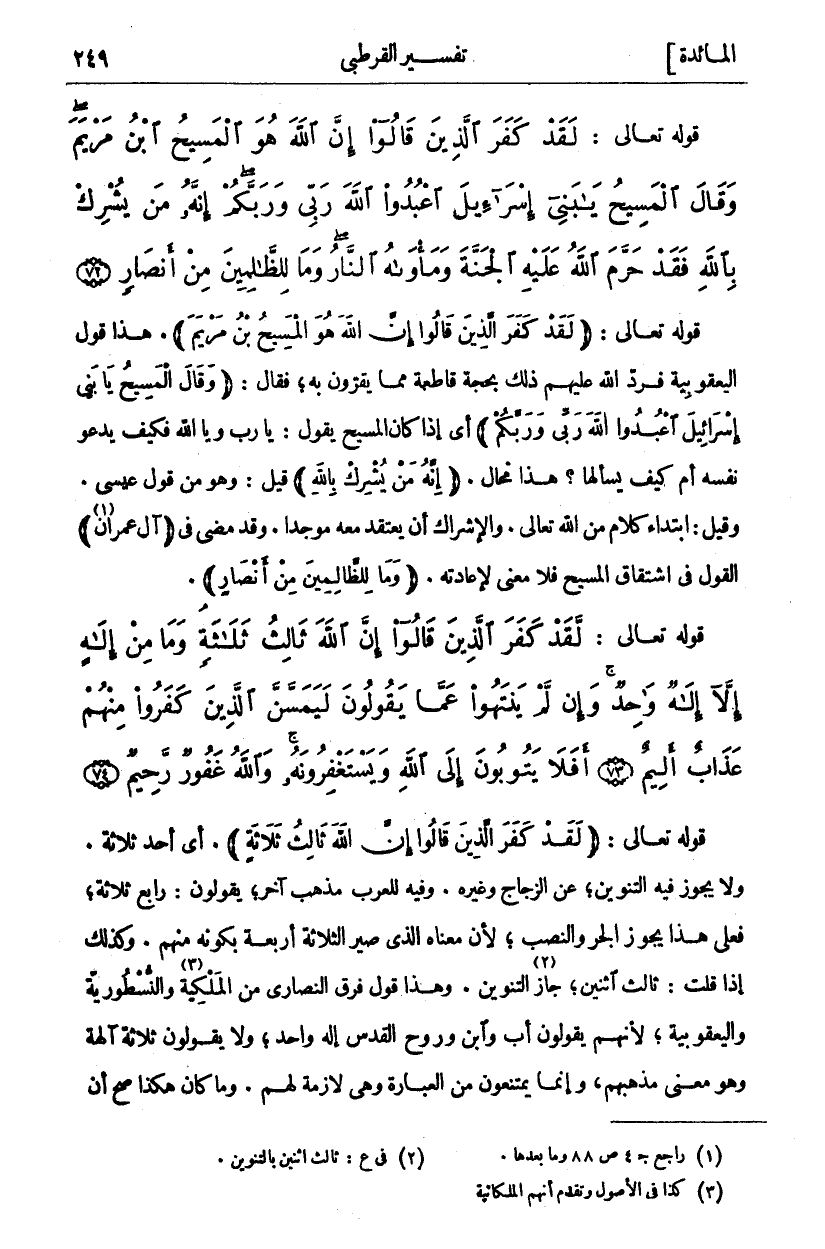 لَقَدْ كَفَرَ الَّذِينَ قالُوا إِنَّ اللَّهَ ثالِثُ ثَلاثَةٍ وَما مِنْ إِلهٍ إِلاَّ إِلهٌ واحِدٌ وَإِنْ لَمْ يَنْتَهُوا عَمَّا يَقُولُونَ لَيَمَسَّنَّ الَّذِينَ كَفَرُوا مِنْهُمْ عَذابٌ أَلِيمٌ (٧٣) أَفَلا يَتُوبُونَ إِلَى اللَّهِ وَيَسْتَغْفِرُونَهُ وَاللَّهُ غَفُورٌ رَحِيمٌ (٧٤)