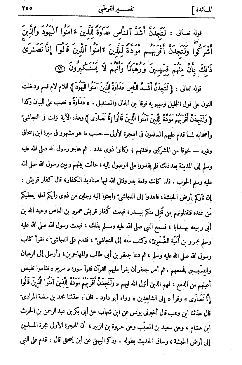 قَوْلُهُ تَعَالَى" لَتَجِدَنَّ أَشَدَّ النَّاسِ عَداوَةً لِلَّذِينَ آمَنُوا الْيَهُودَ" اللام لام قسم وَدَخَلَتِ النُّونُ عَلَى قَوْلِ الْخَلِيلِ وَسِيبَوَيْهِ فَرْقًا بَيْنَ الْحَالِ وَالْمُسْتَقْبَلِ." عَداوَةً" نُصِبَ عَلَى الْبَيَانِ وَكَذَا" وَلَتَجِدَنَّ أَقْرَبَهُمْ مَوَدَّةً لِلَّذِينَ آمَنُوا الَّذِينَ قالُوا إِنَّا نَصارى " وَهَذِهِ الْآيَةُ نَزَلَتْ فِي النَّجَاشِيِّ وَأَصْحَابِهِ لَمَّا قَدِمَ عَلَيْهِمُ الْمُسْلِمُونَ فِي الْهِجْرَةِ الْأُولَى- حَسَبَ مَا هُوَ مَشْهُورٌ فِي سِيرَةِ ابْنِ إِسْحَاقَ وَغَيْرِهِ- خَوْفًا مِنَ الْمُشْرِكِينَ وَفِتْنَتِهِمْ، وَكَانُوا ذَوِي عَدَدٍ. ثُمَّ هَاجَرَ رَسُولُ اللَّهِ صَلَّى اللَّهُ عَلَيْهِ وَسَلَّمَ إِلَى الْمَدِينَةِ بَعْدَ ذَلِكَ فَلَمْ يَقْدِرُوا عَلَى الْوُصُولِ إِلَيْهِ، حَالَتْ بَيْنَهُمْ وَبَيْنَ رَسُولِ اللَّهِ صَلَّى اللَّهُ عَلَيْهِ وَسَلَّمَ الْحَرْبُ. فَلَمَّا كَانَتْ وَقْعَةُ بَدْرٍ وَقَتَلَ اللَّهُ فِيهَا صَنَادِيدَ الْكُفَّارِ، قَالَ كُفَّارُ قُرَيْشٍ: إِنَّ ثَأْرَكُمْ بِأَرْضِ الْحَبَشَةِ، فَاهْدُوا إِلَى النَّجَاشِيِّ وَابْعَثُوا إِلَيْهِ رَجُلَيْنِ مِنْ ذَوِي رَأْيِكُمْ لَعَلَّهُ يُعْطِيكُمْ مَنْ عِنْدَهُ فَتَقْتُلُونَهُمْ بِمَنْ قُتِلَ مِنْكُمْ بِبَدْرٍ، فَبَعَثَ كُفَّارُ قُرَيْشٍ عَمْرَو بْنَ الْعَاصِ وَعَبْدَ اللَّهِ بْنَ أَبِي رَبِيعَةَ بِهَدَايَا، فَسَمِعَ النَّبِيُّ صَلَّى اللَّهُ عَلَيْهِ وَسَلَّمَ بِذَلِكَ، فَبَعَثَ رَسُولُ اللَّهِ صَلَّى اللَّهُ عَلَيْهِ وَسَلَّمَ عَمْرَو بْنَ أُمَيَّةَ الضَّمْرِيَّ، وَكَتَبَ مَعَهُ إِلَى النَّجَاشِيِّ، فَقَدِمَ عَلَى النَّجَاشِيِّ، فَقَرَأَ كِتَابَ رَسُولِ اللَّهِ صَلَّى اللَّهُ عَلَيْهِ وَسَلَّمَ، ثُمَّ دَعَا جَعْفَرَ بْنَ أَبِي طَالِبٍ وَالْمُهَاجِرِينَ، وَأَرْسَلَ إِلَى الرهبان والقسيسين فجمعهم. ثم أمر جعفر أَنْ يَقْرَأَ عَلَيْهِمُ الْقُرْآنَ فَقَرَأَ سُورَةَ (مَرْيَمَ) فَقَامُوا تَفِيضُ أَعْيُنُهُمْ مِنَ الدَّمْعِ، فَهُمُ الَّذِينَ أَنْزَلَ اللَّهُ فِيهِمْ" وَلَتَجِدَنَّ أَقْرَبَهُمْ مَوَدَّةً لِلَّذِينَ آمَنُوا الَّذِينَ قالُوا إِنَّا نَصارى " وَقَرَأَ إِلَى" الشَّاهِدِينَ" رَوَاهُ أَبُو دَاوُدَ. قَالَ: حَدَّثَنَا مُحَمَّدُ بْنُ سَلَمَةَ الْمُرَادِيُّ قَالَ حَدَّثَنَا ابْنُ وَهْبٍ قَالَ أَخْبَرَنِي يُونُسُ عَنِ ابْنِ شِهَابٍ عَنْ أَبِي بَكْرِ بْنِ عَبْدِ الرَّحْمَنِ بْنِ الحرث بْنِ هِشَامٍ، وَعَنْ سَعِيدِ بْنِ الْمُسَيَّبِ وَعَنْ عُرْوَةَ بْنِ الزُّبَيْرِ، أَنَّ الْهِجْرَةَ الْأُولَى هِجْرَةُ الْمُسْلِمِينَ إِلَى أَرْضِ الْحَبَشَةِ، وَسَاقَ الْحَدِيثَ بِطُولِهِ. وَذَكَرَ الْبَيْهَقِيُّ عَنِ ابْنِ إِسْحَاقَ قَالَ: قَدِمَ عَلَى النَّبِيِّ