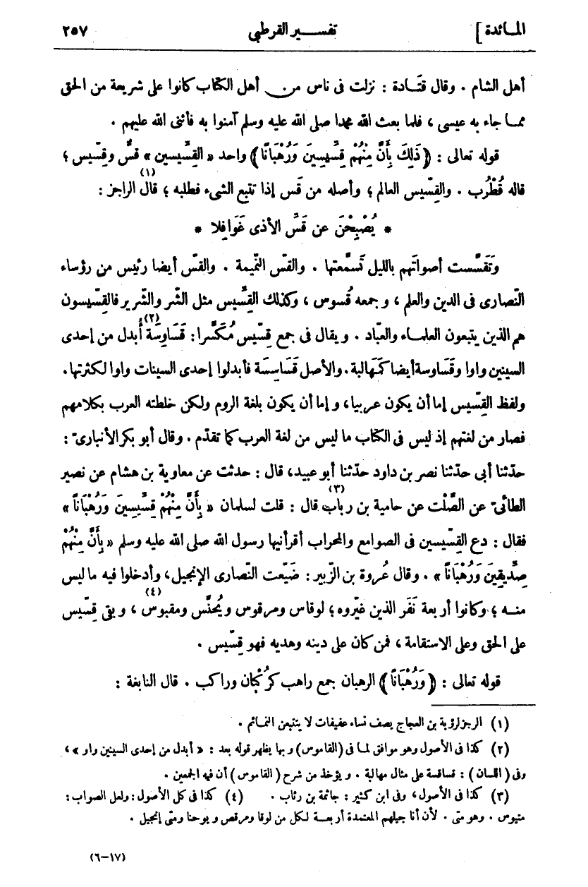 وَتَقَسَّسَتْ أَصْوَاتُهُمْ بِاللَّيْلِ تَسَمَّعْتُهَا. وَالْقَسُّ النَّمِيمَةُ. وَالْقَسُّ أَيْضًا رَئِيسٌ مِنْ رُؤَسَاءِ النَّصَارَى فِي الدِّينِ وَالْعِلْمِ، وَجَمْعُهُ قُسُوسٌ، وَكَذَلِكَ الْقِسِّيسُ مِثْلُ الشَّرِّ وَالشِّرِّيرِ فَالْقِسِّيسُونَ هُمُ الَّذِينَ يَتَّبِعُونَ الْعُلَمَاءَ وَالْعُبَّادَ. وَيُقَالُ فِي جَمْعِ قِسِّيسٍ مُكَسَّرًا: قَسَاوِسَةٌ «٢» أُبْدِلَ مِنْ إِحْدَى السينين واوا وقساوسة أيضا كمهالبة. وَالْأَصْلُ قَسَاسِسَةٌ فَأَبْدَلُوا إِحْدَى السِّينَاتِ وَاوًا لِكَثْرَتِهَا. وَلَفْظُ الْقِسِّيسِ إِمَّا أَنْ يَكُونَ عَرَبِيًّا، وَإِمَّا أَنْ يَكُونَ بِلُغَةِ الرُّومِ وَلَكِنْ خَلَطَتْهُ الْعَرَبُ بِكَلَامِهِمْ فَصَارَ مِنْ لُغَتِهِمْ إِذْ لَيْسَ فِي الْكِتَابِ مَا لَيْسَ مِنْ لُغَةِ الْعَرَبِ كَمَا تَقَدَّمَ. وَقَالَ أَبُو بَكْرٍ الْأَنْبَارِيُّ: حَدَّثَنَا أَبِي حَدَّثَنَا نَصْرُ بْنُ دَاوُدَ حَدَّثَنَا أَبُو عُبَيْدٍ، قَالَ: حُدِّثْتُ عَنْ مُعَاوِيَةَ بْنِ هِشَامٍ عَنْ نُصَيْرٍ الطَّائِيِّ عَنِ الصَّلْتِ عَنْ حَامِيَةَ بْنِ رَبَابٍ «٣» قَالَ: قُلْتُ لِسَلْمَانَ" بِأَنَّ مِنْهُمْ قِسِّيسِينَ وَرُهْباناً" فَقَالَ: دَعِ الْقِسِّيسِينَ فِي الصَّوَامِعِ وَالْمِحْرَابِ أَقْرَأَنِيهَا رَسُولِ اللَّهِ صَلَّى اللَّهُ عَلَيْهِ وَسَلَّمَ" بِأَنَّ مِنْهُمْ صِدِّيقِينَ وَرُهْبَانًا". وَقَالَ عُرْوَةُ بْنُ الزُّبَيْرِ: ضَيَّعَتِ النَّصَارَى الْإِنْجِيلَ، وَأَدْخَلُوا فِيهِ مَا لَيْسَ مِنْهُ، وَكَانُوا أَرْبَعَةَ نَفَرٍ الَّذِينَ غَيَّرُوهُ، لُوقَاسُ وَمَرْقُوسُ وَيحْنَسُ وَمَقْبُوسُ «٤»، وَبَقِيَ قِسِّيسٌ عَلَى الْحَقِّ وَعَلَى الِاسْتِقَامَةِ، فَمَنْ كَانَ عَلَى دِينِهِ وَهَدْيِهِ فَهُوَ قِسِّيسٌ. قَوْلُهُ تَعَالَى: (وَرُهْباناً) الرُّهْبَانُ جمع راهب كركبان وراكب. قال النابغة: