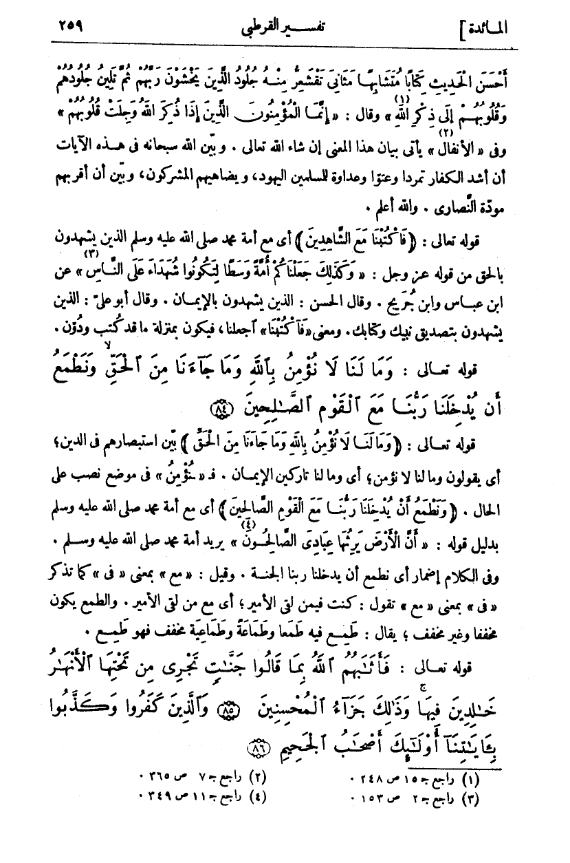 " اللَّهُ نَزَّلَ أَحْسَنَ الْحَدِيثِ كِتاباً مُتَشابِهاً مَثانِيَ تَقْشَعِرُّ مِنْهُ جُلُودُ الَّذِينَ يَخْشَوْنَ رَبَّهُمْ ثُمَّ تَلِينُ جُلُودُهُمْ وَقُلُوبُهُمْ إِلى ذِكْرِ اللَّهِ «١» "] الزمر: ٢٣] وَقَالَ:" إِنَّمَا الْمُؤْمِنُونَ الَّذِينَ إِذا ذُكِرَ اللَّهُ وَجِلَتْ قُلُوبُهُمْ" وَفِي (الْأَنْفَالِ) «٢» يَأْتِي بَيَانُ هَذَا الْمَعْنَى إِنْ شَاءَ اللَّهُ تَعَالَى. وَبَيَّنَ اللَّهُ سُبْحَانَهُ فِي هَذِهِ الْآيَاتِ أَنَّ أَشَدَّ الْكُفَّارِ تَمَرُّدًا وَعُتُوًّا وَعَدَاوَةً لِلْمُسْلِمِينَ الْيَهُودُ، وَيُضَاهِيهُمُ الْمُشْرِكُونَ، وَبَيَّنَ أَنَّ أَقْرَبَهُمْ مَوَدَّةً النَّصَارَى. وَاللَّهُ أَعْلَمُ. قَوْلُهُ تَعَالَى:" فَاكْتُبْنا مَعَ الشَّاهِدِينَ" أَيْ مَعَ أُمَّةِ مُحَمَّدٍ صَلَّى اللَّهُ عَلَيْهِ وَسَلَّمَ الَّذِينَ يَشْهَدُونَ بِالْحَقِّ مِنْ قَوْلُهُ عَزَّ وَجَلَّ:" وَكَذلِكَ جَعَلْناكُمْ أُمَّةً وَسَطاً لِتَكُونُوا شُهَداءَ عَلَى النَّاسِ" «٣»] البقرة: ١٤٣] عَنِ ابْنِ عَبَّاسٍ وَابْنِ جُرَيْجٍ. وَقَالَ الْحَسَنُ: الَّذِينَ يَشْهَدُونَ بِالْإِيمَانِ. وَقَالَ أَبُو عَلِيٍّ: الَّذِينَ يَشْهَدُونَ بِتَصْدِيقِ نَبِيِّكَ وَكِتَابِكَ. وَمَعْنَى" فَاكْتُبْنا" اجْعَلْنَا، فيكون بمنزلة ما قد كتب ودون.