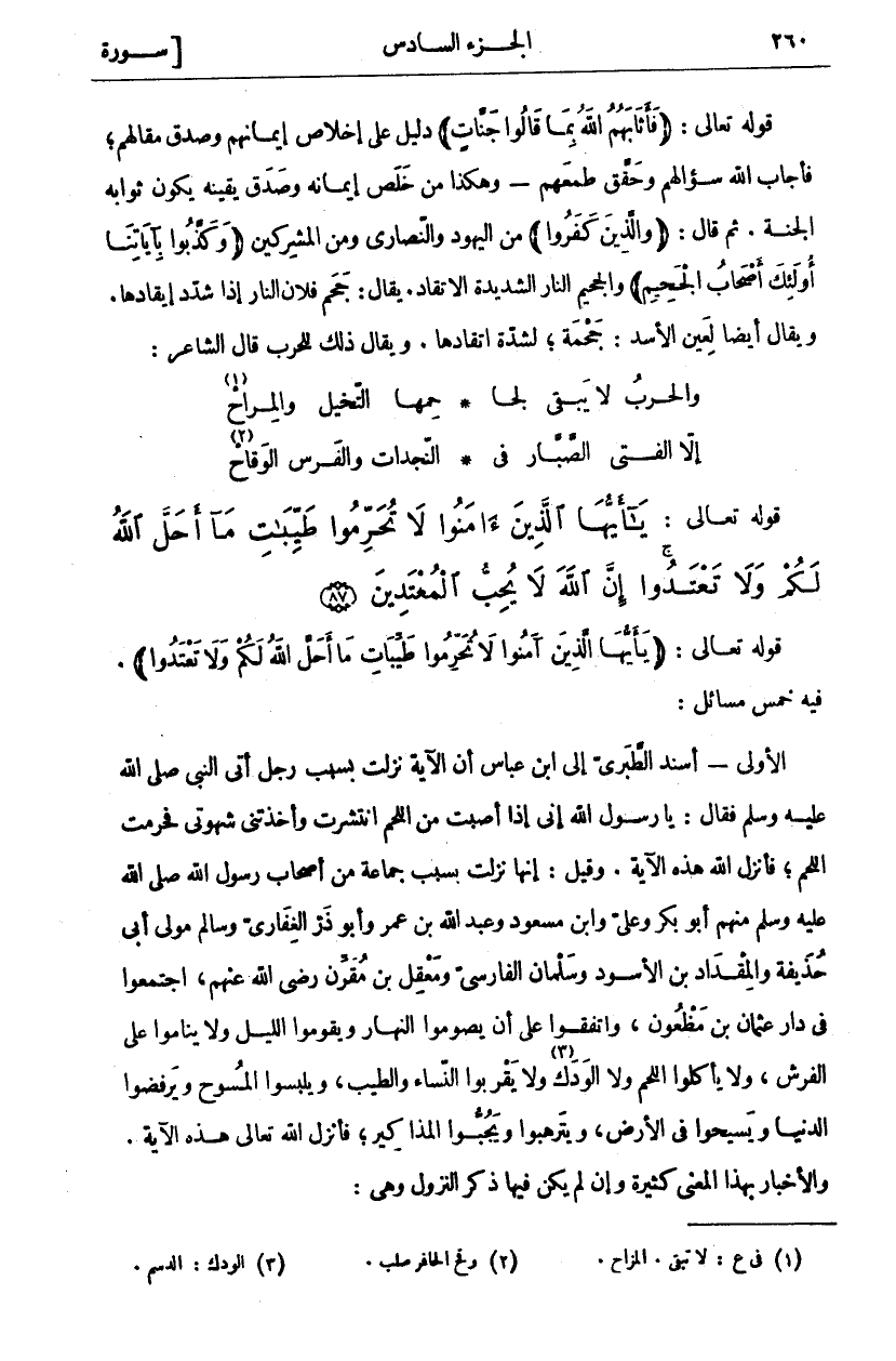 قَوْلُهُ تَعَالَى: (يَا أَيُّهَا الَّذِينَ آمَنُوا لَا تُحَرِّمُوا طَيِّباتِ مَا أَحَلَّ اللَّهُ لَكُمْ وَلا تَعْتَدُوا). فِيهِ خَمْسُ مَسَائِلَ: الْأُولَى- أَسْنَدَ الطَّبَرِيُّ إِلَى ابْنِ عَبَّاسٍ أَنَّ الْآيَةَ نَزَلَتْ بِسَبَبِ رَجُلٍ أَتَى النَّبِيَّ صَلَّى اللَّهُ عَلَيْهِ وَسَلَّمَ فَقَالَ: يَا رَسُولَ اللَّهِ إِنِّي إِذَا أَصَبْتُ مِنَ اللَّحْمِ انْتَشَرْتُ وَأَخَذَتْنِي شَهْوَتِي فَحَرَّمْتُ اللَّحْمَ، فَأَنْزَلَ اللَّهُ هَذِهِ الْآيَةَ. وَقِيلَ: إِنَّهَا نَزَلَتْ بِسَبَبِ جَمَاعَةٍ مِنْ أَصْحَابِ رَسُولِ اللَّهِ صَلَّى اللَّهُ عَلَيْهِ وَسَلَّمَ مِنْهُمْ أَبُو بَكْرٍ وَعَلِيٌّ وَابْنُ مَسْعُودٍ وَعَبْدُ اللَّهِ بْنُ عُمَرَ وَأَبُو ذَرٍّ الْغِفَارِيُّ وَسَالِمٌ مَوْلَى أَبِي حُذَيْفَةَ وَالْمِقْدَادُ بْنُ الْأَسْوَدِ وَسَلْمَانُ الْفَارِسِيُّ وَمَعْقِلُ بْنُ مُقَرِّنٍ رَضِيَ اللَّهُ عَنْهُمْ، اجْتَمَعُوا فِي دَارِ عُثْمَانَ بْنِ مَظْعُونٍ، وَاتَّفَقُوا عَلَى أَنْ يَصُومُوا النَّهَارَ وَيَقُومُوا اللَّيْلَ وَلَا يَنَامُوا عَلَى الْفُرُشِ، وَلَا يَأْكُلُوا اللَّحْمَ وَلَا الْوَدَكَ «٣» وَلَا يَقْرَبُوا النِّسَاءَ وَالطِّيبَ، وَيَلْبَسُوا الْمُسُوحَ وَيَرْفُضُوا الدُّنْيَا وَيَسِيحُوا فِي الْأَرْضِ، وَيَتَرَهَّبُوا وَيَجُبُّوا الْمَذَاكِيرَ، فَأَنْزَلَ اللَّهُ تَعَالَى هَذِهِ الْآيَةَ. وَالْأَخْبَارُ بِهَذَا الْمَعْنَى كَثِيرَةٌ وَإِنْ لَمْ يَكُنْ فِيهَا ذكر النزول وهي: