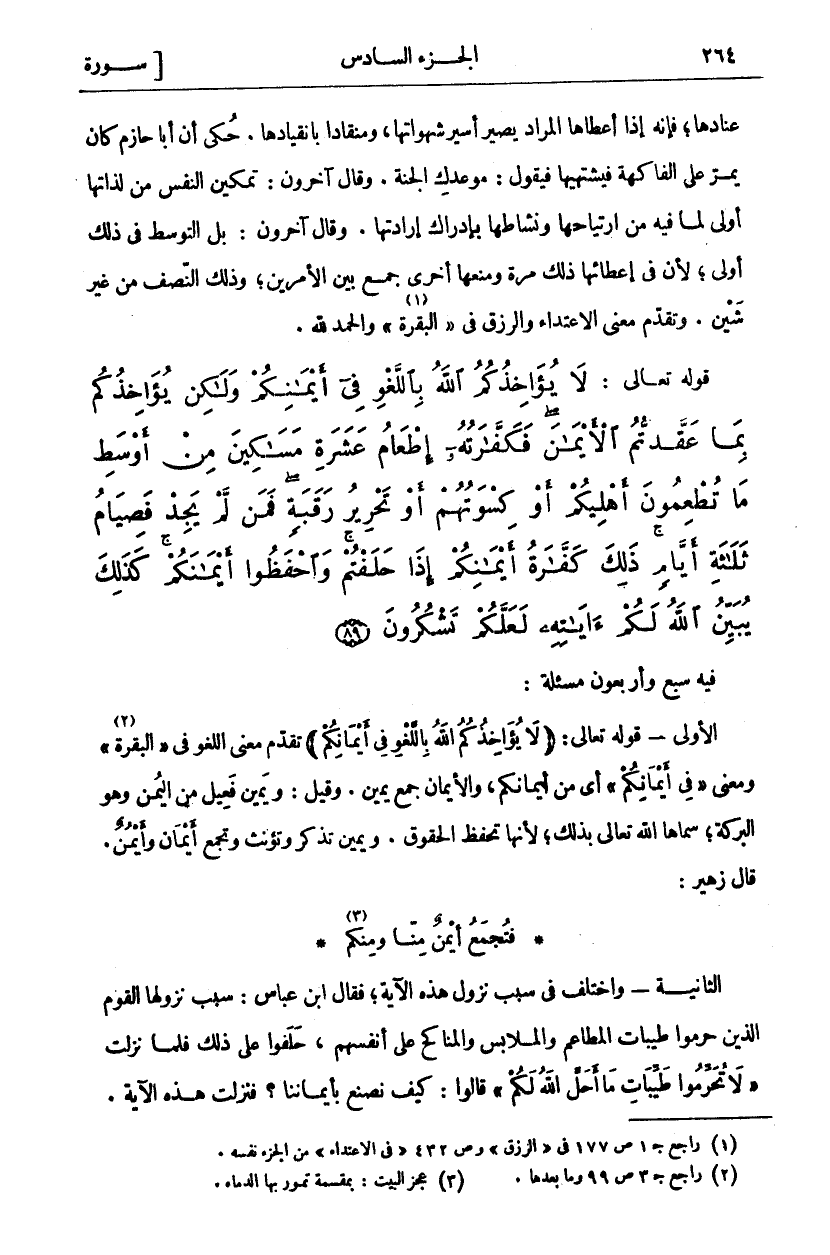 لَا يُؤاخِذُكُمُ اللَّهُ بِاللَّغْوِ فِي أَيْمانِكُمْ وَلكِنْ يُؤاخِذُكُمْ بِما عَقَّدْتُمُ الْأَيْمانَ فَكَفَّارَتُهُ إِطْعامُ عَشَرَةِ مَساكِينَ مِنْ أَوْسَطِ مَا تُطْعِمُونَ أَهْلِيكُمْ أَوْ كِسْوَتُهُمْ أَوْ تَحْرِيرُ رَقَبَةٍ فَمَنْ لَمْ يَجِدْ فَصِيامُ ثَلاثَةِ أَيَّامٍ ذلِكَ كَفَّارَةُ أَيْمانِكُمْ إِذا حَلَفْتُمْ وَاحْفَظُوا أَيْمانَكُمْ كَذلِكَ يُبَيِّنُ اللَّهُ لَكُمْ آياتِهِ لَعَلَّكُمْ تَشْكُرُونَ (٨٩)