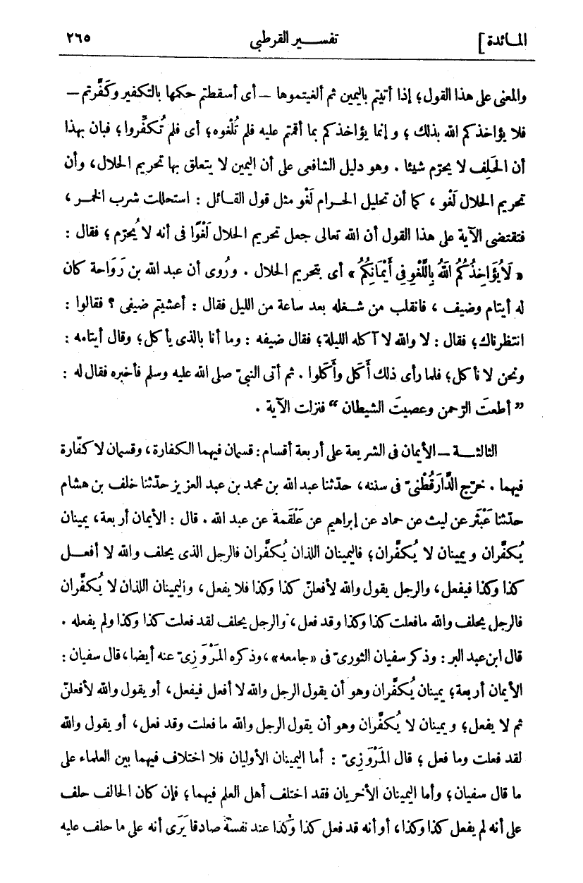 وَالْمَعْنَى عَلَى هَذَا الْقَوْلِ، إِذَا أَتَيْتُمْ؟؟ بِالْيَمِينِ ثُمَّ أَلْغَيْتُمُوهَا- أَيْ أَسْقَطْتُمْ حُكْمَهَا بِالتَّكْفِيرِ وَكَفَّرْتُمْ- فَلَا يُؤَاخِذُكُمُ اللَّهُ بِذَلِكَ، وَإِنَّمَا يُؤَاخِذُكُمْ بِمَا أَقَمْتُمْ عَلَيْهِ فَلَمْ تُلْغُوهُ، أَيْ فَلَمْ تُكَفِّرُوا، فَبَانَ بِهَذَا أَنَّ الْحَلِفَ لَا يُحَرِّمُ شَيْئًا. وَهُوَ دَلِيلُ الشَّافِعِيِّ عَلَى أَنَّ الْيَمِينَ لَا يَتَعَلَّقُ بِهَا تَحْرِيمُ الْحَلَالِ، وَأَنَّ تَحْرِيمَ الْحَلَالِ لَغْوٌ، كَمَا أَنَّ تَحْلِيلَ الْحَرَامِ لَغْوٌ مِثْلَ قَوْلِ الْقَائِلِ: اسْتَحْلَلْتُ شُرْبَ الْخَمْرِ، فَتَقْتَضِي الْآيَةُ عَلَى هَذَا الْقَوْلِ أَنَّ اللَّهَ تَعَالَى جَعَلَ تَحْرِيمَ الْحَلَالِ لَغْوًا فِي أَنَّهُ لَا يَحْرُمُ، فَقَالَ:" لَا يُؤاخِذُكُمُ اللَّهُ بِاللَّغْوِ فِي أَيْمانِكُمْ" أَيْ بِتَحْرِيمِ الْحَلَالِ. وَرُوِيَ أَنَّ عَبْدَ اللَّهِ بْنَ رَوَاحَةَ كَانَ لَهُ أَيْتَامٌ وَضَيْفٌ، فَانْقَلَبَ مِنْ شُغْلِهِ بَعْدَ سَاعَةٍ مِنَ اللَّيْلِ. فَقَالَ: أَعَشَّيْتُمْ ضَيْفِي؟ فَقَالُوا: انْتَظَرْنَاكَ، فَقَالَ: لَا وَاللَّهِ لَا آكُلُهُ اللَّيْلَةَ، فَقَالَ ضَيْفُهُ: وَمَا أَنَا بِالَّذِي يَأْكُلُ، وَقَالَ أَيْتَامُهُ: وَنَحْنُ لَا نَأْكُلُ، فَلَمَّا رَأَى ذَلِكَ أَكَلَ وَأَكَلُوا. ثُمَّ أَتَى النَّبِيَّ صَلَّى اللَّهُ عَلَيْهِ وَسَلَّمَ فَأَخْبَرَهُ فَقَالَ لَهُ:" أَطَعْتَ الرَّحْمَنَ وَعَصَيْتَ الشَّيْطَانَ" فَنَزَلَتِ الْآيَةُ. الثَّالِثَةُ- الْأَيْمَانُ فِي الشَّرِيعَةِ عَلَى أَرْبَعَةِ أَقْسَامٍ: قِسْمَانِ فِيهِمَا الْكَفَّارَةُ، وَقِسْمَانِ لَا كَفَّارَةَ فِيهِمَا. خَرَّجَ الدَّارَقُطْنِيُّ فِي سُنَنِهِ، حَدَّثَنَا عَبْدُ اللَّهِ بْنُ مُحَمَّدِ بْنِ عَبْدِ الْعَزِيزِ حَدَّثَنَا خَلَفُ بْنُ هِشَامٍ حَدَّثَنَا عَبْثَرُ عَنْ لَيْثٍ عَنْ حَمَّادٍ عَنْ إِبْرَاهِيمَ عَنْ عَلْقَمَةَ عَنْ عَبْدِ اللَّهِ، قَالَ: الْأَيْمَانُ أَرْبَعَةٌ، يَمِينَانِ يُكَفَّرَانِ وَيَمِينَانِ لَا يُكَفَّرَانِ، فَالْيَمِينَانِ اللَّذَانِ يُكَفَّرَانِ فَالرَّجُلُ الَّذِي يَحْلِفُ وَاللَّهِ لَا أَفْعَلُ كَذَا وَكَذَا فَيَفْعَلُ، وَالرَّجُلُ يَقُولُ وَاللَّهِ لَأَفْعَلَنَّ كَذَا وَكَذَا فَلَا يَفْعَلُ، وَالْيَمِينَانِ اللَّذَانِ لَا يُكَفَّرَانِ فَالرَّجُلُ يَحْلِفُ وَاللَّهِ مَا فَعَلْتُ كَذَا وَكَذَا وَقَدْ فَعَلَ، وَالرَّجُلُ يَحْلِفُ لَقَدْ فَعَلْتُ كَذَا وَكَذَا وَلَمْ يَفْعَلْهُ. قَالَ ابْنُ عَبْدِ الْبَرِّ: وَذَكَرَ سُفْيَانُ الثَّوْرِيُّ فِي (جَامِعِهِ) وَذَكَرَهُ الْمَرْوَزِيُّ عَنْهُ أَيْضًا، قَالَ سُفْيَانُ: الْأَيْمَانُ أَرْبَعَةٌ، يَمِينَانِ يُكَفَّرَانِ وَهُوَ أَنْ يَقُولَ الرَّجُلُ وَاللَّهِ لَا أَفْعَلُ فَيَفْعَلُ، أَوْ يَقُولُ وَاللَّهِ لَأَفْعَلَنَّ ثُمَّ لَا يَفْعَلُ، وَيَمِينَانِ لَا يُكَفَّرَانِ وَهُوَ أَنْ يَقُولَ الرَّجُلُ وَاللَّهِ مَا فَعَلْتُ وَقَدْ فَعَلَ، أَوْ يَقُولُ وَاللَّهِ لَقَدْ فَعَلْتُ وَمَا فَعَلَ، قَالَ الْمَرْوَزِيُّ: أَمَّا الْيَمِينَانِ الْأُولَيَانِ فَلَا اخْتِلَافَ فِيهِمَا بَيْنَ الْعُلَمَاءِ عَلَى مَا قَالَ سُفْيَانُ، وَأَمَّا الْيَمِينَانِ الْأُخْرَيَانِ فَقَدِ اخْتَلَفَ أَهْلُ الْعِلْمِ فِيهِمَا، فَإِنْ كَانَ الْحَالِفُ حَلَفَ عَلَى أَنَّهُ لَمْ يَفْعَلْ كَذَا وَكَذَا، أَوْ أَنَّهُ قَدْ فَعَلَ كَذَا وَكَذَا عِنْدَ نَفْسِهِ صَادِقًا يَرَى أَنَّهُ عَلَى مَا حَلَفَ عَلَيْهِ