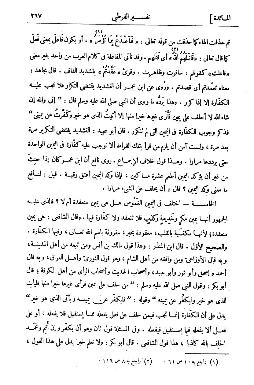ثُمَّ حُذِفَتِ الْهَاءُ كَمَا حُذِفَتْ مِنْ قَوْلِهِ تعالى:" فَاصْدَعْ بِما تُؤْمَرُ «١» "] الحجر: ٩٤]. أَوْ يَكُونُ فَاعَلَ بِمَعْنَى فَعَلَ كَمَا قَالَ تعالى:" قاتَلَهُمُ اللَّهُ" «٢»] التوبة: ٣٠] أَيْ قَتَلَهُمْ. وَقَدْ تَأْتِي الْمُفَاعَلَةُ فِي كَلَامِ الْعَرَبِ مِنْ وَاحِدٍ بِغَيْرِ مَعْنَى (فَاعَلْتُ) كَقَوْلِهِمْ: سافرت وظاهرت. وقرى عَقَّدْتُمْ" بِتَشْدِيدِ الْقَافِ. قَالَ مُجَاهِدٌ: مَعْنَاهُ تَعَمَّدْتُمْ أَيْ قَصَدْتُمْ. وَرُوِيَ عَنِ ابْنِ عُمَرَ أَنَّ التَّشْدِيدَ يَقْتَضِي التَّكْرَارَ فَلَا تَجِبُ عَلَيْهِ الْكَفَّارَةُ إِلَّا إِذَا كُرِّرَ. وَهَذَا يَرُدُّهُ مَا رُوِيَ أَنَّ النَّبِيَّ صَلَّى اللَّهُ عَلَيْهِ وَسَلَّمَ قال:] إِنِّي وَاللَّهِ إِنْ شَاءَ اللَّهُ لَا أَحْلِفُ عَلَى يَمِينٍ فَأَرَى غَيْرَهَا خَيْرًا مِنْهَا إِلَّا أَتَيْتُ الَّذِي هُوَ خَيْرٌ وَكَفَّرْتُ عَنْ يَمِينِي [فَذَكَرَ وُجُوبَ الْكَفَّارَةِ فِي الْيَمِينِ الَّتِي لَمْ تَتَكَرَّرْ. قَالَ أَبُو عُبَيْدٍ: التَّشْدِيدُ يَقْتَضِي التَّكْرِيرَ مَرَّةً بَعْدَ مَرَّةٍ، وَلَسْتُ آمَنَ أَنْ يَلْزَمَ مَنْ قَرَأَ بِتِلْكَ الْقِرَاءَةِ أَلَّا تُوجَبَ عَلَيْهِ كَفَّارَةٌ فِي الْيَمِينِ الْوَاحِدَةِ حَتَّى يُرَدِّدَهَا مِرَارًا. وهذا قول خلاف الإجماع. روى نَافِعٌ أَنَّ ابْنَ عُمَرَ كَانَ إِذَا حَنِثَ مِنْ غَيْرِ أَنْ يُؤَكِّدَ الْيَمِينَ أَطْعَمَ عَشَرَةَ مَسَاكِينَ، فَإِذَا وَكَّدَ الْيَمِينَ أَعْتَقَ رَقَبَةً. قِيلَ: لِنَافِعٍ مَا مَعْنَى وَكَّدَ الْيَمِينَ؟ قَالَ: أَنْ يَحْلِفَ عَلَى الشَّيْءِ مِرَارًا. الْخَامِسَةُ- اخْتُلِفَ فِي الْيَمِينِ الْغَمُوسِ هَلْ هِيَ يَمِينٌ مُنْعَقِدَةٌ أَمْ لَا؟ فَالَّذِي عَلَيْهِ الْجُمْهُورُ أَنَّهَا يَمِينُ مَكْرٍ وَخَدِيعَةٍ وَكَذِبٍ فَلَا تَنْعَقِدُ وَلَا كَفَّارَةَ فِيهَا. وَقَالَ الشَّافِعِيُّ: هِيَ يَمِينٌ مُنْعَقِدَةٌ، لِأَنَّهَا مُكْتَسَبَةٌ بِالْقَلْبِ، مَعْقُودَةٌ بِخَبَرٍ، مَقْرُونَةٌ بِاسْمِ اللَّهِ تَعَالَى، وَفِيهَا الْكَفَّارَةُ. وَالصَّحِيحُ الْأَوَّلُ. قَالَ ابْنُ الْمُنْذِرِ: وَهَذَا قَوْلُ مَالِكِ بْنِ أَنَسٍ وَمَنْ تَبِعَهُ مِنْ أَهْلِ الْمَدِينَةِ، وَبِهِ قَالَ الْأَوْزَاعِيُّ وَمَنْ وَافَقَهُ مِنْ أَهْلِ الشَّامِ، وَهُوَ قَوْلُ الثَّوْرِيِّ وَأَهْلِ الْعِرَاقِ، وَبِهِ قَالَ أَحْمَدُ وَإِسْحَاقُ وَأَبُو ثَوْرٍ وَأَبُو عُبَيْدٍ، وَأَصْحَابُ الْحَدِيثِ وَأَصْحَابُ الرَّأْيِ مِنْ أَهْلِ الْكُوفَةِ، قَالَ أَبُو بَكْرٍ: وَقَوْلُ النبي صَلَّى اللَّهُ عَلَيْهِ وَسَلَّمَ:" مَنْ حَلَفَ عَلَى يَمِينٍ فَرَأَى غَيْرَهَا خَيْرًا مِنْهَا فَلْيَأْتِ الَّذِي هُوَ خَيْرٌ وَلْيُكَفِّرْ عَنْ يَمِينِهِ" وَقَوْلُهُ:" فَلْيُكَفِّرْ عَنْ يَمِينِهِ وَيَأْتِي الَّذِي هُوَ خَيْرٌ" يَدُلُّ عَلَى أَنَّ الْكَفَّارَةَ إِنَّمَا تَجِبُ فِيمَنْ حَلَفَ عَلَى فِعْلٍ يَفْعَلُهُ مِمَّا يُسْتَقْبَلُ فَلَا يَفْعَلُهُ، أَوْ عَلَى فِعْلٍ أَلَّا يَفْعَلَهُ فِيمَا يُسْتَقْبَلُ فَيَفْعَلُهُ. وَفِي الْمَسْأَلَةِ قَوْلٌ ثَانٍ وَهُوَ أَنْ يُكَفِّرَ وَإِنْ أَثِمَ وَعَمَدَ الْحَلِفَ بِاللَّهِ كَاذِبًا، هَذَا قَوْلُ الشَّافِعِيِّ. قَالَ أَبُو بَكْرٍ: وَلَا نَعْلَمُ خَبَرًا يَدُلُّ عَلَى هَذَا الْقَوْلِ،