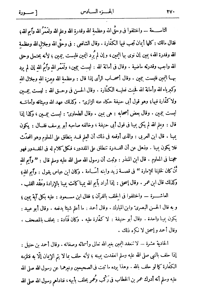 التَّاسِعَةُ- وَاخْتَلَفُوا فِي وَحَقِّ اللَّهِ وَعَظَمَةِ اللَّهِ وَقُدْرَةِ اللَّهِ وَعِلْمِ اللَّهِ وَلَعَمْرِ اللَّهِ وَايْمِ اللَّهِ، فَقَالَ مَالِكٌ: كُلُّهَا أَيْمَانٌ تَجِبُ فِيهَا الْكَفَّارَةُ. وَقَالَ الشَّافِعِيُّ: فِي وَحَقِّ اللَّهِ وَجَلَالِ اللَّهِ وَعَظَمَةِ اللَّهِ وَقُدْرَةِ اللَّهِ، يَمِينٌ إِنْ نَوَى بِهَا الْيَمِينَ، وَإِنْ لَمْ يُرِدِ الْيَمِينَ فَلَيْسَتْ بِيَمِينٍ، لِأَنَّهُ يَحْتَمِلُ وَحَقُّ اللَّهِ وَاجِبٌ وَقُدْرَتُهُ مَاضِيَةٌ. وَقَالَ فِي أَمَانَةِ اللَّهِ: لَيْسَتْ بِيَمِينٍ، وَلَعَمْرِ اللَّهِ وَايْمِ اللَّهِ إِنْ لَمْ يُرِدْ بِهَا الْيَمِينَ فَلَيْسَتْ بِيَمِينٍ. وَقَالَ أَصْحَابُ الرَّأْيِ إِذَا قَالَ: وَعَظَمَةِ اللَّهِ وَعِزَّةِ اللَّهِ وَجَلَالِ اللَّهِ وَكِبْرِيَاءِ اللَّهِ وَأَمَانَةِ اللَّهِ فَحَنِثَ فَعَلَيْهِ الْكَفَّارَةُ. وَقَالَ الْحَسَنُ فِي وَحَقِّ اللَّهِ: لَيْسَتْ بِيَمِينٍ وَلَا كَفَّارَةَ فِيهَا، وَهُوَ قَوْلُ أَبِي حَنِيفَةَ حَكَاهُ عَنْهُ الرَّازِيُّ. وَكَذَلِكَ عَهْدُ اللَّهِ وَمِيثَاقُهُ وَأَمَانَتُهُ لَيْسَتْ بِيَمِينٍ. وَقَالَ بَعْضُ أَصْحَابِهِ: هِيَ يَمِينٌ. وَقَالَ الطَّحَاوِيُّ: لَيْسَتْ بِيَمِينٍ، وَكَذَا إِذَا قَالَ: وَعِلْمُ اللَّهِ لَمْ يَكُنْ يَمِينًا فِي قَوْلِ أَبِي حَنِيفَةَ، وَخَالَفَهُ صَاحِبُهُ أَبُو يُوسُفَ فَقَالَ: يَكُونُ يَمِينًا. قَالَ ابْنُ الْعَرَبِيِّ: وَالَّذِي أَوْقَعَهُ فِي ذَلِكَ أَنَّ الْعِلْمَ قَدْ يَنْطَلِقُ عَلَى الْمَعْلُومِ وَهُوَ الْمُحْدَثُ فَلَا يَكُونُ يَمِينًا. وَذَهِلَ عَنْ أَنَّ الْقُدْرَةَ تَنْطَلِقُ عَلَى الْمَقْدُورِ، فَكُلُّ كَلَامٍ لَهُ فِي الْمَقْدُورِ فَهُوَ حُجَّتُنَا فِي الْمَعْلُومِ. قَالَ ابْنُ الْمُنْذِرِ: وَثَبَتَ أَنَّ رَسُولَ اللَّهِ صَلَّى اللَّهُ عَلَيْهِ وَسَلَّمَ قَالَ:] وَايْمِ اللَّهِ إِنْ كَانَ لَخَلِيقًا لِلْإِمَارَةِ [فِي قِصَّةِ زَيْدٍ وَابْنِهِ أُسَامَةَ. وَكَانَ ابْنُ عَبَّاسٍ يَقُولُ: وَايْمِ اللَّهِ، وَكَذَلِكَ قَالَ ابْنُ عُمَرَ. وَقَالَ إِسْحَاقُ: إِذَا أَرَادَ بِايْمِ اللَّهِ يَمِينًا كَانَتْ يَمِينًا بِالْإِرَادَةِ وَعَقْدِ الْقَلْبِ. الْعَاشِرَةُ- وَاخْتَلَفُوا فِي الْحَلِفِ بِالْقُرْآنِ، فَقَالَ ابْنُ مَسْعُودٍ: عَلَيْهِ بِكُلِّ آيَةٍ يَمِينٌ، وَبِهِ قَالَ الْحَسَنُ الْبَصْرِيُّ وَابْنُ الْمُبَارَكِ. وَقَالَ أَحْمَدُ: مَا أَعْلَمُ شَيْئًا يَدْفَعُهُ. وَقَالَ أَبُو عُبَيْدٍ: يَكُونُ يَمِينًا وَاحِدَةً. وَقَالَ أَبُو حَنِيفَةَ: لَا كَفَّارَةَ عَلَيْهِ. وَكَانَ قَتَادَةُ يَحْلِفُ بِالْمُصْحَفِ. وَقَالَ أَحْمَدُ وَإِسْحَاقُ لَا نَكْرَهُ ذَلِكَ. الْحَادِيَةَ عَشْرَةَ- لَا تَنْعَقِدُ الْيَمِينُ بِغَيْرِ اللَّهِ تَعَالَى وَأَسْمَائِهِ وَصِفَاتِهِ. وَقَالَ أَحْمَدُ بْنُ حَنْبَلٍ: إِذَا حَلَفَ بِالنَّبِيِّ صَلَّى اللَّهُ عَلَيْهِ وَسَلَّمَ انْعَقَدَتْ يَمِينُهُ، لِأَنَّهُ حَلَفَ بِمَا لَا يَتِمُّ الْإِيمَانُ إِلَّا بِهِ فَتَلْزَمُهُ الْكَفَّارَةُ كَمَا لَوْ حَلَفَ بِاللَّهِ. وَهَذَا يَرُدُّهُ مَا ثَبَتَ فِي الصَّحِيحَيْنِ وَغَيْرِهِمَا عَنْ رَسُولِ اللَّهِ صَلَّى اللَّهُ عَلَيْهِ وَسَلَّمَ أنه أَدْرَكَ عُمَرَ بْنَ الْخَطَّابِ فِي رَكْبٍ وَعُمَرُ يَحْلِفُ بِأَبِيهِ، فَنَادَاهُمْ رَسُولُ اللَّهِ صَلَّى اللَّهُ