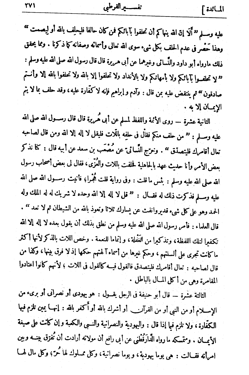 عَلَيْهِ وَسَلَّمَ:] أَلَا إِنَّ اللَّهَ يَنْهَاكُمْ أَنْ تَحْلِفُوا بِآبَائِكُمْ فَمَنْ كَانَ حَالِفًا فَلْيَحْلِفْ بِاللَّهِ أَوْ لِيَصْمُتْ [وَهَذَا حَصْرٌ فِي عَدَمِ الْحَلِفِ بكل شي سِوَى اللَّهِ تَعَالَى وَأَسْمَائِهِ وَصِفَاتِهِ كَمَا ذَكَرْنَا. وَمِمَّا يُحَقِّقُ ذَلِكَ مَا رَوَاهُ أَبُو دَاوُدَ وَالنَّسَائِيُّ وَغَيْرُهُمَا عَنْ أَبِي هُرَيْرَةَ قَالَ قَالَ رَسُولُ اللَّهِ صَلَّى اللَّهُ عَلَيْهِ وَسَلَّمَ:] لَا تَحْلِفُوا بِآبَائِكُمْ وَلَا بِأُمَّهَاتِكُمْ وَلَا بِالْأَنْدَادِ وَلَا تحلفوا إلا بالله وَلَا تَحْلِفُوا بِاللَّهِ إِلَّا وَأَنْتُمْ صَادِقُونَ [ثُمَّ يُنْتَقَضُ عَلَيْهِ بِمَنْ قَالَ: وَآدَمُ وَإِبْرَاهِيمُ فَإِنَّهُ لَا كَفَّارَةَ عَلَيْهِ، وَقَدْ حَلَفَ بِمَا لَا يَتِمُّ الْإِيمَانُ إِلَّا بِهِ. الثَّانِيَةَ عَشْرَةَ- رَوَى الْأَئِمَّةُ وَاللَّفْظُ لِمُسْلِمٍ عَنْ أَبِي هُرَيْرَةَ قَالَ قَالَ رَسُولُ اللَّهِ صَلَّى اللَّهُ عَلَيْهِ وَسَلَّمَ:] مَنْ حَلَفَ مِنْكُمْ فَقَالَ فِي حَلِفِهِ بِاللَّاتِ فَلْيَقُلْ لَا إِلَهَ إِلَّا اللَّهُ وَمَنْ قَالَ لِصَاحِبِهِ تَعَالَ أُقَامِرُكَ فَلْيَتَصَدَّقْ [. وَخَرَّجَ النَّسَائِيُّ عَنْ مُصْعَبِ بْنِ سَعْدٍ عَنْ أَبِيهِ قَالَ: كُنَّا نَذْكُرُ بَعْضَ الْأَمْرِ وَأَنَا حَدِيثُ عَهْدٍ بِالْجَاهِلِيَّةِ فَحَلَفْتُ بِاللَّاتِ وَالْعُزَّى، فَقَالَ لِي بَعْضُ أَصْحَابِ رَسُولِ اللَّهِ صَلَّى اللَّهُ عَلَيْهِ وَسَلَّمَ: بِئْسَ مَا قُلْتَ: وَفِي رِوَايَةٍ قُلْتُ هُجْرًا، فَأَتَيْتُ رَسُولَ اللَّهِ صَلَّى اللَّهُ عَلَيْهِ وَسَلَّمَ فَذَكَرْتُ ذَلِكَ لَهُ فَقَالَ:] قُلْ لَا إِلَهَ إِلَّا اللَّهُ وَحْدَهُ لَا شَرِيكَ لَهُ لَهُ الْمُلْكُ وَلَهُ الْحَمْدُ وَهُوَ عَلَى كل شي قَدِيرٍ وَانْفُثْ عَنْ يَسَارِكَ ثَلَاثًا وَتَعَوَّذْ بِاللَّهِ مِنَ الشَّيْطَانِ ثُمَّ لَا تَعُدْ [. قَالَ الْعُلَمَاءُ: فَأَمَرَ رَسُولُ اللَّهِ صَلَّى اللَّهُ عَلَيْهِ وَسَلَّمَ مَنْ نَطَقَ بِذَلِكَ أَنْ يَقُولَ بَعْدَهُ لَا إِلَهَ إِلَّا اللَّهُ تَكْفِيرًا لِتِلْكَ اللَّفْظَةِ، وَتَذْكِيرًا مِنَ الْغَفْلَةِ، وَإِتْمَامًا لِلنِّعْمَةِ. وَخَصَّ اللَّاتَ بِالذِّكْرِ لِأَنَّهَا أَكْثَرُ مَا كَانَتْ تَجْرِي عَلَى أَلْسِنَتِهِمْ، وَحُكْمُ غَيْرِهَا مِنْ أَسْمَاءِ آلِهَتِهِمْ حُكْمُهَا إِذْ لَا فَرْقَ بَيْنَهَا، وَكَذَا مَنْ قَالَ لِصَاحِبِهِ: تَعَالَ أُقَامِرُكَ فَلْيَتَصَدَّقْ فَالْقَوْلُ فِيهِ كَالْقَوْلِ فِي اللَّاتِ، لِأَنَّهُمْ كَانُوا اعْتَادُوا الْمُقَامَرَةَ وَهِيَ مِنْ أَكْلِ الْمَالِ بِالْبَاطِلِ. الثَّالِثَةَ عَشْرَةَ- قَالَ أَبُو حَنِيفَةَ فِي الرَّجُلِ يَقُولُ: هُوَ يَهُودِيٌّ أَوْ