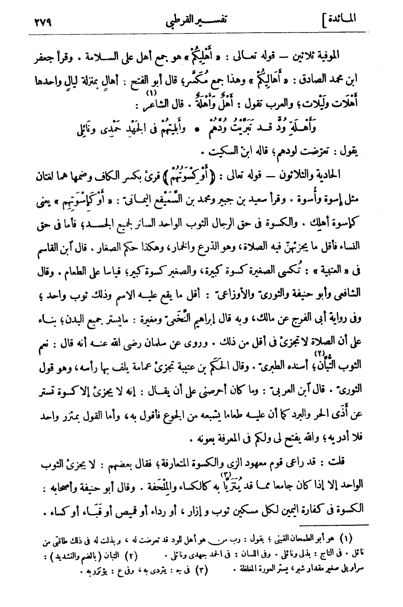 يَقُولُ: تَعَرَّضْتُ لِوُدِّهِمْ، قَالَهُ ابْنُ السِّكِّيتِ. الْحَادِيَةُ وَالثَّلَاثُونَ- قَوْلُهُ تَعَالَى: (أَوْ كِسْوَتُهُمْ) قُرِئَ بِكَسْرِ الْكَافِ وَضَمِّهَا هُمَا لُغَتَانِ مِثْلُ إِسْوَةٍ وَأُسْوَةٍ. وَقَرَأَ سَعِيدُ بْنُ جُبَيْرٍ وَمُحَمَّدُ بْنُ السَّمَيْقَعِ الْيَمَانِيُّ: (أَوْ كَإِسْوَتِهِمْ) يَعْنِي كَإِسْوَةِ أَهْلِكَ. وَالْكِسْوَةُ فِي حَقِّ الرِّجَالِ الثَّوْبُ الْوَاحِدُ السَّاتِرُ لِجَمِيعِ الْجَسَدِ، فَأَمَّا فِي حَقِّ النِّسَاءِ فَأَقَلُّ مَا يُجْزِئُهُنَّ فِيهِ الصَّلَاةُ، وَهُوَ الدِّرْعُ وَالْخِمَارُ، وَهَكَذَا حُكْمُ الصِّغَارِ. قَالَ ابْنُ الْقَاسِمِ فِي (الْعُتْبِيَّةِ): تُكْسَى الصَّغِيرَةُ كِسْوَةَ كَبِيرَةٍ، وَالصَّغِيرُ كِسْوَةَ كَبِيرٍ، قِيَاسًا عَلَى الطَّعَامِ. وَقَالَ الشَّافِعِيُّ وَأَبُو حَنِيفَةَ وَالثَّوْرِيُّ وَالْأَوْزَاعِيُّ: أَقَلُّ مَا يَقَعُ عَلَيْهِ الِاسْمُ وَذَلِكَ ثَوْبٌ وَاحِدٌ، وَفِي رِوَايَةِ أَبِي الْفَرَجِ عَنْ مَالِكٍ، وَبِهِ قَالَ إِبْرَاهِيمُ النَّخَعِيُّ وَمُغِيرَةُ: مَا يَسْتُرُ جَمِيعَ الْبَدَنِ، بِنَاءً عَلَى أَنَّ الصَّلَاةَ لَا تُجْزِئُ فِي أَقَلِّ مِنْ ذَلِكَ. وَرُوِيَ عَنْ سَلْمَانَ رَضِيَ اللَّهُ عَنْهُ أَنَّهُ قَالَ: نِعْمَ الثَّوْبُ التُّبَّانَ «٢»، أَسْنَدَهُ الطَّبَرِيُّ. وَقَالَ الْحَكَمُ بْنُ عُتَيْبَةَ تُجْزِئُ عِمَامَةٌ يَلُفُّ بِهَا رَأْسَهُ، وَهُوَ قَوْلُ الثَّوْرِيِّ. قَالَ ابْنُ الْعَرَبِيِّ: وَمَا كَانَ أَحْرَصَنِي عَلَى أَنْ يُقَالَ: إِنَّهُ لَا يُجْزِئُ إِلَّا كِسْوَةٌ تَسْتُرُ عَنْ أَذَى الْحَرِّ وَالْبَرْدِ كَمَا أَنَّ عليه طعاما يشبعه من الجوع فَأَقُولُ بِهِ، وَأَمَّا الْقَوْلُ بِمِئْزَرٍ وَاحِدٍ فَلَا أَدْرِيهِ، وَاللَّهُ يَفْتَحُ لِي وَلَكُمْ فِي الْمَعْرِفَةِ بِعَوْنِهِ. قُلْتُ: قَدْ رَاعَى قَوْمٌ مَعْهُودَ الزِّيِّ وَالْكِسْوَةِ الْمُتَعَارَفَةِ، فَقَالَ بَعْضُهُمْ: لَا يُجْزِئُ الثَّوْبُ الْوَاحِدُ إِلَّا إِذَا كَانَ جَامِعًا مِمَّا قَدْ يُتَزَيَّا «٣» بِهِ كَالْكِسَاءِ وَالْمِلْحَفَةِ. وَقَالَ أَبُو حَنِيفَةَ وَأَصْحَابُهُ: الْكِسْوَةُ فِي كَفَّارَةِ الْيَمِينِ لِكُلِّ مِسْكِينٍ ثَوْبٌ وَإِزَارٌ، أَوْ رِدَاءٌ أَوْ قَمِيصٌ أَوْ قباء أو كساء.