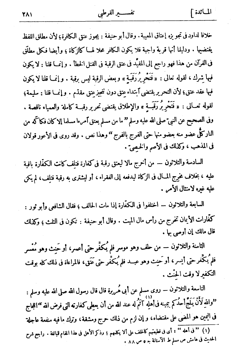 خِلَافًا لِدَاوُدَ فِي تَجْوِيزِهِ إِعْتَاقَ الْمَعِيبَةِ. وَقَالَ أَبُو حَنِيفَةَ: يَجُوزُ عِتْقُ الْكَافِرَةِ، لِأَنَّ مُطْلَقَ اللَّفْظِ يَقْتَضِيهَا. وَدَلِيلُنَا أَنَّهَا قُرْبَةٌ وَاجِبَةٌ فَلَا يَكُونُ الْكَافِرُ مَحَلًّا لَهَا كَالزَّكَاةِ، وَأَيْضًا فَكُلُّ مُطْلَقٍ فِي الْقُرْآنِ مِنْ هَذَا فَهُوَ رَاجِعٌ إِلَى الْمُقَيَّدِ فِي عِتْقِ الرَّقَبَةِ فِي الْقَتْلِ الْخَطَأِ. وَإِنَّمَا قُلْنَا: لَا يَكُونُ فِيهَا شِرْكٌ، لقوله تعالى:" فَتَحْرِيرُ رَقَبَةٍ"] النساء: ٩٢] وَبَعْضُ الرَّقَبَةِ لَيْسَ بِرَقَبَةٍ. وَإِنَّمَا قُلْنَا لَا يَكُونُ فِيهَا عَقْدُ عِتْقٍ، لِأَنَّ التَّحْرِيرَ يَقْتَضِي ابْتِدَاءَ عِتْقٍ دُونَ تَنْجِيزِ عِتْقٍ مُقَدَّمٍ. وَإِنَّمَا قُلْنَا: سَلِيمَةً، لِقَوْلِهِ تَعَالَى:" فَتَحْرِيرُ رَقَبَةٍ" وَالْإِطْلَاقُ يَقْتَضِي تَحْرِيرَ رَقَبَةٍ كَامِلَةٍ وَالْعَمْيَاءُ نَاقِصَةٌ. وَفِي الصَّحِيحِ عَنِ النَّبِيِّ صَلَّى اللَّهُ عَلَيْهِ وَسَلَّمَ] مَا مِنْ مُسْلِمٍ يَعْتِقُ امْرَأً مُسْلِمًا إِلَّا كَانَ فِكَاكُهُ مِنَ النَّارِ كُلُّ عُضْوٍ مِنْهُ بِعُضْوٍ مِنْهَا حَتَّى الْفَرْجَ بِالْفَرْجِ [وَهَذَا نَصٌّ. وَقَدْ رُوِيَ فِي الْأَعْوَرِ قَوْلَانِ فِي الْمَذْهَبِ، كذلك في الأصم والخصي. السادسة والثلاثون- من أخرج مَالًا لِيُعْتِقَ رَقَبَةً فِي كَفَّارَةٍ فَتَلِفَ كَانَتِ الْكَفَّارَةُ بَاقِيَةً عَلَيْهِ، بِخِلَافِ مُخْرِجِ الْمَالِ فِي الزَّكَاةِ لِيَدْفَعَهُ إِلَى الْفُقَرَاءِ، أَوْ لِيَشْتَرِيَ بِهِ رَقَبَةً فَتَلِفَ، لَمْ يَكُنْ عَلَيْهِ غَيْرُهُ لِامْتِثَالِ الْأَمْرِ. السَّابِعَةُ وَالثَّلَاثُونَ- اخْتَلَفُوا فِي الْكَفَّارَةِ إِذَا مَاتَ الْحَالِفُ، فَقَالَ الشَّافِعِيُّ وَأَبُو ثَوْرٍ: كَفَّارَاتُ الْأَيْمَانِ تُخْرَجُ مِنْ رَأْسِ مَالِ الْمَيِّتِ. وَقَالَ أَبُو حَنِيفَةَ: تَكُونُ فِي الثُّلُثِ، وَكَذَلِكَ قَالَ مَالِكٌ إِنْ أَوْصَى بِهَا. الثَّامِنَةُ وَالثَّلَاثُونَ- مَنْ حَلَفَ وَهُوَ مُوسِرٌ فَلَمْ يُكَفِّرْ حَتَّى أَعْسَرَ، أَوْ حَنِثَ وَهُوَ مُعْسِرٌ فَلَمْ يُكَفِّرْ حَتَّى أَيْسَرَ، أَوْ حَنِثَ وَهُوَ عَبْدٌ فَلَمْ يُكَفِّرْ حَتَّى عُتِقَ، فَالْمُرَاعَاةُ فِي ذَلِكَ كُلِّهِ بِوَقْتِ التَّكْفِيرِ لَا وَقْتِ الْحِنْثِ. التَّاسِعَةُ وَالثَّلَاثُونَ- رَوَى مُسْلِمٌ عَنْ أَبِي هُرَيْرَةَ قَالَ قَالَ رَسُولُ اللَّهِ صَلَّى اللَّهُ عَلَيْهِ وَسَلَّمَ: (وَاللَّهِ لَأَنْ يَلَجَّ أَحَدُكُمْ بِيَمِينِهِ فِي أَهْلِهِ «١» آثَمُ لَهُ عِنْدَ اللَّهِ مِنْ أَنْ يُعْطِيَ كَفَّارَتَهُ الَّتِي فَرَضَ اللَّهُ) اللِّجَاجُ فِي الْيَمِينِ هُوَ الْمُضِيُّ عَلَى مُقْتَضَاهُ، وَإِنْ لَزِمَ مِنْ ذَلِكَ حَرَجٌ ومشقة، وترك ما فيه منفعة عاجلة