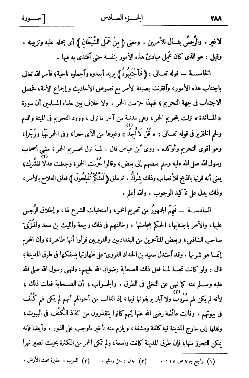 لَا غَيْرَ. وَالرِّجْسُ يُقَالُ لِلْأَمْرَيْنِ. وَمَعْنَى" مِنْ عَمَلِ الشَّيْطانِ" أَيْ بِحَمْلِهِ عَلَيْهِ وَتَزْيِينِهِ. وَقِيلَ: هُوَ الَّذِي كَانَ عَمِلَ مَبَادِئَ هَذِهِ الْأُمُورِ بِنَفْسِهِ حَتَّى اقْتُدِيَ بِهِ فِيهَا. الْخَامِسَةُ- قَوْلُهُ تَعَالَى:" فَاجْتَنِبُوهُ" يُرِيدُ أَبْعِدُوهُ وَاجْعَلُوهُ نَاحِيَةً، فَأَمَرَ اللَّهُ تَعَالَى بِاجْتِنَابِ هَذِهِ الْأُمُورِ، وَاقْتَرَنَتْ بِصِيغَةِ الْأَمْرِ مَعَ نُصُوصِ الْأَحَادِيثِ وَإِجْمَاعِ الْأُمَّةِ، فَحَصَلَ الِاجْتِنَابُ فِي جِهَةِ التَّحْرِيمِ، فَبِهَذَا حُرِّمَتِ الْخَمْرُ. وَلَا خِلَافَ بَيْنَ عُلَمَاءِ الْمُسْلِمِينَ أَنَّ سُورَةَ" الْمَائِدَةِ" نَزَلَتْ بِتَحْرِيمِ الْخَمْرِ، وَهِيَ مَدَنِيَّةٌ مِنْ آخِرِ مَا نَزَلَ، وَوَرَدَ التَّحْرِيمُ فِي الْمَيْتَةِ وَالدَّمِ وَلَحْمِ الْخِنْزِيرِ فِي قَوْلِهِ تَعَالَى:" قُلْ لَا أَجِدُ" «١» وَغَيْرِهَا مِنَ الْآيِ خَبَرًا، وَفِي الْخَمْرِ نَهْيًا وَزَجْرًا، وَهُوَ أَقْوَى التَّحْرِيمِ وَأَوْكَدُهُ. رَوَى ابْنُ عَبَّاسٍ قَالَ: لَمَّا نَزَلَ تَحْرِيمُ الْخَمْرِ، مَشَى أَصْحَابُ رَسُولِ اللَّهِ صَلَّى اللَّهُ عَلَيْهِ وَسَلَّمَ بَعْضُهُمْ إِلَى بَعْضٍ، وَقَالُوا حُرِّمَتِ الْخَمْرُ، وَجُعِلَتْ عِدْلًا «٢» لِلشِّرْكِ، يَعْنِي أَنَّهُ قَرَنَهَا بِالذَّبْحِ لِلْأَنْصَابِ وَذَلِكَ شِرْكٌ. ثُمَّ عَلَّقَ" لَعَلَّكُمْ تُفْلِحُونَ" فَعَلَّقَ الْفَلَاحَ بِالْأَمْرِ، وَذَلِكَ يَدُلُّ عَلَى تَأْكِيدِ الْوُجُوبِ. وَاللَّهُ أَعْلَمُ. السَّادِسَةُ- فَهِمَ الْجُمْهُورُ مِنْ تَحْرِيمِ الْخَمْرِ، وَاسْتِخْبَاثِ الشَّرْعِ لَهَا، وَإِطْلَاقِ الرِّجْسِ عَلَيْهَا، وَالْأَمْرِ بِاجْتِنَابِهَا، الْحُكْمَ بِنَجَاسَتِهَا. وَخَالَفَهُمْ فِي ذَلِكَ رَبِيعَةُ وَاللَّيْثُ بْنُ سَعْدٍ وَالْمُزَنِيُّ صَاحِبُ الشَّافِعِيِّ، وَبَعْضُ الْمُتَأَخِّرِينَ مِنَ الْبَغْدَادِيِّينَ وَالْقَرَوِيِّينَ فَرَأَوْا أَنَّهَا طَاهِرَةٌ، وَأَنَّ الْمُحَرَّمَ إِنَّمَا هُوَ شُرْبُهَا. وَقَدِ اسْتَدَلَّ سَعِيدُ بْنُ الْحَدَّادِ الْقَرَوِيُّ عَلَى طَهَارَتِهَا بِسَفْكِهَا فِي طُرُقِ الْمَدِينَةِ، قَالَ: وَلَوْ كَانَتْ نَجِسَةً لَمَا فَعَلَ ذَلِكَ الصَّحَابَةُ رِضْوَانُ اللَّهِ عَلَيْهِمْ، وَلَنَهَى رَسُولُ اللَّهِ صَلَّى اللَّهُ عَلَيْهِ وَسَلَّمَ عَنْهُ كَمَا نَهَى عَنِ التَّخَلِّي فِي الطُّرُقِ. وَالْجَوَابُ، أَنَّ الصَّحَابَةَ فَعَلَتْ ذَلِكَ، لِأَنَّهُ لَمْ يَكُنْ لَهُمْ سُرُوبٌ «٣» وَلَا آبَارٌ يُرِيقُونَهَا فِيهَا، إِذِ الْغَالِبُ مِنْ أَحْوَالِهِمْ أَنَّهُمْ لَمْ يَكُنْ لَهُمْ كُنُفٌ فِي بُيُوتِهِمْ. وَقَالَتْ عَائِشَةُ رَضِيَ اللَّهُ عَنْهَا إِنَّهُمْ كَانُوا يَتَقَذَّرُونَ مِنِ اتِّخَاذِ الْكُنُفِ فِي الْبُيُوتِ، وَنَقْلُهَا إِلَى خَارِجِ الْمَدِينَةِ فِيهِ كُلْفَةٌ وَمَشَقَّةٌ، وَيَلْزَمُ مِنْهُ تَأْخِيرُ مَا وَجَبَ عَلَى الْفَوْرِ. وَأَيْضًا فَإِنَّهُ يُمْكِنُ التَّحَرُّزُ مِنْهَا، فَإِنَّ طُرُقَ الْمَدِينَةِ كَانَتْ وَاسِعَةً، وَلَمْ تَكُنِ الْخَمْرُ مِنَ الْكَثْرَةِ بحيث تصير نهرا