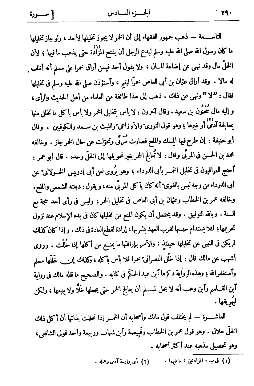 التَّاسِعَةُ- ذَهَبَ جُمْهُورُ الْفُقَهَاءِ إِلَى أَنَّ الْخَمْرَ لَا يَجُوزُ تَخْلِيلُهَا لِأَحَدٍ، وَلَوْ جَازَ تَخْلِيلُهَا مَا كَانَ رَسُولُ اللَّهِ صَلَّى اللَّهُ عَلَيْهِ وَسَلَّمَ لِيَدَعَ الرَّجُلَ أَنْ يَفْتَحَ الْمَزَادَةَ «١» حَتَّى يَذْهَبَ مَا فِيهَا، لِأَنَّ الْخَلَّ مَالٌ وَقَدْ نُهِيَ عَنْ إِضَاعَةِ الْمَالِ، وَلَا يَقُولُ أَحَدٌ فِيمَنْ أَرَاقَ خَمْرًا عَلَى مُسْلِمٍ أَنَّهُ أَتْلَفَ لَهُ مَالًا. وَقَدْ أَرَاقَ عُثْمَانُ بْنُ أَبِي الْعَاصِ خَمْرًا لِيَتِيمٍ، وَاسْتُؤْذِنَ صَلَّى اللَّهُ عَلَيْهِ وَسَلَّمَ فِي تَخْلِيلِهَا فَقَالَ:] لَا [وَنَهَى عَنْ ذَلِكَ. ذَهَبَ إِلَى هَذَا طَائِفَةٌ مِنَ الْعُلَمَاءِ مِنْ أَهْلِ الْحَدِيثِ وَالرَّأْيِ، وَإِلَيْهِ مَالَ سَحْنُونُ بْنُ سَعِيدٍ. وَقَالَ آخَرُونَ: لَا بَأْسَ بِتَخْلِيلِ الْخَمْرِ وَلَا بَأْسَ بِأَكْلِ مَا تَخَلَّلَ مِنْهَا بِمُعَالَجَةِ آدَمِيٍّ «٢» أَوْ غَيْرِهَا وَهُوَ قَوْلُ الثَّوْرِيِّ وَالْأَوْزَاعِيِّ وَاللَّيْثِ بْنِ سَعْدٍ وَالْكُوفِيِّينَ. وَقَالَ أَبُو حَنِيفَةَ: إِنْ طَرَحَ فِيهَا الْمِسْكَ وَالْمِلْحَ فَصَارَتْ مُرَبًّى وَتَحَوَّلَتْ عَنْ حَالِ الْخَمْرِ جَازَ. وَخَالَفَهُ مُحَمَّدُ بْنُ الْحَسَنِ فِي الْمُرَبَّى وَقَالَ: لَا تُعَالَجُ الْخَمْرُ بِغَيْرِ تَحْوِيلِهَا إِلَى الْخَلِّ وَحْدَهُ. قَالَ أَبُو عُمَرَ: احْتَجَّ الْعِرَاقِيُّونَ فِي تَخْلِيلِ الْخَمْرِ بِأَبِي الدَّرْدَاءِ، وَهُوَ يَرْوِي عَنْ أَبِي إِدْرِيسَ الْخَوْلَانِيِّ عَنْ أَبِي الدَّرْدَاءِ مِنْ وَجْهٍ لَيْسَ بِالْقَوِيِّ أَنَّهُ كَانَ يَأْكُلُ الْمُرَبَّى مِنْهُ، وَيَقُولُ: دَبَغَتْهُ الشَّمْسُ وَالْمِلْحُ. وَخَالَفَهُ عُمَرُ بْنُ الْخَطَّابِ وَعُثْمَانُ بْنُ أَبِي الْعَاصِ فِي تَخْلِيلِ الْخَمْرِ، وَلَيْسَ فِي رَأْيِ أَحَدٍ حُجَّةً مَعَ السُّنَّةِ. وَبِاللَّهِ التَّوْفِيقُ. وَقَدْ يَحْتَمِلُ أَنْ يَكُونَ الْمَنْعُ مِنْ تَخْلِيلِهَا كَانَ فِي بَدْءِ الْإِسْلَامِ عِنْدَ نُزُولِ تَحْرِيمِهَا، لِئَلَّا يُسْتَدَامَ حَبْسُهَا لِقُرْبِ الْعَهْدِ بِشُرْبِهَا، إِرَادَةً لِقَطْعِ الْعَادَةِ فِي ذَلِكَ. وَإِذَا كَانَ كَذَلِكَ لَمْ يَكُنْ فِي النَّهْيِ عَنْ تَخْلِيلِهَا حِينَئِذٍ، وَالْأَمْرِ بِإِرَاقَتِهَا مَا يَمْنَعُ مِنْ أَكْلِهَا إِذَا خُلِّلَتْ. وَرَوَى أَشْهَبُ عَنْ مَالِكٍ قَالَ: إِذَا خَلَّلَ النَّصْرَانِيُّ خَمْرًا فَلَا بَأْسَ بِأَكْلِهِ، وَكَذَلِكَ إِنْ خَلَّلَهَا مُسْلِمٌ وَاسْتَغْفَرَ اللَّهَ، وَهَذِهِ الرِّوَايَةُ ذَكَرَهَا ابْنُ عَبْدِ الْحَكَمِ فِي كِتَابِهِ. وَالصَّحِيحُ مَا قَالَهُ مَالِكٌ فِي رِوَايَةِ ابْنِ الْقَاسِمِ وَابْنِ وَهْبٍ أَنَّهُ لَا يَحِلُّ لِمُسْلِمٍ أَنْ يُعَالِجَ الْخَمْرَ حَتَّى يَجْعَلَهَا خَلًّا وَلَا يَبِيعَهَا، وَلَكِنْ لِيُهْرِيقَهَا. الْعَاشِرَةُ- لَمْ يَخْتَلِفْ قَوْلُ مَالِكٍ وَأَصْحَابِهِ أَنَّ الْخَمْرَ إِذَا تَخَلَّلَتْ بِذَاتِهَا أَنَّ أَكْلَ ذَلِكَ الْخَلِّ حَلَالٌ. وَهُوَ قَوْلُ عُمَرَ بْنِ الْخَطَّابِ وَقَبِيصَةَ وَابْنِ شِهَابٍ وَرَبِيعَةَ وَأَحَدُ قَوْلَيِ الشَّافِعِيِّ، وَهُوَ تَحْصِيلُ مذهبه عند أكثر أصحابه.