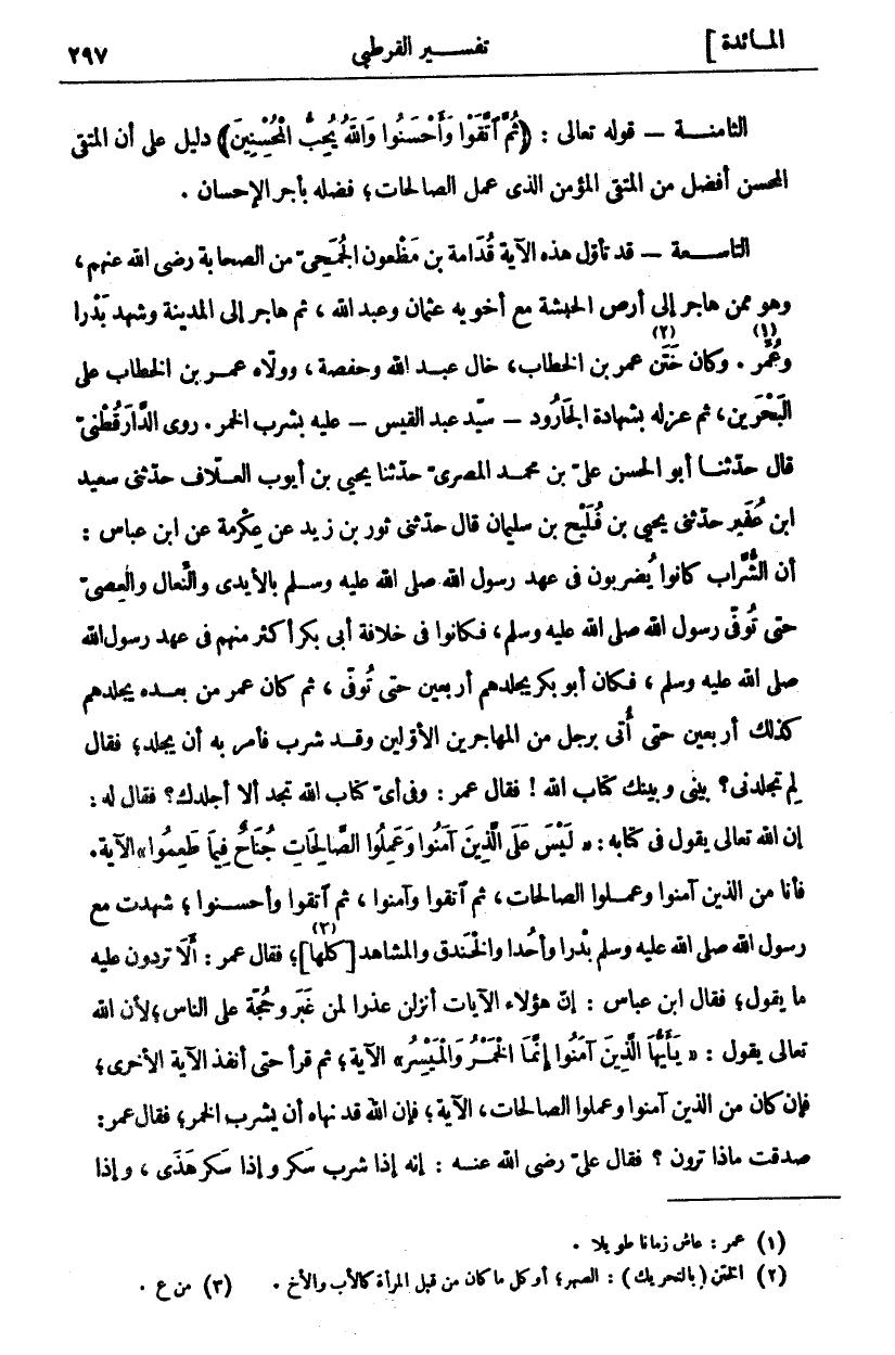 الثَّامِنَةُ- قَوْلُهُ تَعَالَى: (ثُمَّ اتَّقَوْا وَأَحْسَنُوا وَاللَّهُ يُحِبُّ الْمُحْسِنِينَ) دَلِيلٌ عَلَى أَنَّ الْمُتَّقِيَ الْمُحْسِنَ أَفْضَلُ مِنَ الْمُتَّقِي الْمُؤْمِنِ الَّذِي عَمِلَ الصَّالِحَاتِ، فَضَّلَهُ بِأَجْرِ الْإِحْسَانِ. التَّاسِعَةُ- قَدْ تَأَوَّلَ هَذِهِ الْآيَةَ قُدَامَةُ بْنُ مَظْعُونٍ الْجُمَحِيُّ مِنَ الصَّحَابَةِ رَضِيَ اللَّهُ عَنْهُمْ، وَهُوَ مِمَّنْ هَاجَرَ إِلَى أَرْضِ الْحَبَشَةِ مَعَ أَخَوَيْهِ عُثْمَانَ وَعَبْدَ اللَّهِ، ثُمَّ هَاجَرَ إِلَى الْمَدِينَةِ وَشَهِدَ بَدْرًا وَعُمِّرَ «١». وَكَانَ خَتْنُ «٢» عُمَرَ بْنِ الْخَطَّابِ، خَالُ عَبْدِ اللَّهِ وَحَفْصَةُ، وَوَلَّاهُ عُمَرُ بْنُ الْخَطَّابِ عَلَى الْبَحْرَيْنِ، ثُمَّ عَزَلَهُ بِشَهَادَةِ الْجَارُودِ- سَيِّدِ عَبْدِ الْقَيْسِ- عَلَيْهِ بِشُرْبِ الْخَمْرِ. رَوَى الدَّارَقُطْنِيُّ قَالَ حَدَّثَنَا أَبُو الْحَسَنِ عَلِيُّ بْنُ مُحَمَّدٍ الْمِصْرِيُّ حَدَّثَنَا يَحْيَى بْنُ أَيُّوبَ الْعَلَّافُ حَدَّثَنِي سَعِيدُ ابن عُفَيْرٍ، حَدَّثَنِي يَحْيَى بْنُ فُلَيْحٍ بْنُ سُلَيْمَانَ، قَالَ حَدَّثَنِي ثَوْرُ بْنُ زَيْدٍ عَنْ عِكْرِمَةَ عَنِ ابْنِ عَبَّاسٍ: أَنَّ الشُّرَّابَ كَانُوا يُضْرَبُونَ فِي عَهْدِ رَسُولِ اللَّهِ صَلَّى اللَّهُ عَلَيْهِ وَسَلَّمَ بِالْأَيْدِي وَالنِّعَالِ وَالْعِصِيِّ حَتَّى تُوُفِّيَ رَسُولُ اللَّهِ صَلَّى اللَّهُ عَلَيْهِ وَسَلَّمَ، فَكَانُوا فِي خِلَافَةِ أَبِي بَكْرٍ أَكْثَرُ مِنْهُمْ فِي عَهْدِ رَسُولِ اللَّهِ صَلَّى اللَّهُ عَلَيْهِ وَسَلَّمَ، فَكَانَ أَبُو بَكْرٍ يَجْلِدُهُمْ أَرْبَعِينَ حَتَّى تُوُفِّيَ، ثُمَّ كَانَ عُمَرُ مِنْ بَعْدِهِ يَجْلِدُهُمْ كَذَلِكَ أَرْبَعِينَ حَتَّى أُتِيَ بِرَجُلٍ مِنَ الْمُهَاجِرِينَ الْأَوَّلِينَ وَقَدْ شرب فأمر به أن يجلد، فقال لِمَ تَجْلِدُنِي؟ بَيْنِي وَبَيْنَكَ كِتَابُ اللَّهِ! فَقَالَ عُمَرُ: وَفِي أَيِّ كِتَابِ اللَّهِ تَجِدُ أَلَّا أَجْلِدَكَ؟ فَقَالَ لَهُ: إِنَّ اللَّهَ تَعَالَى يَقُولُ فِي كِتَابِهِ:" لَيْسَ عَلَى الَّذِينَ آمَنُوا وَعَمِلُوا الصَّالِحاتِ جُناحٌ فِيما طَعِمُوا" الْآيَةَ. فَأَنَا مِنَ الذِينَ آمَنُوا وَعَمِلُوا الصَّالِحَاتِ، ثُمَّ اتَّقَوْا وَآمَنُوا، ثُمَّ اتَّقَوْا وَأَحْسَنُوا، شَهِدْتُ مَعَ رَسُولِ اللَّهِ صَلَّى اللَّهُ عَلَيْهِ وَسَلَّمَ بَدْرًا وَأُحُدًا وَالْخَنْدَقَ وَالْمَشَاهِدَ] كُلَّهَا [«٣»، فَقَالَ عُمَرُ: أَلَا تَرُدُّونَ عَلَيْهِ مَا يَقُولُ، فَقَالَ ابْنُ عَبَّاسٍ: إِنَّ هَؤُلَاءِ الآيات أنزلن عُذْرًا لِمَنْ غَبَرَ وَحُجَّةً عَلَى النَّاسِ، لِأَنَّ اللَّهَ تَعَالَى يَقُولُ:" يَا أَيُّهَا الَّذِينَ آمَنُوا إِنَّمَا الْخَمْرُ وَالْمَيْسِرُ" الْآيَةَ، ثُمَّ قَرَأَ حَتَّى أَنْفَذَ الْآيَةَ الْأُخْرَى، فَإِنْ كَانَ مِنَ الذِينَ آمَنُوا وَعَمِلُوا الصَّالِحَاتِ، الْآيَةَ، فَإِنَّ اللَّهَ قَدْ نَهَاهُ أَنْ يَشْرَبَ الْخَمْرَ، فَقَالَ عُمَرُ: صَدَقْتَ مَاذَا تَرَوْنَ؟ فَقَالَ عَلِيٌّ رَضِيَ اللَّهُ عَنْهُ: إِنَّهُ إِذَا شَرِبَ سَكِرَ وَإِذَا سَكِرَ هَذَى، وإذا