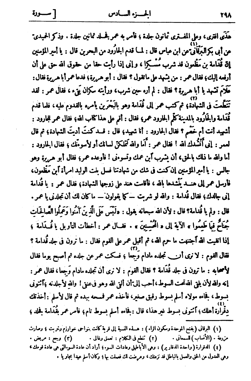 هَذَى افْتَرَى، وَعَلَى الْمُفْتَرِي ثَمَانُونَ جَلْدَةً، فَأَمَرَ بِهِ عُمَرُ فَجُلِدَ ثَمَانِينَ جَلْدَةً. وَذَكَرَ الْحُمَيْدِيُّ عَنْ أَبِي بَكْرٍ الْبُرْقَانِيِّ «١» عَنِ ابْنِ عَبَّاسٍ قَالَ: لَمَّا قَدِمَ الْجَارُودُ مِنَ الْبَحْرَيْنِ قَالَ: يَا أَمِيرَ الْمُؤْمِنِينَ إِنَّ قُدَامَةَ بْنَ مَظْعُونٍ قَدْ شَرِبَ مُسْكِرًا، وَإِنِّي إِذَا رَأَيْتُ حَقًّا مِنْ حُقُوقِ اللَّهِ حَقَّ عَلَيَّ أَنْ أَرْفَعَهُ إِلَيْكَ، فَقَالَ عُمَرُ: مَنْ يَشْهَدُ عَلَى مَا تَقُولُ؟ فَقَالَ: أَبُو هُرَيْرَةَ، فَدَعَا عُمَرُ أَبَا هُرَيْرَةَ فَقَالَ: عَلَامَ تَشْهَدُ يَا أَبَا هُرَيْرَةَ؟ فَقَالَ: لَمْ أَرَهُ حِينَ شَرِبَ، وَرَأَيْتُهُ سَكْرَانَ يقي، فَقَالَ عُمَرُ: لَقَدْ تَنَطَّعْتَ «٢» فِي الشَّهَادَةِ، ثُمَّ كَتَبَ عُمَرُ إِلَى قُدَامَةَ وَهُوَ بِالْبَحْرَيْنِ يَأْمُرُهُ بِالْقُدُومِ عَلَيْهِ، فَلَمَّا قَدِمَ قُدَامَةُ وَالْجَارُودُ بِالْمَدِينَةِ كَلَّمَ الْجَارُودُ عُمَرَ، فَقَالَ: أَقِمْ عَلَى هَذَا كِتَابَ اللَّهِ، فَقَالَ عُمَرُ لِلْجَارُودِ: أَشَهِيدٌ أَنْتَ أَمْ خَصْمٌ؟ فَقَالَ الْجَارُودُ: أَنَا شَهِيدٌ، قَالَ: قَدْ كُنْتُ أَدَّيْتُ الشَّهَادَةَ، ثُمَّ قَالَ لِعُمَرَ: إِنِّي أَنْشُدُكَ اللَّهَ! فَقَالَ عُمَرُ: أَمَا وَاللَّهِ لَتَمْلِكَنَّ لِسَانَكَ أَوْ لَأَسُوءَنَّكَ، فَقَالَ الْجَارُودُ: أَمَا وَاللَّهِ مَا ذَلِكَ بِالْحَقِّ، أَنْ يَشْرَبَ ابْنُ عَمِّكَ وَتَسُوءَنِي! فَأَوْعَدَهُ عُمَرُ، فَقَالَ أَبُو هُرَيْرَةَ وَهُوَ جَالِسٌ: يَا أَمِيرَ الْمُؤْمِنِينَ إِنْ كُنْتَ فِي شَكٍّ مِنْ شَهَادَتِنَا فَسَلْ بِنْتَ الْوَلِيدِ امْرَأَةَ ابْنِ مَظْعُونٍ، فَأَرْسَلَ عُمَرُ إِلَى هِنْدٍ يَنْشُدُهَا بِاللَّهِ، فَأَقَامَتْ هِنْدٌ عَلَى زَوْجِهَا الشَّهَادَةَ، فَقَالَ عُمَرُ: يَا قُدَامَةُ إِنِّي جَالِدُكَ، فَقَالَ قُدَامَةُ: وَاللَّهِ لَوْ شَرِبْتَ- كَمَا يَقُولُونَ- مَا كَانَ لَكَ أَنْ تَجْلِدَنِي يَا عُمَرُ. قَالَ: وَلِمَ يَا قُدَامَةُ؟ قَالَ: لِأَنَّ اللَّهَ سُبْحَانَهُ يَقُولُ:" لَيْسَ عَلَى الَّذِينَ آمَنُوا وَعَمِلُوا الصَّالِحاتِ جُناحٌ فِيما طَعِمُوا" الْآيَةَ إِلَى" الْمُحْسِنِينَ". فَقَالَ عُمَرُ: أَخْطَأْتَ التَّأْوِيلَ يَا قُدَامَةُ، إِذَا اتَّقَيْتَ اللَّهَ اجْتَنَبْتَ مَا حَرَّمَ اللَّهُ، ثُمَّ أَقْبَلَ عُمَرُ عَلَى الْقَوْمِ فَقَالَ: مَا تَرَوْنَ فِي جَلْدِ قُدَامَةَ؟ فَقَالَ الْقَوْمُ: لَا نَرَى أَنْ تَجْلِدَهُ مَا دَامَ وَجِعًا «٣»، فَسَكَتَ عُمَرُ عَنْ جَلْدِهِ ثُمَّ أَصْبَحَ يَوْمًا فَقَالَ لِأَصْحَابِهِ: مَا تَرَوْنَ فِي جَلْدِ قُدَامَةَ؟ فَقَالَ الْقَوْمُ: لَا نَرَى أَنْ تَجْلِدَهُ مَا دَامَ وَجِعًا، فَقَالَ عُمَرُ: إِنَّهُ وَاللَّهِ لَأَنْ يَلْقَى اللَّهَ تَحْتَ السَّوْطِ، أَحَبُّ إِلَيَّ أَنْ أَلْقَى اللَّهَ وَهُوَ فِي عُنُقِي! وَاللَّهِ لَأَجْلِدَنَّهُ، ائْتُونِي بِسَوْطٍ، فَجَاءَهُ مَوْلَاهُ أَسْلَمُ بِسَوْطٍ رَقِيقٍ صَغِيرٍ، فَأَخَذَهُ عُمَرُ فَمَسَحَهُ بِيَدِهِ ثُمَّ قَالَ لِأَسْلَمَ: أَخَذَتْكَ دِقْرَارَةُ «٤» أَهْلِكَ، ائْتُونِي بِسَوْطٍ غَيْرِ هَذَا. قَالَ: فَجَاءَهُ أَسْلَمُ بِسَوْطٍ تَامٍّ، فَأَمَرَ عُمَرُ بِقُدَامَةَ فَجُلِدَ،