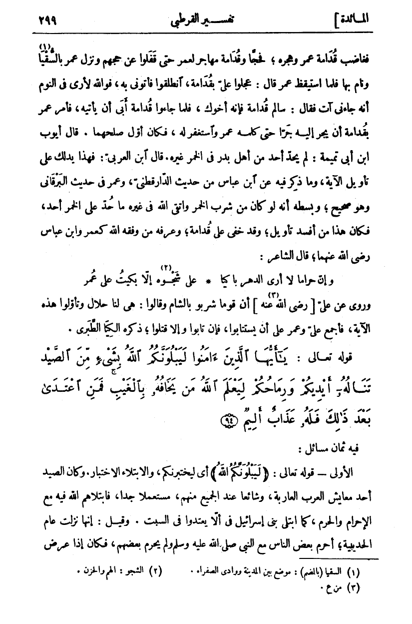 فَغَاضَبَ قُدَامَةُ عُمَرَ وَهَجَرَهُ، فَحَجَّا وَقُدَامَةُ مُهَاجِرٌ لِعُمَرَ حَتَّى قَفَلُوا عَنْ حَجِّهِمْ وَنَزَلَ عُمَرُ بِالسُّقْيَا «١» وَنَامَ بِهَا فَلَمَّا اسْتَيْقَظَ عُمَرُ قَالَ: عَجِّلُوا عَلَيَّ بِقُدَامَةَ، انْطَلِقُوا فَأْتُونِي بِهِ، فَوَاللَّهِ لَأَرَى فِي النَّوْمِ أَنَّهُ جَاءَنِي آتٍ فَقَالَ: سَالِمْ قُدَامَةَ فَإِنَّهُ أَخُوكَ، فَلَمَّا جَاءُوا قُدَامَةَ أَبَى أَنْ يَأْتِيَهُ، فَأَمَرَ عُمَرُ بِقُدَامَةَ أَنْ يُجَرَّ إِلَيْهِ جَرًّا حَتَّى كَلَّمَهُ عُمَرُ وَاسْتَغْفَرَ له، فكان أول صلحهما. قال أيوب ابن أَبِي تَمِيمَةَ: لَمْ يُحَدَّ أَحَدٌ مِنْ أَهْلِ بَدْرٍ فِي الْخَمْرِ غَيْرُهُ. قَالَ ابْنُ الْعَرَبِيِّ: فَهَذَا يَدُلُّكَ عَلَى تَأْوِيلِ الْآيَةِ، وَمَا ذُكِرَ فِيهِ عَنِ ابْنِ عَبَّاسٍ مِنْ حَدِيثِ الدَّارَقُطْنِيِّ، وَعُمَرَ فِي حَدِيثِ الْبُرْقَانِيِّ وَهُوَ صَحِيحٌ، وَبَسْطُهُ أَنَّهُ لَوْ كَانَ مَنْ شَرِبَ الْخَمْرَ وَاتَّقَى اللَّهَ فِي غَيْرِهِ مَا حُدَّ عَلَى الْخَمْرِ أَحَدٌ، فَكَانَ هَذَا مِنْ أَفْسَدِ تَأْوِيلٍ، وَقَدْ خَفِيَ عَلَى قُدَامَةَ، وَعَرَفَهُ مَنْ وَفَّقَهُ اللَّهُ كَعُمَرَ وَابْنِ عَبَّاسٍ رَضِيَ اللَّهُ عَنْهُمَا، قَالَ الشَّاعِرُ: