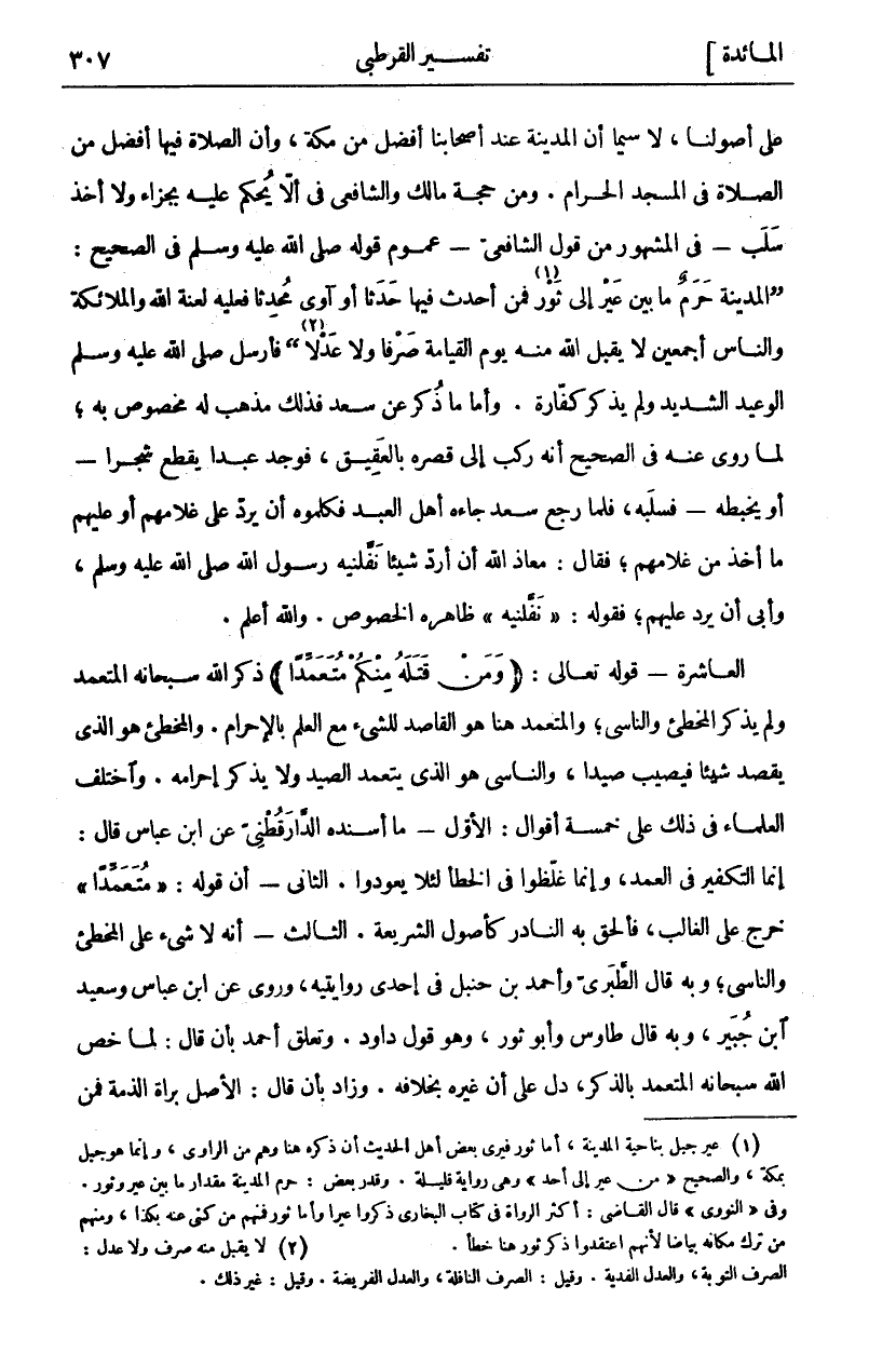 عَلَى أُصُولِنَا، لَا سِيَّمَا أَنَّ الْمَدِينَةَ عِنْدَ أَصْحَابِنَا أَفْضَلُ مِنْ مَكَّةَ، وَأَنَّ الصَّلَاةَ فِيهَا أَفْضَلُ مِنَ الصَّلَاةِ فِي الْمَسْجِدِ الْحَرَامِ. وَمِنْ حُجَّةِ مَالِكٍ وَالشَّافِعِيِّ فِي أَلَّا يُحْكَمَ عَلَيْهِ بِجَزَاءٍ وَلَا أَخْذِ سَلَبٍ- فِي الْمَشْهُورِ مِنْ قَوْلِ الشَّافِعِيِّ- عُمُومُ قَوْلِهِ صَلَّى اللَّهُ عَلَيْهِ وَسَلَّمَ فِي الصَّحِيحِ:] الْمَدِينَةُ حَرَمٌ مَا بَيْنَ عَيْرٍ إِلَى ثَوْرٍ «١» فَمَنْ أَحْدَثَ فِيهَا حَدَثًا أَوْ آوَى مُحْدِثًا فَعَلَيْهِ لَعْنَةُ اللَّهِ وَالْمَلَائِكَةِ وَالنَّاسِ أَجْمَعِينَ لَا يَقْبَلُ اللَّهُ مِنْهُ يَوْمَ الْقِيَامَةِ صَرْفًا وَلَا عَدْلًا [«٢» فَأَرْسَلَ صَلَّى اللَّهُ عَلَيْهِ وَسَلَّمَ الْوَعِيدَ الشَّدِيدَ وَلَمْ يَذْكُرْ كَفَّارَةً. وَأَمَّا مَا ذُكِرَ عَنْ سَعْدٍ فَذَلِكَ مَذْهَبٌ لَهُ مَخْصُوصٌ بِهِ، لِمَا رُوِيَ عَنْهُ فِي الصَّحِيحِ أَنَّهُ رَكِبَ إِلَى قَصْرِهِ بِالْعَقِيقِ، فَوَجَدَ عَبْدًا يَقْطَعُ شَجَرًا- أَوْ يَخْبِطُهُ- فَسَلَبَهُ، فَلَمَّا رَجَعَ سَعْدٌ جَاءَهُ أَهْلُ الْعَبْدِ فَكَلَّمُوهُ أَنْ يَرُدَّ عَلَى غُلَامِهِمْ أَوْ عَلَيْهِمْ مَا أَخَذَ مِنْ غُلَامِهِمْ، فَقَالَ: مَعَاذَ اللَّهِ أَنْ أَرُدَّ شَيْئًا نَفَّلَنِيهِ رَسُولِ اللَّهِ صَلَّى اللَّهُ عَلَيْهِ وَسَلَّمَ، وَأَبِي أَنْ يَرُدَّ عَلَيْهِمْ، فَقَوْلُهُ: (نَفَّلَنِيهِ) ظَاهِرُهُ الْخُصُوصُ. وَاللَّهُ أَعْلَمُ. الْعَاشِرَةُ- قَوْلُهُ تَعَالَى: (وَمَنْ قَتَلَهُ مِنْكُمْ مُتَعَمِّداً) ذَكَرَ اللَّهُ سُبْحَانَهُ الْمُتَعَمِّدَ وَلَمْ يَذْكُرِ الْمُخْطِئَ وَالنَّاسِيَ، وَالْمُتَعَمِّدُ هُنَا هُوَ الْقَاصِدُ لِلشَّيْءِ مَعَ الْعِلْمِ بِالْإِحْرَامِ. وَالْمُخْطِئُ هُوَ الَّذِي يَقْصِدُ شَيْئًا فَيُصِيبُ صَيْدًا، وَالنَّاسِي هُوَ الَّذِي يَتَعَمَّدُ الصَّيْدَ وَلَا يَذْكُرُ إِحْرَامَهُ. وَاخْتَلَفَ الْعُلَمَاءُ فِي ذَلِكَ عَلَى خَمْسَةِ أَقْوَالٍ: الْأَوَّلُ- مَا أَسْنَدَهُ الدَّارَقُطْنِيُّ عَنِ ابْنِ عَبَّاسٍ قَالَ: إِنَّمَا التَّكْفِيرُ فِي الْعَمْدِ، وَإِنَّمَا غَلَّظُوا فِي الْخَطَأِ لِئَلَّا يَعُودُوا. الثَّانِي: أَنَّ قَوْلَهُ:" مُتَعَمِّداً" خَرَجَ عَلَى الْغَالِبِ، فَأُلْحِقَ بِهِ النَّادِرُ كأصول الشريعة. الثالث- أنه لا شي عَلَى الْمُخْطِئِ وَالنَّاسِي، وَبِهِ قَالَ الطَّبَرِيُّ وَأَحْمَدُ بْنُ حَنْبَلٍ فِي إِحْدَى رِوَايَتَيْهِ، وَرُوِيَ عَنِ ابن عباس وسعيد ابن جُبَيْرٍ، وَبِهِ قَالَ طَاوُسٌ وَأَبُو ثَوْرٍ، وَهُوَ قَوْلُ دَاوُدَ. وَتَعَلَّقَ أَحْمَدُ بِأَنْ قَالَ: لَمَّا خَصَّ اللَّهُ سُبْحَانَهُ الْمُتَعَمِّدَ بِالذِّكْرِ، دَلَّ عَلَى أَنَّ غَيْرَهُ بِخِلَافِهِ. وَزَادَ بِأَنْ قَالَ: الْأَصْلُ براءة الذمة فمن