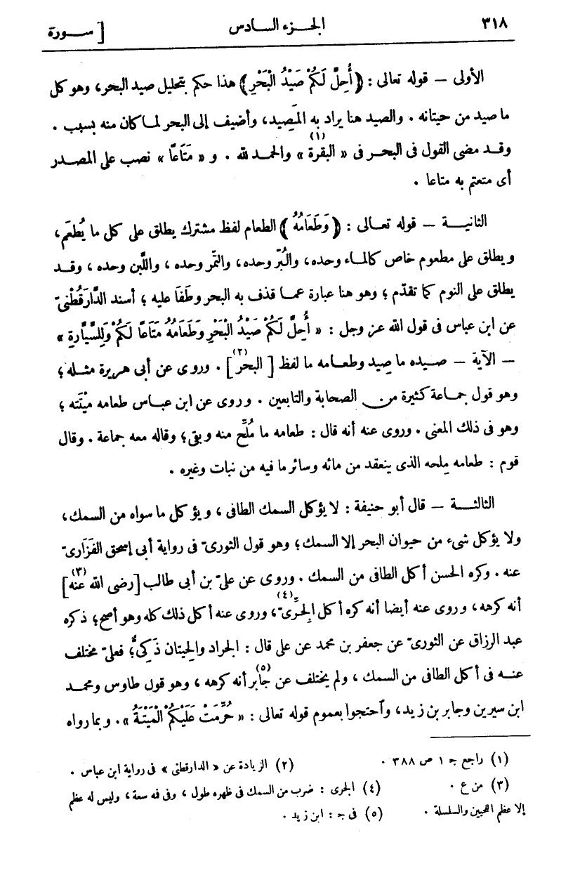 الْأُولَى- قَوْلُهُ تَعَالَى: (أُحِلَّ لَكُمْ صَيْدُ الْبَحْرِ) هَذَا حُكْمٌ بِتَحْلِيلِ صَيْدِ الْبَحْرِ، وَهُوَ كُلُّ مَا صِيدَ مِنْ حِيتَانِهِ وَالصَّيْدُ هُنَا يُرَادُ بِهِ الْمَصِيدُ، وَأُضِيفَ إِلَى الْبَحْرِ لَمَّا كَانَ مِنْهُ بِسَبَبٍ. وَقَدْ مَضَى الْقَوْلُ فِي الْبَحْرِ فِي" الْبَقَرَةِ" «١» وَالْحَمْدُ لِلَّهِ. وَ" مَتاعاً" نُصِبَ عَلَى الْمَصْدَرِ أَيْ مُتِّعْتُمْ بِهِ مَتَاعًا. الثَّانِيَةُ- قوله تعالى: (وَطَعامُهُ) الطَّعَامُ لَفْظٌ مُشْتَرَكٌ يُطْلَقُ عَلَى كُلِّ مَا يُطْعَمُ، وَيُطْلَقُ عَلَى مَطْعُومٍ خَاصٍّ كَالْمَاءِ وَحْدَهُ، وَالْبُرِّ وَحْدَهُ، وَالتَّمْرِ وَحْدَهُ، وَاللَّبَنِ وَحْدَهُ، وَقَدْ يُطْلَقُ عَلَى النَّوْمِ كَمَا تَقَدَّمَ، وَهُوَ هُنَا عِبَارَةٌ عَمَّا قَذَفَ بِهِ الْبَحْرُ وَطَفَا عَلَيْهِ، أَسْنَدَ الدَّارَقُطْنِيُّ عَنِ ابْنِ عَبَّاسٍ فِي قَوْلِ اللَّهِ عَزَّ وَجَلَّ:" أُحِلَّ لَكُمْ صَيْدُ الْبَحْرِ وَطَعامُهُ مَتاعاً لَكُمْ وَلِلسَّيَّارَةِ"- الْآيَةَ- صَيْدُهُ مَا صِيدَ وَطَعَامُهُ مَا لَفَظَ] الْبَحْرُ [«٢». وَرُوِيَ عَنْ أَبِي هُرَيْرَةَ مِثْلُهُ، وَهُوَ قَوْلُ جَمَاعَةٍ كَثِيرَةٍ مِنَ الصَّحَابَةِ وَالتَّابِعِينَ. وَرُوِيَ عَنِ ابْنِ عَبَّاسٍ طعامه مَيْتَتُهُ، وَهُوَ فِي ذَلِكَ الْمَعْنَى. وَرُوِيَ عَنْهُ أَنَّهُ قَالَ: طَعَامُهُ مَا مُلِّحَ مِنْهُ وَبَقِيَ، وَقَالَهُ مَعَهُ جَمَاعَةٌ. وَقَالَ قَوْمٌ: طَعَامُهُ مِلْحُهُ الَّذِي يَنْعَقِدُ مِنْ مَائِهِ وَسَائِرِ مَا فِيهِ مِنْ نَبَاتٍ وَغَيْرِهِ. الثَّالِثَةُ- قَالَ أَبُو حَنِيفَةَ: لَا يُؤْكَلُ السَّمَكُ الطَّافِي وَيُؤْكَلُ مَا سِوَاهُ من السمك، ولا يؤكل شي مِنْ حَيَوَانِ الْبَحْرِ إِلَّا السَّمَكَ وَهُوَ قَوْلُ الثَّوْرِيِّ فِي رِوَايَةِ أَبِي إِسْحَاقَ الْفَزَارِيِّ عَنْهُ. وَكَرِهَ الْحَسَنُ أَكْلَ الطَّافِي مِنَ السَّمَكِ. وَرُوِيَ عَنْ عَلِيِّ بْنِ أَبِي طَالِبٍ] رَضِيَ اللَّهُ عَنْهُ [«٣» أَنَّهُ كَرِهَهُ، وَرُوِيَ عَنْهُ أَيْضًا أَنَّهُ كَرِهَ أَكْلَ الْجِرِّيِّ «٤»، وَرُوِيَ عَنْهُ أَكْلُ ذَلِكَ كُلُّهُ وَهُوَ أَصَحُّ، ذَكَرَهُ عَبْدُ الرَّزَّاقِ عَنِ الثَّوْرِيِّ عَنْ جَعْفَرِ بْنِ مُحَمَّدٍ عَنْ عَلِيٍّ قَالَ: الْجَرَادُ وَالْحِيتَانُ ذَكِيٌّ، فَعَلِيٌّ مُخْتَلَفٌ عَنْهُ فِي أَكْلِ الطَّافِي مِنَ السَّمَكِ وَلَمْ يُخْتَلَفْ عَنْ جَابِرٍ «٥» أَنَّهُ كَرِهَهُ، وَهُوَ قَوْلُ طَاوُسٍ وَمُحَمَّدِ بْنِ سِيرِينَ وَجَابِرِ بْنِ زَيْدٍ، وَاحْتَجُّوا بعموم قوله تعالى:" حُرِّمَتْ عَلَيْكُمُ الْمَيْتَةُ"] المائدة: ٣]. وبما رواه