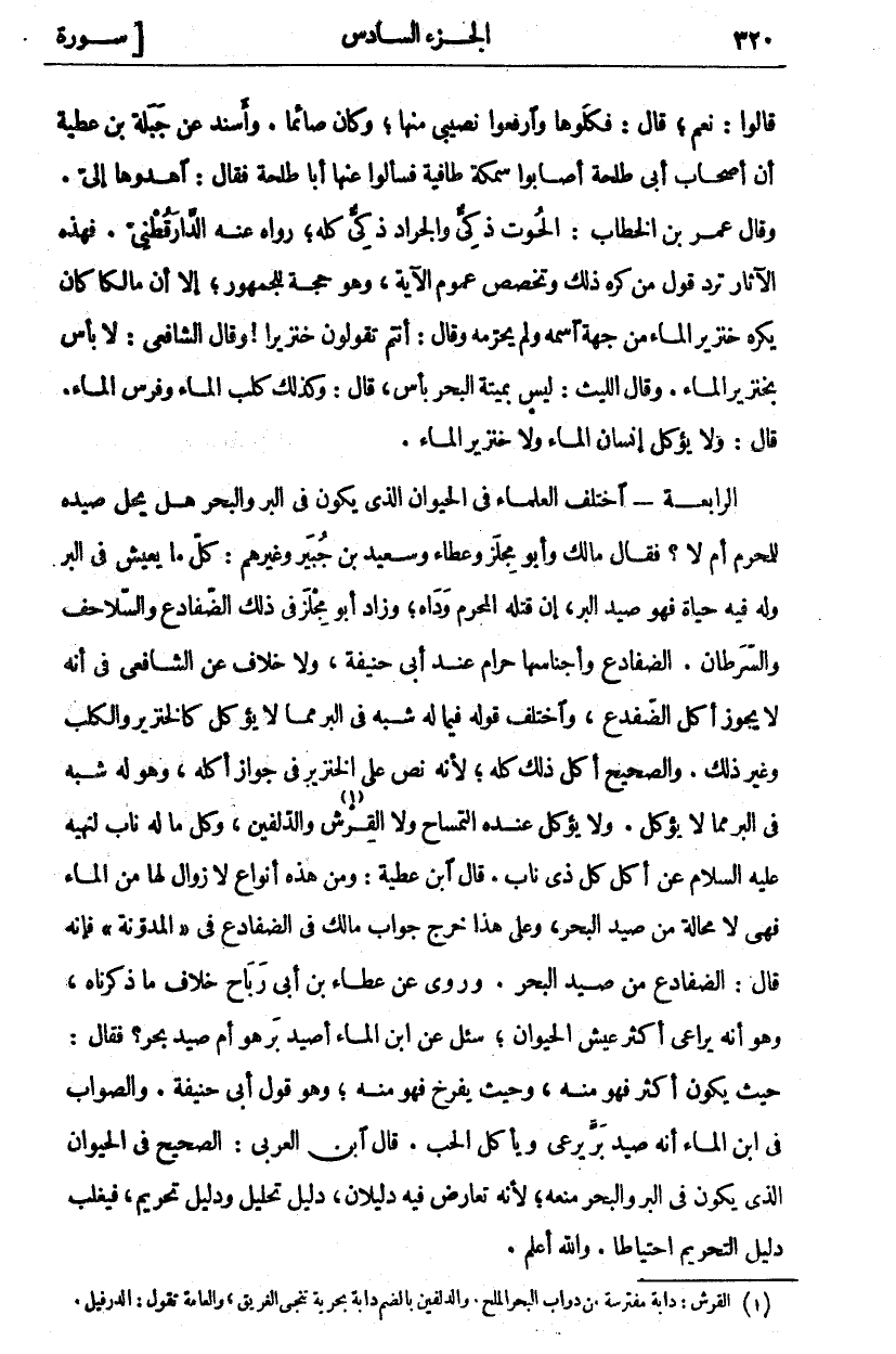 قَالُوا: نَعَمْ قَالَ: فَكُلُوهَا وَارْفَعُوا نَصِيبِي مِنْهَا، وَكَانَ صَائِمًا. وَأَسْنَدَ عَنْ جَبَلَةَ بْنِ عَطِيَّةَ أَنَّ أَصْحَابَ أَبِي طَلْحَةَ أَصَابُوا سَمَكَةً طَافِيَةً فَسَأَلُوا عَنْهَا أَبَا طَلْحَةَ فَقَالَ: أَهْدُوهَا إِلَيَّ. وَقَالَ عُمَرُ بْنُ الْخَطَّابِ: الْحُوتُ ذَكِيٌّ وَالْجَرَادُ ذَكِيٌّ كُلُّهُ، رَوَاهُ عَنْهُ الدَّارَقُطْنِيُّ فَهَذِهِ الْآثَارُ تَرُدُّ قَوْلَ مَنْ كَرِهَ ذَلِكَ وَتُخَصِّصُ عُمُومَ الْآيَةِ، وَهُوَ حُجَّةٌ لِلْجُمْهُورِ، إِلَّا أَنَّ مَالِكًا كَانَ يَكْرَهُ خِنْزِيرَ الْمَاءِ مِنْ جِهَةِ اسْمِهِ وَلَمْ يُحَرِّمْهُ وَقَالَ: أَنْتُمْ تَقُولُونَ خِنْزِيرًا! وَقَالَ الشَّافِعِيُّ: لَا بَأْسَ بِخِنْزِيرِ الْمَاءِ وَقَالَ اللَّيْثُ: لَيْسَ بِمَيْتَةِ الْبَحْرِ بَأْسٌ. قَالَ: وَكَذَلِكَ كَلْبُ الْمَاءِ وَفَرَسُ الْمَاءِ. قَالَ: وَلَا يُؤْكَلُ إِنْسَانُ الْمَاءِ وَلَا خِنْزِيرُ الْمَاءِ. الرَّابِعَةُ- اخْتَلَفَ الْعُلَمَاءُ فِي الْحَيَوَانِ الَّذِي يَكُونُ فِي الْبَرِّ وَالْبَحْرِ هَلْ يَحِلُّ صَيْدُهُ لِلْمُحْرِمِ أَمْ لَا؟ فَقَالَ مَالِكٌ وَأَبُو مِجْلَزٍ وَعَطَاءٌ وَسَعِيدُ بْنُ جُبَيْرٍ وَغَيْرُهُمْ: كُلُّ مَا يَعِيشُ فِي الْبَرِّ وَلَهُ فِيهِ حَيَاةٌ فَهُوَ صَيْدُ الْبَرِّ، إِنْ قَتَلَهُ الْمُحْرِمُ وَدَاهُ، وَزَادَ أَبُو مِجْلَزٍ فِي ذَلِكَ الضَّفَادِعَ وَالسَّلَاحِفَ وَالسَّرَطَانَ. الضَّفَادِعُ وَأَجْنَاسُهَا حَرَامٌ عِنْدَ أَبِي حَنِيفَةَ وَلَا خِلَافَ عَنِ الشَّافِعِيِّ فِي أَنَّهُ لَا يَجُوزُ أَكْلُ الضِّفْدَعِ، وَاخْتَلَفَ قَوْلُهُ فِيمَا لَهُ شَبَهٌ فِي الْبَرِّ مِمَّا لَا يُؤْكَلُ كَالْخِنْزِيرِ وَالْكَلْبِ وَغَيْرِ ذَلِكَ. وَالصَّحِيحُ أَكْلُ ذَلِكَ كُلِّهِ، لِأَنَّهُ نَصَّ عَلَى الْخِنْزِيرِ فِي جَوَازِ أَكْلِهِ، وَهُوَ لَهُ شَبَهٌ فِي الْبَرِّ مِمَّا لَا يُؤْكَلُ. وَلَا يُؤْكَلُ عِنْدَهُ التِّمْسَاحُ وَلَا الْقِرْشُ «١» وَالدُّلْفِينُ، وَكُلُّ مَا لَهُ نَابٌ لِنَهْيِهِ عَلَيْهِ السَّلَامُ عَنْ أَكْلِ كُلِّ ذِي نَابٍ. قَالَ ابْنُ عَطِيَّةَ: وَمِنْ هَذِهِ أَنْوَاعٌ لَا زَوَالَ لَهَا مِنَ الْمَاءِ فَهِيَ لَا مَحَالَةَ مِنْ صَيْدِ الْبَحْرِ، وَعَلَى هَذَا خُرِّجَ جَوَابُ مَالِكٍ فِي الضَّفَادِعِ فِي" الْمُدَوَّنَةِ" فَإِنَّهُ قَالَ: الضَّفَادِعُ مِنْ صَيْدِ الْبَحْرِ. وَرُوِيَ عَنْ عَطَاءِ بْنِ أَبِي رَبَاحٍ خِلَافُ مَا ذَكَرْنَاهُ، وَهُوَ أَنَّهُ يُرَاعَى أَكْثَرُ عَيْشِ الْحَيَوَانِ، سُئِلَ عَنِ ابْنِ الْمَاءِ أَصَيْدُ بَرٍّ هُوَ أَمْ صَيْدُ بَحْرٍ؟ فَقَالَ: حَيْثُ يَكُونُ أَكْثَرَ فَهُوَ مِنْهُ، وَحَيْثُ يُفَرِّخُ فَهُوَ مِنْهُ، وَهُوَ قَوْلُ أَبِي حَنِيفَةَ. وَالصَّوَابُ فِي ابْنِ الْمَاءِ أَنَّهُ صَيْدُ بَرٍّ يَرْعَى وَيَأْكُلُ الْحَبَّ. قَالَ ابْنُ الْعَرَبِيِّ: الصَّحِيحُ فِي الْحَيَوَانِ الَّذِي يَكُونُ فِي الْبَرِّ وَالْبَحْرِ مَنْعُهُ، لِأَنَّهُ تَعَارَضَ فِيهِ دَلِيلَانِ، دليله تَحْلِيلٍ وَدَلِيلُ تَحْرِيمٍ، فَيُغَلَّبُ دَلِيلُ التَّحْرِيمِ احْتِيَاطًا. والله أعلم.