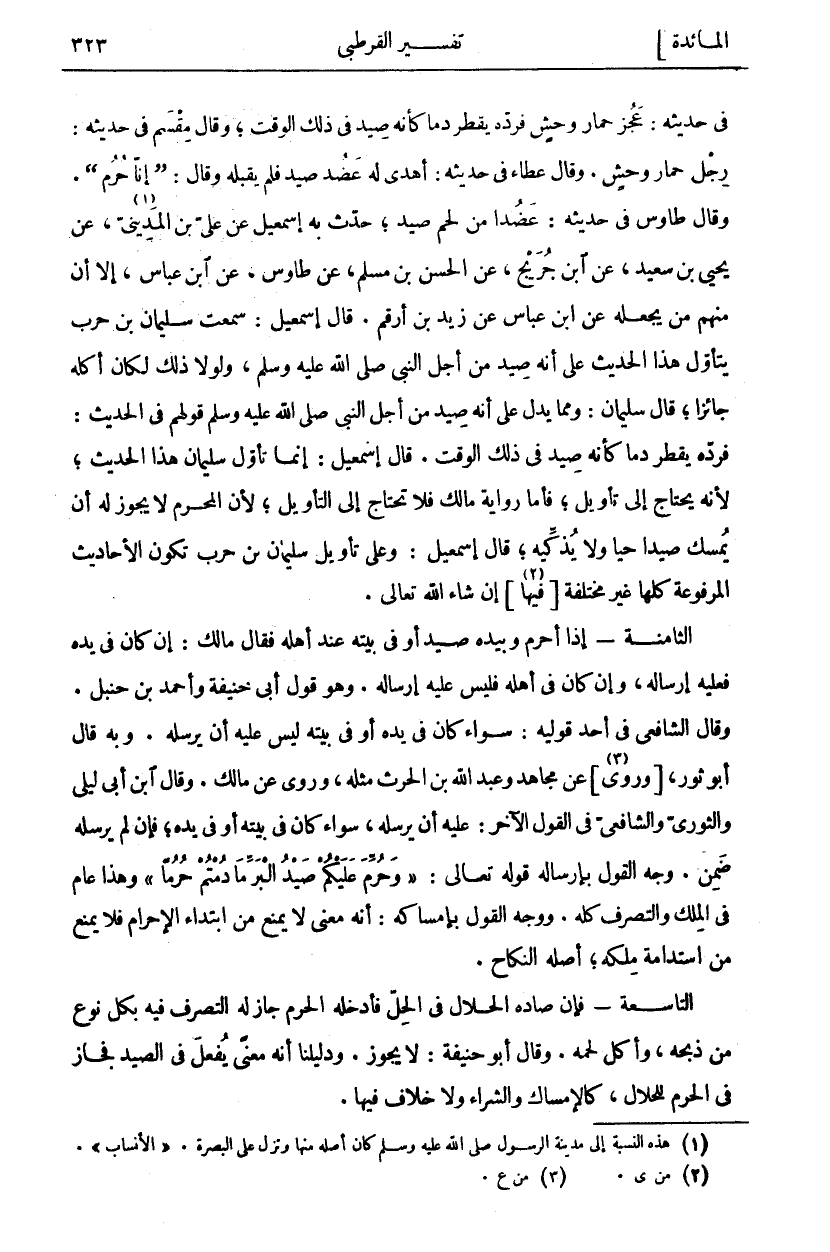 فِي حَدِيثِهِ: عَجُزَ حِمَارٍ وَحْشٍ فَرَدَّهُ يَقْطُرُ دَمًا كَأَنَّهُ صِيدَ فِي ذَلِكَ الْوَقْتِ، وَقَالَ مِقْسَمٌ فِي حَدِيثِهِ رِجْلَ حِمَارِ وَحْشٍ. وَقَالَ عَطَاءٌ فِي حَدِيثِهِ: أَهْدَى لَهُ عَضُدَ صَيْدٍ فَلَمْ يَقْبَلْهُ وَقَالَ: [إِنَّا حُرُمٌ]. وَقَالَ طَاوُسٌ فِي حَدِيثِهِ: عَضُدًا مِنْ لَحْمِ صَيْدٍ، حَدَّثَ بِهِ إِسْمَاعِيلُ عَنْ عَلِيِّ بْنِ الْمَدِينِيِّ «١»، عَنْ يَحْيَى بْنِ سَعِيدٍ عَنِ ابْنِ جُرَيْجٍ، عَنِ الْحَسَنِ بْنِ مُسْلِمٍ، عَنْ طَاوُسٍ، عَنِ ابْنِ عَبَّاسٍ، إِلَّا أَنَّ مِنْهُمْ مَنْ يَجْعَلُهُ عَنِ ابْنِ عَبَّاسٍ عَنْ زَيْدِ بْنِ أَرْقَمَ. قَالَ إِسْمَاعِيلُ: سَمِعْتُ سُلَيْمَانَ بْنَ حَرْبٍ يَتَأَوَّلُ هَذَا الْحَدِيثَ عَلَى أَنَّهُ صِيدَ مِنْ أَجْلِ النَّبِيِّ صَلَّى اللَّهُ عَلَيْهِ وَسَلَّمَ، وَلَوْلَا ذَلِكَ لَكَانَ أَكْلُهُ جَائِزًا، قَالَ سُلَيْمَانُ: وَمِمَّا يَدُلُّ عَلَى أَنَّهُ صِيدَ مِنْ أَجْلِ النَّبِيِّ صَلَّى اللَّهُ عَلَيْهِ وَسَلَّمَ قَوْلُهُمْ فِي الْحَدِيثِ: فَرَدَّهُ يَقْطُرُ دَمًا كَأَنَّهُ صِيدَ فِي ذَلِكَ الْوَقْتِ. قَالَ إِسْمَاعِيلُ: إِنَّمَا تَأَوَّلَ سُلَيْمَانُ هَذَا الْحَدِيثَ لِأَنَّهُ يَحْتَاجُ إِلَى تَأْوِيلٍ، فَأَمَّا رِوَايَةُ مَالِكٍ فَلَا تَحْتَاجُ إِلَى التَّأْوِيلِ، لِأَنَّ الْمُحْرِمَ لَا يَجُوزُ لَهُ أَنْ يُمْسِكَ صَيْدًا حَيًّا وَلَا يُذَكِّيَهُ، قَالَ إِسْمَاعِيلُ: وَعَلَى تَأْوِيلِ سُلَيْمَانَ بْنِ حَرْبٍ تَكُونُ الْأَحَادِيثُ الْمَرْفُوعَةُ كُلُّهَا غَيْرَ مُخْتَلَفَةٍ [فِيهَا] «٢» إِنْ شَاءَ اللَّهُ تَعَالَى. الثَّامِنَةُ- إِذَا أَحْرَمَ وَبِيَدِهِ صَيْدٌ أَوْ فِي بَيْتِهِ عِنْدَ أَهْلِهِ فَقَالَ مَالِكٌ: إِنْ كَانَ فِي يَدِهِ فَعَلَيْهِ إِرْسَالُهُ، وَإِنْ كَانَ فِي أَهْلِهِ فَلَيْسَ عَلَيْهِ إِرْسَالُهُ. وَهُوَ قَوْلُ أَبِي حَنِيفَةَ وَأَحْمَدَ بْنِ حَنْبَلٍ. وَقَالَ الشَّافِعِيُّ فِي أَحَدِ قَوْلَيْهِ: سَوَاءٌ كَانَ فِي يَدِهِ أَوْ فِي بَيْتِهِ لَيْسَ عَلَيْهِ أَنْ يُرْسِلَهُ. وَبِهِ قَالَ أَبُو ثَوْرٍ، [وروي «٣»] عن مجاهد وعبد الله بن الحرث مِثْلُهُ وَرُوِيَ عَنْ مَالِكٍ. وَقَالَ ابْنُ أَبِي لَيْلَى وَالثَّوْرِيُّ وَالشَّافِعِيُّ فِي الْقَوْلِ الْآخَرِ: عَلَيْهِ أَنْ يُرْسِلَهُ، سَوَاءٌ كَانَ فِي بَيْتِهِ أَوْ فِي يَدِهِ فَإِنْ لَمْ يُرْسِلْهُ ضَمِنَ. وَجْهُ الْقَوْلِ بِإِرْسَالِهِ قَوْلُهُ تَعَالَى:" وَحُرِّمَ عَلَيْكُمْ صَيْدُ الْبَرِّ مَا دُمْتُمْ حُرُماً" وَهَذَا عَامٌّ فِي الْمِلْكِ وَالتَّصَرُّفِ كُلِّهِ. وَوَجْهُ الْقَوْلِ بِإِمْسَاكِهِ: أَنَّهُ مَعْنًى لَا يَمْنَعُ مِنِ ابْتِدَاءِ الْإِحْرَامِ فَلَا يَمْنَعُ مِنِ اسْتِدَامَةِ مِلْكِهِ، أَصْلُهُ النِّكَاحُ. التَّاسِعَةُ- فَإِنْ صَادَهُ الْحَلَالُ فِي الْحِلِّ فَأَدْخَلَهُ الْحَرَمَ جَازَ لَهُ التَّصَرُّفُ فِيهِ بِكُلِّ نَوْعٍ مِنْ ذَبْحِهِ، وَأَكْلِ لَحْمِهِ. وَقَالَ أَبُو حَنِيفَةَ: لَا يَجُوزُ. وَدَلِيلُنَا أَنَّهُ مَعْنًى يُفْعَلُ فِي الصَّيْدِ فَجَازَ فِي الْحَرَمِ لِلْحَلَالِ، كَالْإِمْسَاكِ وَالشِّرَاءِ وَلَا خلاف فيها.