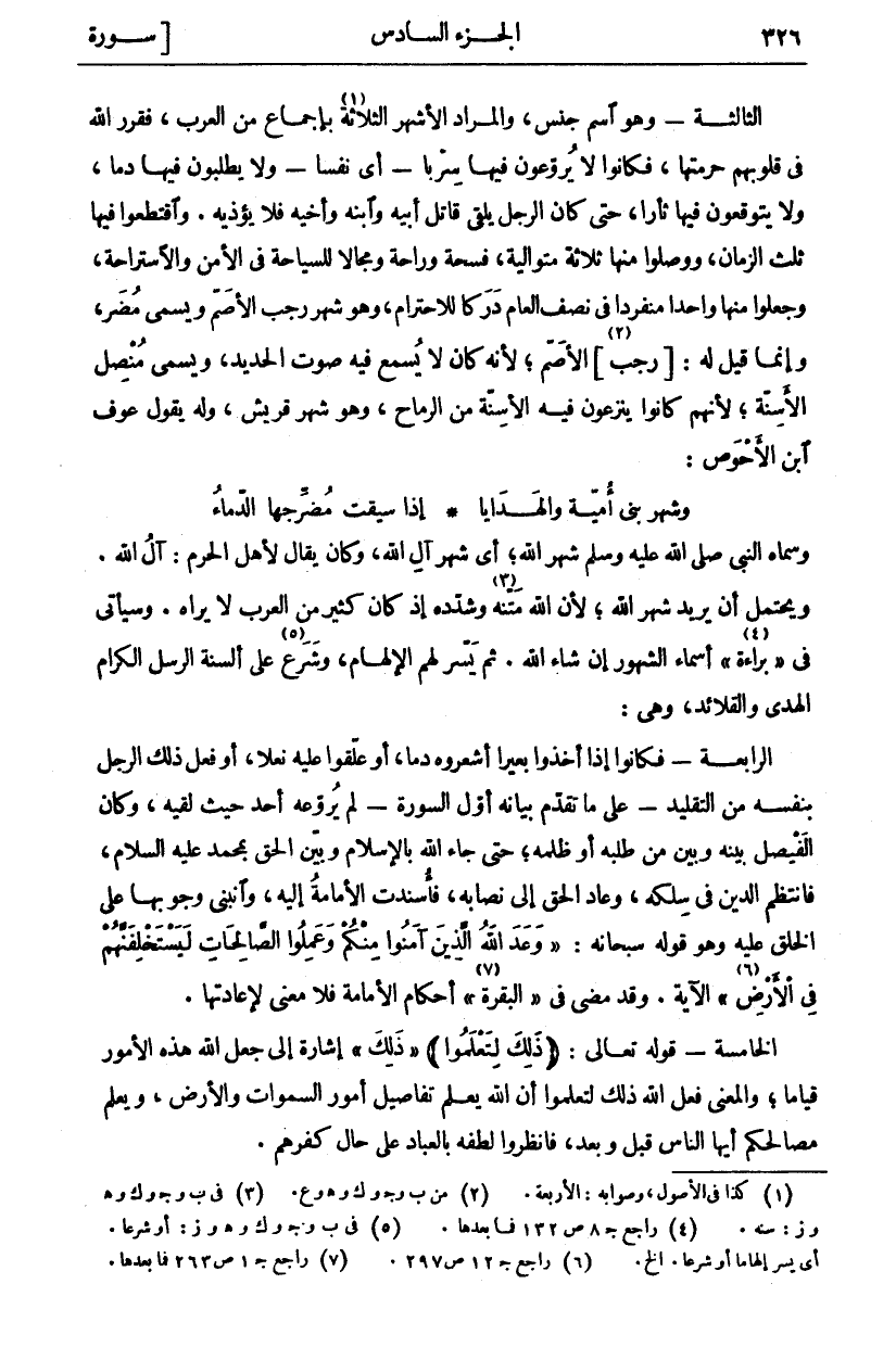 وَسَمَّاهُ النَّبِيُّ صَلَّى اللَّهُ عَلَيْهِ وَسَلَّمَ شَهْرَ اللَّهِ، أَيْ شَهْرَ آلِ اللَّهِ، وكان يقال لأهله الْحَرَمِ: آلُ اللَّهِ. وَيَحْتَمِلُ أَنْ يُرِيدَ شَهْرَ اللَّهِ، لِأَنَّ اللَّهَ مَتَّنَهُ «٣» وَشَدَّدَهُ إِذْ كَانَ كَثِيرٌ مِنَ الْعَرَبِ لَا يَرَاهُ. وَسَيَأْتِي فِي" بَرَاءَةٌ" «٤» أَسْمَاءُ الشُّهُورِ إِنْ شَاءَ اللَّهُ. ثُمَّ يَسَّرَ لَهُمُ الْإِلْهَامَ، وَشَرَعَ «٥» عَلَى أَلْسِنَةِ الرُّسُلِ الْكِرَامِ الْهَدْيَ وَالْقَلَائِدَ، وَهِيَ: الرَّابِعَةُ- فَكَانُوا إِذَا أَخَذُوا بَعِيرًا أَشْعَرُوهُ دَمًا، أَوْ عَلَّقُوا عَلَيْهِ نَعْلًا، أَوْ فَعَلَ ذَلِكَ الرَّجُلُ بِنَفْسِهِ مِنَ التَّقْلِيدِ- عَلَى مَا تَقَدَّمَ بَيَانُهُ أَوَّلَ السُّورَةِ- لَمْ يُرَوِّعْهُ أَحَدٌ حَيْثُ لَقِيَهُ، وَكَانَ الْفَيْصَلُ بَيْنَهُ وَبَيْنَ مَنْ طَلَبَهُ أَوْ ظَلَمَهُ حَتَّى جَاءَ اللَّهُ بِالْإِسْلَامِ وَبَيَّنَ الْحَقَّ بِمُحَمَّدٍ عَلَيْهِ السَّلَامُ، فَانْتَظَمَ الدِّينُ فِي سِلْكِهِ، وَعَادَ الْحَقُّ إِلَى نِصَابِهِ، فَأُسْنِدَتِ الْإِمَامَةُ إِلَيْهِ، وَانْبَنَى وُجُوبُهَا عَلَى الْخَلْقِ عَلَيْهِ وَهُوَ قَوْلُهُ سُبْحَانَهُ:" وَعَدَ اللَّهُ الَّذِينَ آمَنُوا مِنْكُمْ وَعَمِلُوا الصَّالِحاتِ لَيَسْتَخْلِفَنَّهُمْ فِي الْأَرْضِ" «٦»] النور: ٥٥] الْآيَةَ. وَقَدْ مَضَى فِي" الْبَقَرَةِ" «٧» أَحْكَامُ الْإِمَامَةِ فَلَا مَعْنَى لِإِعَادَتِهَا. الْخَامِسَةُ- قَوْلُهُ تَعَالَى: (ذلِكَ لِتَعْلَمُوا) " ذلِكَ" إِشَارَةً إِلَى جَعْلِ اللَّهِ هَذِهِ الْأُمُورَ قِيَامًا، وَالْمَعْنَى فَعَلَ اللَّهُ ذَلِكَ لِتَعْلَمُوا أن الله يعلم تفاصيل أمور السموات وَالْأَرْضِ، وَيَعْلَمُ مَصَالِحَكُمْ أَيُّهَا النَّاسُ قَبْلُ وَبَعْدُ، فانظروا لطفه بالعباد على حال كفرهم.
