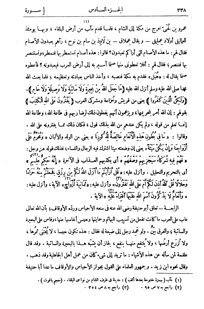 عَمْرُو بْنُ لُحَيٍّ خَرَجَ مِنْ مَكَّةَ إِلَى الشَّامِ، فَلَمَّا قَدِمَ مَآبَ «١» مِنْ أَرْضِ الْبَلْقَاءِ، وَبِهَا يَوْمَئِذٍ الْعَمَالِيقُ أَوْلَادُ عِمْلِيقَ- وَيُقَالُ عِمْلَاقُ- بْنُ لَاوَذَ بْنِ سَامِ بْنِ نُوحٍ، رَآهُمْ يَعْبُدُونَ الْأَصْنَامَ فَقَالَ لَهُمْ: مَا هَذِهِ الْأَصْنَامُ الَّتِي أَرَاكُمْ تَعْبُدُونَ؟ قَالُوا: هَذِهِ أَصْنَامٌ نَسْتَمْطِرُ بِهَا فَنُمْطَرُ، وَنَسْتَنْصِرُ بِهَا فَنُنْصَرُ، فَقَالَ لَهُمْ: أَفَلَا تُعْطُونِي مِنْهَا صَنَمًا أَسِيرُ بِهِ إِلَى أَرْضِ الْعَرَبِ فَيَعْبُدُونَهُ؟ فَأَعْطَوْهُ صَنَمًا يُقَالُ لَهُ: (هُبَلُ) فَقَدِمَ بِهِ مَكَّةَ فَنَصَبَهُ، وَأَخَذَ النَّاسُ بِعِبَادَتِهِ وَتَعْظِيمِهِ، فَلَمَّا بَعَثَ اللَّهُ مُحَمَّدًا صَلَّى اللَّهُ عَلَيْهِ وَسَلَّمَ أَنْزَلَ اللَّهُ عَلَيْهِ" مَا جَعَلَ اللَّهُ مِنْ بَحِيرَةٍ وَلا سائِبَةٍ وَلا وَصِيلَةٍ وَلا حامٍ"." وَلكِنَّ الَّذِينَ كَفَرُوا" يَعْنِي مِنْ قُرَيْشٍ وَخُزَاعَةَ وَمُشْرِكِي الْعَرَبِ" يَفْتَرُونَ عَلَى اللَّهِ الْكَذِبَ" بِقَوْلِهِمْ: إِنَّ اللَّهَ أَمَرَ بِتَحْرِيمِهَا، وَيَزْعُمُونَ أَنَّهُمْ يَفْعَلُونَ ذَلِكَ لِرِضَا رَبِّهِمْ فِي طَاعَةِ اللَّهِ، وَطَاعَةُ اللَّهِ إِنَّمَا تُعْلَمُ مِنْ قَوْلِهِ، وَلَمْ يَكُنْ عِنْدَهُمْ مِنَ اللَّهِ بِذَلِكَ قَوْلٌ، فَكَانَ ذَلِكَ مِمَّا يَفْتَرُونَهُ عَلَى اللَّهِ. وَقَالُوا:" مَا فِي بُطُونِ هذِهِ الْأَنْعامِ خالِصَةٌ لِذُكُورِنا"] الانعام: ١٣٩] يَعْنِي مِنَ الْوَلَدِ وَالْأَلْبَانِ" وَمُحَرَّمٌ عَلى أَزْواجِنا وَإِنْ يَكُنْ مَيْتَةً"] الانعام: ١٣٩] يَعْنِي إِنْ وَضَعَتْهُ مَيِّتًا اشْتَرَكَ فِيهِ الرِّجَالُ وَالنِّسَاءُ، فَذَلِكَ قَوْلُهُ عَزَّ وَجَلَّ:" فَهُمْ فِيهِ شُرَكاءُ سَيَجْزِيهِمْ وَصْفَهُمْ"] الانعام: ١٣٩] أَيْ بِكَذِبِهِمِ الْعَذَابَ فِي الْآخِرَةِ" إِنَّهُ حَكِيمٌ عَلِيمٌ" «٢»] الانعام: ١٣٩] أَيْ بِالتَّحْرِيمِ وَالتَّحْلِيلِ. وَأَنْزَلَ عَلَيْهِ:" قُلْ أَرَأَيْتُمْ مَا أَنْزَلَ اللَّهُ لَكُمْ مِنْ رِزْقٍ فَجَعَلْتُمْ مِنْهُ حَراماً وَحَلالًا قُلْ آللَّهُ أَذِنَ لَكُمْ أَمْ عَلَى اللَّهِ تَفْتَرُونَ" «٣»] يونس: ٥٩] وأنزل عليه:" ثَمانِيَةَ أَزْواجٍ" «٤»] الانعام: ١٤٣] وَأَنْزَلَ عَلَيْهِ:" وَأَنْعامٌ لَا يَذْكُرُونَ اسْمَ اللَّهِ عَلَيْهَا افْتِراءً عَلَيْهِ" «٥»] الانعام: ١٣٨] الْآيَةَ. الرَّابِعَةُ- تَعَلَّقَ أَبُو حَنِيفَةَ رَضِيَ اللَّهُ عَنْهُ فِي مَنْعِهِ الْأَحْبَاسَ وَرَدِّهِ الْأَوْقَافَ، بِأَنَّ اللَّهَ تَعَالَى عَابَ عَلَى الْعَرَبِ مَا كَانَتْ تَفْعَلُهُ مِنْ تَسْيِيبِ الْبَهَائِمِ وَحِمَايَتِهَا وَحَبْسِ أَنْفَاسِهَا عَنْهَا، وَقَاسَ عَلَى الْبَحِيرَةِ وَالسَّائِبَةِ وَالْفَرْقِ بَيِّنٌ. وَلَوْ عَمَدَ رَجُلٌ إِلَى ضَيْعَةٍ لَهُ فَقَالَ: هَذِهِ تَكُونُ حَبْسًا، لَا يُجْتَنَى ثَمَرُهَا، وَلَا تُزْرَعُ أَرْضُهَا، وَلَا يُنْتَفَعُ مِنْهَا بِنَفْعٍ، لَجَازَ أَنْ يُشَبَّهَ هَذَا بِالْبَحِيرَةِ وَالسَّائِبَةِ. وَقَدْ قَالَ عَلْقَمَةُ لِمَنْ سَأَلَهُ عَنْ هَذِهِ الْأَشْيَاءِ: مَا تريد إلى شي كان من عمل أهله الْجَاهِلِيَّةِ وَقَدْ ذَهَبَ. وَقَالَ نَحْوَهُ ابْنُ زَيْدٍ. وَجُمْهُورُ الْعُلَمَاءِ عَلَى الْقَوْلِ بِجَوَازِ الْأَحْبَاسِ وَالْأَوْقَافِ ما عدا أبا حنيفة