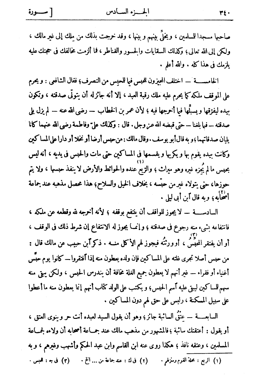 صَاحِبُهَا مَسْجِدًا لِلْمُسْلِمِينَ، وَيُخَلِّي بَيْنَهُمْ وَبَيْنَهَا، وَقَدْ خَرَجَتْ بِذَلِكَ مِنْ مِلْكٍ إِلَى غَيْرِ مَالِكٍ، وَلَكِنْ إِلَى اللَّهِ تَعَالَى، وَكَذَلِكَ السِّقَايَاتُ وَالْجُسُورُ وَالْقَنَاطِرُ، فَمَا أَلْزَمْتَ مُخَالِفَكَ فِي حُجَّتِكَ عَلَيْهِ يَلْزَمُكَ فِي هَذَا كُلِّهِ. وَاللَّهُ أَعْلَمُ. الْخَامِسَةُ- اخْتَلَفَ الْمُجِيزُونَ لِلْحَبْسِ فِيمَا لِلْمُحَبِّسِ مِنَ التَّصَرُّفِ، فَقَالَ الشَّافِعِيُّ: وَيَحْرُمُ عَلَى الْمُوقِفِ مِلْكَهُ كَمَا يَحْرُمُ عَلَيْهِ مِلْكُ رَقَبَةِ الْعَبْدِ، إِلَّا أَنَّهُ جَائِزٌ لَهُ أَنْ يَتَوَلَّى صَدَقَتَهُ، وَتَكُونُ بِيَدِهِ ليفرقها ويسلبها فِيمَا أَخْرَجَهَا فِيهِ، لِأَنَّ عُمَرَ بْنَ الْخَطَّابِ- رَضِيَ اللَّهُ عَنْهُ- لَمْ يَزَلْ يَلِي صَدَقَتَهُ- فِيمَا بَلَغَنَا- حَتَّى قَبَضَهُ اللَّهُ عَزَّ وَجَلَّ قَالَ: وَكَذَلِكَ عَلِيٌّ وَفَاطِمَةُ رَضِيَ اللَّهُ عَنْهُمَا كَانَا يَلِيَانِ صَدَقَاتِهِمَا، وَبِهِ قَالَ أَبُو يُوسُفَ وَقَالَ مَالِكٌ: مَنْ حَبَسَ أَرْضًا أَوْ نَخْلًا أَوْ دَارًا عَلَى الْمَسَاكِينِ وَكَانَتْ بِيَدِهِ يَقُومُ بِهَا وَيُكْرِيهَا وَيُقَسِّمُهَا فِي الْمَسَاكِينِ حَتَّى مَاتَ وَالْحَبْسُ فِي يَدَيْهِ، أَنَّهُ لَيْسَ بِحَبْسٍ مَا لَمْ يُجِزْهُ غَيْرُهُ وَهُوَ مِيرَاثٌ، وَالرَّبْعُ «١» عِنْدَهُ وَالْحَوَائِطُ وَالْأَرْضُ لَا يَنْفُذُ حَبْسُهَا، وَلَا يَتِمُّ حَوْزُهَا، حَتَّى يَتَوَلَّاهُ غَيْرُ مَنْ حَبَّسَهُ، بِخِلَافِ الْخَيْلِ وَالسِّلَاحِ، هَذَا مُحَصَّلُ مَذْهَبِهِ عِنْدَ جَمَاعَةِ أَصْحَابِهِ «٢»، وَبِهِ قَالَ ابْنُ أَبِي لَيْلَى. السَّادِسَةُ- لَا يَجُوزُ لِلْوَاقِفِ أَنْ يَنْتَفِعَ بِوَقْفِهِ، لِأَنَّهُ أَخْرَجَهُ لِلَّهِ وَقَطَعَهُ عَنْ مِلْكِهِ، فَانْتِفَاعُهُ بِشَيْءٍ مِنْهُ رُجُوعٌ فِي صَدَقَتِهِ، وَإِنَّمَا يَجُوزُ لَهُ الِانْتِفَاعُ إِنْ شَرَطَ ذَلِكَ فِي الْوَقْفِ، أَوْ أَنْ يَفْتَقِرَ الْمُحَبِّسُ «٣»، أَوْ وَرَثَتُهُ فَيَجُوزُ لَهُمُ الْأَكْلُ مِنْهُ. ذَكَرَ ابْنُ حَبِيبٍ عَنْ مَالِكٍ قَالَ: مَنْ حَبَّسَ أَصْلًا تَجْرِي غَلَّتُهُ عَلَى الْمَسَاكِينِ فَإِنَّ وَلَدَهُ يُعْطَوْنَ مِنْهُ إِذَا افْتَقَرُوا- كَانُوا يَوْمَ حَبَّسَ أَغْنِيَاءَ أَوْ فُقَرَاءَ- غَيْرَ أَنَّهُمْ لَا يُعْطَوْنَ جَمِيعَ الْغَلَّةِ مَخَافَةَ أَنْ يَنْدَرِسَ الْحَبْسُ وَلَكِنْ يَبْقَى مِنْهُ سَهْمٌ لِلْمَسَاكِينِ لِيَبْقَى عَلَيْهِ اسْمُ الْحَبْسِ، وَيُكْتَبُ عَلَى الْوَلَدِ كِتَابٌ أَنَّهُمْ إِنَّمَا يُعْطَوْنَ مِنْهُ مَا أُعْطُوا عَلَى سَبِيلِ الْمَسْكَنَةِ، وَلَيْسَ عَلَى حَقٍّ لَهُمْ دُونَ الْمَسَاكِينِ. السَّابِعَةُ- عِتْقُ السَّائِبَةِ جَائِزٌ، وَهُوَ أَنْ يَقُولَ السَّيِّدُ لِعَبْدِهِ أَنْتَ حُرٌّ وَيَنْوِي الْعِتْقَ، أَوْ يَقُولُ: أَعْتَقْتُكَ سَائِبَةً، فَالْمَشْهُورُ مِنْ مَذْهَبِ مَالِكٍ عِنْدَ جَمَاعَةِ أَصْحَابِهِ أَنَّ وَلَاءَهُ لِجَمَاعَةِ الْمُسْلِمِينَ، وَعِتْقَهُ نَافِذٌ، هَكَذَا رَوَى عَنْهُ ابْنُ الْقَاسِمِ وَابْنُ عَبْدِ الْحَكَمِ وَأَشْهَبُ وَغَيْرُهُمْ، وبه
