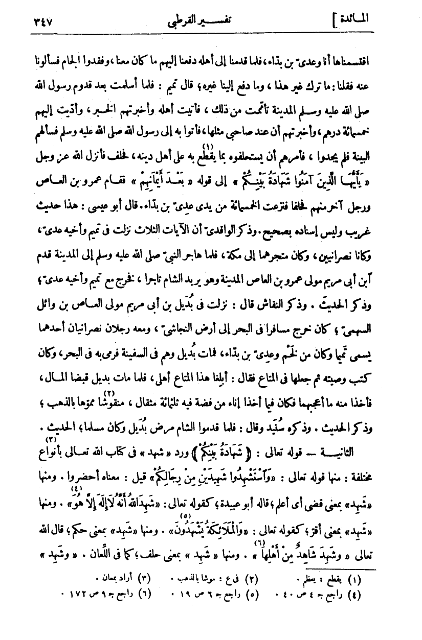 اقْتَسَمْنَاهَا أَنَا وَعَدِيُّ بْنُ بَدَّاءَ، فَلَمَّا قَدِمْنَا إِلَى أَهْلِهِ دَفَعْنَا إِلَيْهِمْ مَا كَانَ مَعَنَا، وَفَقَدُوا الْجَامَ فَسَأَلُونَا عَنْهُ فَقُلْنَا: مَا تَرَكَ غَيْرَ هَذَا، وَمَا دَفَعَ إِلَيْنَا غَيْرَهُ، قَالَ تَمِيمٌ: فَلَمَّا أَسْلَمْتُ بَعْدَ قُدُومِ رَسُولُ اللَّهِ صَلَّى اللَّهُ عَلَيْهِ وَسَلَّمَ الْمَدِينَةَ تَأَثَّمْتُ مِنْ ذَلِكَ، فَأَتَيْتُ أَهْلَهُ وَأَخْبَرْتُهُمُ الْخَبَرَ، وَأَدَّيْتُ إِلَيْهِمْ خَمْسَمِائَةِ دِرْهَمٍ، وَأَخْبَرْتُهُمْ أَنَّ عِنْدَ صَاحِبِي مِثْلَهَا، فَأَتَوْا بِهِ إِلَى رَسُولِ اللَّهِ صَلَّى اللَّهُ عَلَيْهِ وَسَلَّمَ فَسَأَلَهُمُ الْبَيِّنَةَ فَلَمْ يَجِدُوا، فَأَمَرَهُمْ أَنْ يَسْتَحْلِفُوهُ بِمَا يُقْطَعُ «١» بِهِ عَلَى أَهْلِ دِينِهِ، فَحَلَفَ فَأَنْزَلَ اللَّهُ عَزَّ وَجَلَّ:" يَا أَيُّهَا الَّذِينَ آمَنُوا شَهادَةُ بَيْنِكُمْ" إِلَى قَوْلِهِ" بَعْدَ أَيْمانِهِمْ" فَقَامَ عَمْرُو بْنُ الْعَاصِ وَرَجُلٌ آخَرُ مِنْهُمْ فَحَلَفَا فَنُزِعَتِ الْخَمْسُمِائَةِ مِنْ يَدَيْ عَدِيِّ بْنِ بَدَّاءَ. قَالَ أَبُو عِيسَى: هَذَا حَدِيثٌ غَرِيبٌ وَلَيْسَ إِسْنَادُهُ بِصَحِيحٍ. وَذَكَرَ الْوَاقِدِيُّ أَنَّ الْآيَاتِ الثَّلَاثَ نَزَلَتْ فِي تَمِيمٍ وَأَخِيهِ عَدِيٍّ، وَكَانَا نَصْرَانِيَّيْنِ، وَكَانَ مَتْجَرُهُمَا إِلَى مَكَّةَ، فَلَمَّا هَاجَرَ النَّبِيُّ صَلَّى اللَّهُ عَلَيْهِ وَسَلَّمَ إِلَى الْمَدِينَةِ قَدِمَ ابْنُ أَبِي مَرْيَمَ مَوْلَى عَمْرِو بْنِ الْعَاصِ الْمَدِينَةَ وَهُوَ يُرِيدُ الشَّامَ تَاجِرًا، فَخَرَجَ مَعَ تَمِيمٍ وَأَخِيهِ عَدِيٍّ، وَذَكَرَ الْحَدِيثَ. وَذَكَرَ النَّقَّاشُ قَالَ: نَزَلَتْ فِي بُدَيْلِ بْنِ أَبِي مَرْيَمَ مَوْلَى الْعَاصِ بْنِ وَائِلِ السَّهْمِيِّ، كَانَ خَرَجَ مُسَافِرًا فِي الْبَحْرِ إِلَى أَرْضِ النَّجَاشِيِّ، وَمَعَهُ رَجُلَانِ نَصْرَانِيَّانِ أَحَدُهُمَا يُسَمَّى تَمِيمًا وَكَانَ مِنْ لَخْمٍ وَعَدِيِّ بْنِ بَدَّاءَ، فَمَاتَ بُدَيْلٌ وَهُمْ فِي السَّفِينَةِ فَرُمِيَ بِهِ فِي الْبَحْرِ، وَكَانَ كَتَبَ وَصِيَّتَهُ ثُمَّ جَعَلَهَا فِي الْمَتَاعِ فَقَالَ: أَبْلِغَا هَذَا الْمَتَاعَ أَهْلِيَ، فَلَمَّا مَاتَ بُدَيْلٌ قَبَضَا الْمَالَ، فَأَخَذَا مِنْهُ مَا أَعْجَبَهُمَا فَكَانَ فِيمَا أَخَذَا إِنَاءً مِنْ فِضَّةٍ فِيهِ ثَلَاثُمِائَةِ مِثْقَالٍ، مَنْقُوشًا «٢» مُمَوَّهًا بِالذَّهَبِ، وَذَكَرَ الْحَدِيثَ. وَذَكَرَهُ سُنَيْدٌ وَقَالَ: فَلَمَّا قَدِمُوا الشَّامَ مَرِضَ بُدَيْلٌ وَكَانَ مُسْلِمًا، الْحَدِيثَ. الثَّانِيَةُ- وَقَوْلُهُ تَعَالَى:" شَهادَةُ بَيْنِكُمْ" وَرَدَ" شَهِدَ" فِي كِتَابِ اللَّهِ تَعَالَى بِأَنْوَاعٍ «٣» مُخْتَلِفَةٍ: مِنْهَا قَوْلُهُ تعالى:" وَاسْتَشْهِدُوا شَهِيدَيْنِ مِنْ رِجالِكُمْ"] البقرة: ٢٨٢] قِيلَ: مَعْنَاهُ أَحْضِرُوا. وَمِنْهَا" شَهِدَ" بِمَعْنَى قَضَى أَيْ أَعْلَمَ، قَالَهُ أَبُو عُبَيْدَةَ كَقَوْلِهِ تَعَالَى:" شَهِدَ اللَّهُ أَنَّهُ لَا إِلهَ إِلَّا هُوَ" «٤»] آل عمران: ١٨]. وَمِنْهَا" شَهِدَ" بِمَعْنَى أَقَرَّ، كَقَوْلِهِ تَعَالَى:" وَالْمَلائِكَةُ يَشْهَدُونَ" «٥»] النساء: ١٦٦]. وَمِنْهَا" شَهِدَ" بِمَعْنَى حَكَمَ، قَالَ اللَّهُ تَعَالَى:" وَشَهِدَ شاهِدٌ مِنْ أَهْلِها" «٦»] يوسف: ٢٦]. وَمِنْهَا" شَهِدَ" بِمَعْنَى حَلَفَ، كَمَا فِي اللِّعَانِ." وشهد"
