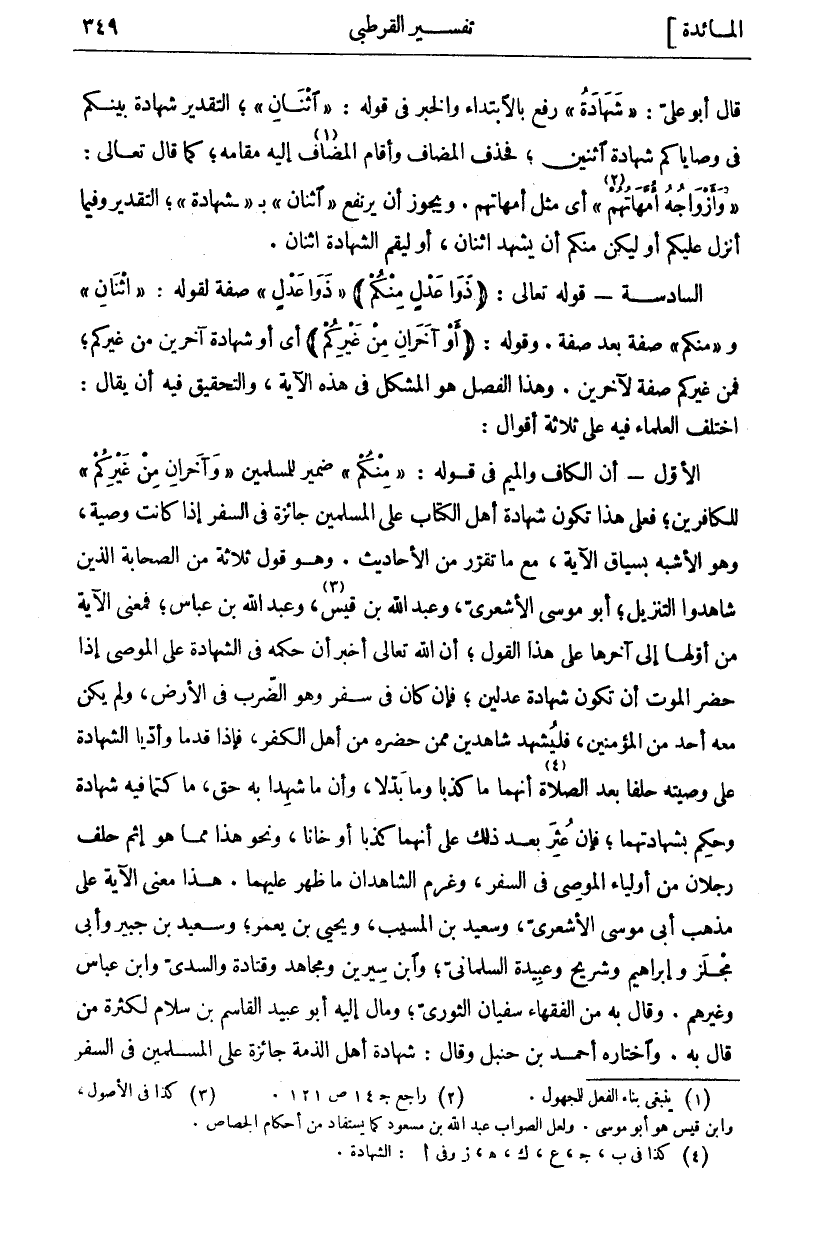 قَالَ أَبُو عَلِيٍّ" شَهادَةُ" رَفْعٌ بِالِابْتِدَاءِ وَالْخَبَرُ فِي قَوْلِهِ:" اثْنانِ" التَّقْدِيرُ شَهَادَةُ بَيْنِكُمْ فِي وَصَايَاكُمْ شَهَادَةُ اثْنَيْنِ، فَحَذَفَ الْمُضَافَ وَأَقَامَ الْمُضَافَ «١» إِلَيْهِ مَقَامَهُ، كَمَا قَالَ تَعَالَى:" وَأَزْواجُهُ أُمَّهاتُهُمْ" «٢»] الأحزاب: ٦] أَيْ مِثْلُ أُمَّهَاتِهِمْ. وَيَجُوزُ أَنْ يَرْتَفِعَ" اثْنانِ" بِ"- شَهادَةُ"، التَّقْدِيرُ وَفِيمَا أُنْزِلَ عَلَيْكُمْ أَوْ لِيَكُنْ مِنْكُمْ أَنْ يَشْهَدَ اثْنَانِ، أَوْ لِيُقِمِ الشَّهَادَةُ اثْنَانِ. السَّادِسَةُ- قَوْلُهُ تَعَالَى: (ذَوا عَدْلٍ مِنْكُمْ) " ذَوا عَدْلٍ" صِفَةٌ لِقَوْلِهِ:" اثْنانِ" وَ" مِنْكُمْ" صِفَةٌ بَعْدَ صِفَةٍ. وَقَوْلُهُ:" أَوْ آخَرانِ مِنْ غَيْرِكُمْ" أَيْ أَوْ شَهَادَةُ آخَرَيْنِ مِنْ غَيْرِكُمْ، فَمِنْ غَيْرِكُمْ صِفَةٌ لِآخَرَيْنِ. وَهَذَا الْفَصْلُ هُوَ الْمُشْكِلُ فِي هَذِهِ الْآيَةِ، وَالتَّحْقِيقُ فِيهِ أَنْ يُقَالَ: اخْتَلَفَ الْعُلَمَاءُ فِيهِ عَلَى ثَلَاثَةِ أَقْوَالٍ: الْأَوَّلُ- أَنَّ الْكَافَ وَالْمِيمَ فِي قَوْلِهِ:" مِنْكُمْ" ضَمِيرٌ لِلْمُسْلِمِينَ" أَوْ- آخَرانِ مِنْ غَيْرِكُمْ" لِلْكَافِرِينَ فَعَلَى هَذَا تَكُونُ شَهَادَةُ أَهْلِ الْكِتَابِ عَلَى الْمُسْلِمِينَ جَائِزَةً فِي السَّفَرِ إِذَا كَانَتْ وَصِيَّةً، وَهُوَ الْأَشْبَهُ بِسِيَاقِ الْآيَةِ، مَعَ مَا تَقَرَّرَ مِنَ الْأَحَادِيثِ. وَهُوَ قَوْلُ ثَلَاثَةٍ مِنَ الصَّحَابَةِ الَّذِينَ شَاهَدُوا التَّنْزِيلَ، أَبُو مُوسَى الْأَشْعَرِيُّ وَعَبْدُ اللَّهِ بْنُ قَيْسٍ «٣»، وَعَبْدُ اللَّهِ بْنُ عَبَّاسٍ فَمَعْنَى الْآيَةِ مِنْ أَوَّلِهَا إِلَى آخِرِهَا عَلَى هَذَا الْقَوْلِ أَنَّ اللَّهَ تَعَالَى أَخْبَرَ أَنَّ حُكْمَهُ فِي الشَّهَادَةِ عَلَى الْمُوصِي إِذَا حَضَرَ الْمَوْتُ أَنْ تَكُونَ شَهَادَةَ عَدْلَيْنِ فَإِنْ كَانَ فِي سَفَرٍ وَهُوَ الضَّرْبُ فِي الْأَرْضِ، وَلَمْ يَكُنْ مَعَهُ أَحَدٌ مِنَ الْمُؤْمِنِينَ، فَلْيُشْهِدْ شَاهِدَيْنِ مِمَّنْ حَضَرَهُ مِنْ أَهْلِ الْكُفْرِ، فَإِذَا قَدِمَا وَأَدَّيَا الشَّهَادَةَ عَلَى وَصِيَّتِهِ حَلَفَا بَعْدَ الصَّلَاةِ «٤» أَنَّهُمَا مَا كَذَبَا وَمَا بَدَّلَا، وَأَنَّ مَا شَهِدَا بِهِ حَقٌّ، مَا كَتَمَا فِيهِ شَهَادَةً وَحُكِمَ بِشَهَادَتِهِمَا، فَإِنْ عُثِرَ بَعْدَ ذَلِكَ عَلَى أَنَّهُمَا كَذَبَا أَوْ خَانَا، وَنَحْوَ هَذَا مِمَّا هُوَ إِثْمٌ حَلَفَ رَجُلَانِ مِنْ أَوْلِيَاءِ الْمُوصِي فِي السَّفَرِ، وَغَرِمَ الشَّاهِدَانِ مَا ظَهَرَ عَلَيْهِمَا. هَذَا مَعْنَى الْآيَةِ عَلَى مَذْهَبِ أَبِي مُوسَى الْأَشْعَرِيِّ، وَسَعِيدِ بْنِ الْمُسَيَّبِ، وَيَحْيَى بْنِ يَعْمُرَ، وَسَعِيدِ بْنِ جُبَيْرٍ وَأَبِي مِجْلَزٍ وَإِبْرَاهِيمَ وَشُرَيْحٍ وَعَبِيدَةَ السَّلْمَانِيِّ، وَابْنِ سِيرِينَ وَمُجَاهِدٍ وَقَتَادَةَ وَالسُّدِّيِّ وَابْنِ عَبَّاسٍ وَغَيْرِهِمْ. وَقَالَ بِهِ مِنَ الْفُقَهَاءِ سُفْيَانُ الثَّوْرِيُّ، وَمَالَ إِلَيْهِ أَبُو عُبَيْدِ الْقَاسِمِ بْنُ سَلَّامٍ لِكَثْرَةِ مَنْ قَالَ بِهِ. وَاخْتَارَهُ أَحْمَدُ بْنُ حَنْبَلٍ وَقَالَ: شَهَادَةُ أَهْلِ الذمة جائزة على المسلمين في السفر
