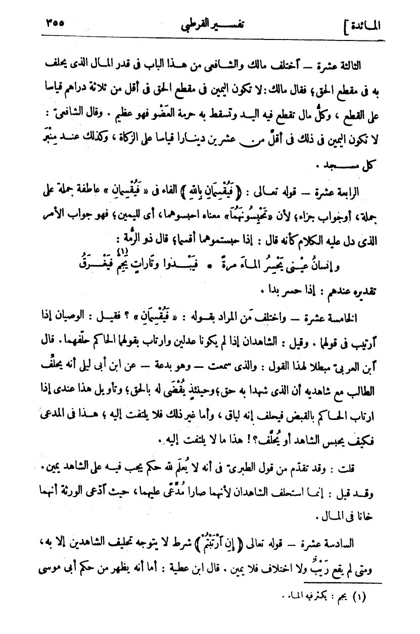 الثَّالِثَةَ عَشْرَةَ- اخْتَلَفَ مَالِكٌ وَالشَّافِعِيُّ مِنْ هَذَا الْبَابِ فِي قَدْرِ الْمَالِ الَّذِي يُحَلَّفُ بِهِ فِي مَقْطَعِ الْحَقِّ، فَقَالَ مَالِكٌ: لَا تَكُونُ الْيَمِينُ فِي مَقْطَعِ الْحَقِّ فِي أَقَلِّ مِنْ ثَلَاثَةِ دَرَاهِمَ قِيَاسًا عَلَى الْقَطْعِ، وَكُلُّ مَالٍ تُقْطَعُ فِيهِ الْيَدُ وَتَسْقُطُ بِهِ حُرْمَةُ الْعُضْوِ فَهُوَ عَظِيمٌ. وَقَالَ الشَّافِعِيُّ: لَا تَكُونُ الْيَمِينُ فِي ذَلِكَ فِي أَقَلِّ مِنْ عِشْرِينَ دِينَارًا قِيَاسًا عَلَى الزَّكَاةِ، وَكَذَلِكَ عِنْدَ مِنْبَرِ كُلِّ مَسْجِدٍ. الرَّابِعَةَ عَشْرَةَ- قَوْلُهُ تَعَالَى: (فَيُقْسِمانِ بِاللَّهِ) الْفَاءُ فِي" فَيُقْسِمانِ" عَاطِفَةُ جُمْلَةٍ عَلَى جُمْلَةٍ، أو جواب جزاء، لان" تَحْبِسُونَهُما" مَعْنَاهُ احْبِسُوهُمَا، أَيْ لِلْيَمِينِ، فَهُوَ جَوَابُ الْأَمْرِ الَّذِي دَلَّ عَلَيْهِ الْكَلَامُ كَأَنَّهُ قَالَ: إِذَا حَبَسْتُمُوهُمَا أَقْسَمَا، قَالَ ذُو الرُّمَّةِ: