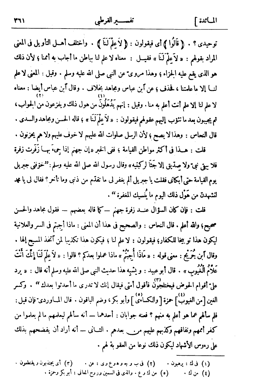 تَوْحِيدِي؟ " قالُوا" أَيْ فَيَقُولُونَ:" لَا عِلْمَ لَنا" وَاخْتَلَفَ أَهْلُ التَّأْوِيلِ فِي الْمَعْنَى الْمُرَادِ بِقَوْلِهِمْ:" لَا عِلْمَ لَنا" فَقِيلَ: مَعْنَاهُ لَا عِلْمَ لَنَا بِبَاطِنِ مَا أَجَابَ بِهِ أُمَمُنَا، لِأَنَّ ذَلِكَ هُوَ الَّذِي يَقَعُ عَلَيْهِ الْجَزَاءُ، وَهَذَا مَرْوِيٌّ عَنِ النَّبِيِّ صَلَّى اللَّهُ عَلَيْهِ وَسَلَّمَ. وَقِيلَ: الْمَعْنَى لَا عِلْمَ لَنَا إِلَّا مَا عَلَّمْتَنَا، فَحُذِفَ، عَنِ ابْنِ عَبَّاسٍ وَمُجَاهِدٍ بِخِلَافٍ. وَقَالَ ابْنُ عَبَّاسٍ أَيْضًا: مَعْنَاهُ لَا عِلْمَ لنا إلا علم أَنْتَ أَعْلَمُ بِهِ مِنَّا. وَقِيلَ: إِنَّهُمْ يَذْهَلُونَ «١» مِنْ هَوْلِ ذَلِكَ وَيَفْزَعُونَ مِنَ «٢» الْجَوَابِ، ثُمَّ يجيبون بعد ما تَثُوبُ إِلَيْهِمْ عُقُولُهُمْ فَيَقُولُونَ:" لَا عِلْمَ لَنا" قاله الحسن وَمُجَاهِدٌ وَالسُّدِّيُّ. قَالَ النَّحَّاسُ: وَهَذَا لَا يَصِحُّ، لِأَنَّ الرُّسُلَ صَلَوَاتُ اللَّهِ عَلَيْهِمْ لَا خَوْفٌ عَلَيْهِمْ وَلَا هُمْ يَحْزَنُونَ. قُلْتُ: هَذَا فِي أَكْثَرِ مَوَاطِنَ الْقِيَامَةِ، فَفِي الْخَبَرِ] إِنَّ جَهَنَّمَ إذا جئ بِهَا زَفَرَتْ زَفْرَةً فَلَا يَبْقَى نَبِيٌّ وَلَا صِدِّيقٌ إِلَّا جَثَا لِرُكْبَتَيْهِ [وَقَالَ رَسُولُ اللَّهِ صَلَّى اللَّهُ عَلَيْهِ وَسَلَّمَ:] خَوَّفَنِي جِبْرِيلُ يَوْمَ الْقِيَامَةِ حَتَّى أَبْكَانِي فَقُلْتُ يَا جِبْرِيلُ أَلَمْ يُغْفَرْ لِي مَا تَقَدَّمَ مِنْ ذَنْبِي وَمَا تَأَخَّرَ؟ فَقَالَ لِي يَا مُحَمَّدُ لَتَشْهَدَنَّ مِنْ هَوْلِ ذَلِكَ الْيَوْمَ مَا يُنْسِيكَ الْمَغْفِرَةَ [. قُلْتُ: فَإِنْ كَانَ السُّؤَالُ عِنْدَ زَفْرَةِ جَهَنَّمَ- كَمَا قاله بَعْضُهُمْ- فَقَوْلُ مُجَاهِدٍ وَالْحَسَنِ صَحِيحٌ، وَاللَّهُ أَعْلَمُ. قَالَ النَّحَّاسُ: وَالصَّحِيحُ فِي هَذَا أَنَّ الْمَعْنَى: مَاذَا أُجِبْتُمْ فِي السِّرِّ وَالْعَلَانِيَةِ لِيَكُونَ هَذَا تَوْبِيخًا لِلْكُفَّارِ، فَيَقُولُونَ: لَا عِلْمَ لَنَا، فَيَكُونُ هَذَا تَكْذِيبًا لِمَنِ اتَّخَذَ الْمَسِيحَ إِلَهًا. وَقَالَ ابْنُ جُرَيْجٍ: مَعْنَى قَوْلِهِ:" مَاذَا أُجِبْتُمْ" مَاذَا عَمِلُوا بَعْدَكُمْ؟ قَالُوا:" لَا عِلْمَ لَنا إِنَّكَ أَنْتَ عَلَّامُ الْغُيُوبِ". قَالَ أَبُو عُبَيْدٍ: وَيُشْبِهُ هَذَا حَدِيثَ النَّبِيِّ صَلَّى اللَّهُ عَلَيْهِ وَسَلَّمَ أَنَّهُ قَالَ:] يَرِدُ عَلَيَّ أَقْوَامٌ الْحَوْضَ فَيَخْتَلِجُونَ «٣» فَأَقُولُ أُمَّتِي فَيُقَالُ إِنَّكَ لَا تَدْرِي مَا أَحْدَثُوا بَعْدَكَ [. وَكَسَرَ الْغَيْنَ [مِنَ الْغُيُوبِ] «٤» حَمْزَةُ [وَالْكِسَائِيُّ] «٥» وَأَبُو بَكْرٍ، وَضَمَّ الْبَاقُونَ. قَالَ الْمَاوَرْدِيُّ فَإِنْ قِيلَ: فَلِمَ سَأَلَهُمْ عَمَّا هُوَ أَعْلَمُ بِهِ مِنْهُمْ؟ فَعَنْهُ جَوَابَانِ: أَحَدُهُمَا- أَنَّهُ سَأَلَهُمْ لِيُعْلِمَهُمْ مَا لَمْ يَعْلَمُوا مِنْ كُفْرِ أُمَمِهِمْ وَنِفَاقِهِمْ وَكَذِبِهِمْ عَلَيْهِمْ مِنْ بَعْدِهِمْ. الثَّانِي- أَنَّهُ أَرَادَ أَنْ يَفْضَحَهُمْ بِذَلِكَ عَلَى رُءُوسِ الْأَشْهَادِ ليكون ذلك نوعا من العقوبة لهم.