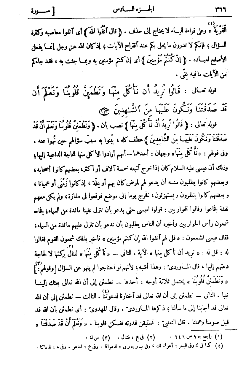 قَوْلُهُ تَعَالَى:" قالُوا نُرِيدُ أَنْ نَأْكُلَ مِنْها" نُصِبَ بِأَنْ" وَتَطْمَئِنَّ قُلُوبُنا وَنَعْلَمَ أَنْ قَدْ صَدَقْتَنا وَنَكُونَ عَلَيْها مِنَ الشَّاهِدِينَ" عَطْفٌ كُلُّهُ، بَيَّنُوا بِهِ سَبَبَ سُؤَالِهِمْ حِينَ نُهُوا عَنْهُ. وَفِي قَوْلِهِمْ:" نَأْكُلَ مِنْها" وَجْهَانِ: أَحَدُهُمَا- أَنَّهُمْ أَرَادُوا الْأَكْلَ مِنْهَا لِلْحَاجَةِ الدَّاعِيَةِ إِلَيْهَا، وَذَلِكَ أَنَّ عِيسَى عَلَيْهِ السَّلَامُ كَانَ إِذَا خَرَجَ اتَّبَعَهُ خَمْسَةُ آلَافٍ أَوْ أَكْثَرُ، بَعْضُهُمْ كَانُوا أَصْحَابَهُ وَبَعْضُهُمْ كَانُوا يَطْلُبُونَ مِنْهُ أَنْ يَدْعُوَ لَهُمْ لِمَرَضٍ كَانَ بِهِمْ أَوْ عِلَّةٍ، إِذْ كَانُوا زَمْنَى أَوْ عُمْيَانًا، وَبَعْضُهُمْ كَانُوا يَنْظُرُونَ وَيَسْتَهْزِئُونَ فَخَرَجَ يَوْمًا إِلَى مَوْضِعٍ فَوَقَعُوا فِي مَفَازَةٍ وَلَمْ يَكُنْ مَعَهُمْ نَفَقَةٌ فَجَاعُوا وَقَالُوا لِلْحَوَارِيِّينَ: قُولُوا لِعِيسَى حَتَّى يَدْعُوَ بِأَنْ تُنَزَّلَ عَلَيْنَا مَائِدَةٌ مِنَ السَّمَاءِ، فَجَاءَهُ شَمْعُونُ رَأْسُ الْحَوَارِيِّينَ وَأَخْبَرَهُ أَنَّ النَّاسَ يَطْلُبُونَ بِأَنْ تَدْعُوَ بِأَنْ تُنَزَّلَ عَلَيْهِمْ مَائِدَةٌ مِنَ السَّمَاءِ، فَقَالَ عِيسَى لِشَمْعُونَ: قُلْ لَهُمُ" اتَّقُوا اللَّهَ إِنْ كُنْتُمْ مُؤْمِنِينَ" فَأَخْبَرَ بِذَلِكَ شَمْعُونُ الْقَوْمَ فَقَالُوا لَهُ: قُلْ لَهُ:" نُرِيدُ أَنْ نَأْكُلَ مِنْها" الْآيَةَ. الثَّانِي-" نَأْكُلَ مِنْها" لِنَنَالَ «٢» بَرَكَتَهَا لَا لِحَاجَةٍ دَعَتْهُمُ إِلَيْهَا، قَالَ الْمَاوَرْدِيُّ: وَهَذَا أَشْبَهُ، لِأَنَّهُمْ لَوِ احْتَاجُوا لَمْ يُنْهَوْا عَنِ السُّؤَالِ] وَقَوْلُهُمْ: [«٣» " وَتَطْمَئِنَّ قُلُوبُنا" يَحْتَمِلُ ثَلَاثَةُ أَوْجُهٍ: أَحَدُّهَا: تَطْمَئِنُّ إِلَى أَنَّ اللَّهَ تَعَالَى بَعَثَكَ إِلَيْنَا نَبِيًّا. الثَّانِي: تَطْمَئِنُّ إِلَى أَنَّ اللَّهَ تَعَالَى قَدِ اخْتَارَنَا لِدَعْوَتِنَا «٤». الثَّالِثُ: تَطْمَئِنُّ إِلَى أَنَّ اللَّهَ تَعَالَى قَدْ أَجَابَنَا إِلَى مَا سَأَلْنَا، ذَكَرَهَا الْمَاوَرْدِيُّ وَقَالَ الْمَهْدَوِيُّ: أَيْ تَطْمَئِنُّ بِأَنَّ اللَّهَ قَدْ قَبِلَ صَوْمَنَا وَعَمَلَنَا. قَالَ الثَّعْلَبِيُّ: نَسْتَيْقِنُ قُدْرَتَهُ فَتَسْكُنُ قُلُوبُنَا." وَنَعْلَمَ أَنْ قَدْ صَدَقْتَنا"