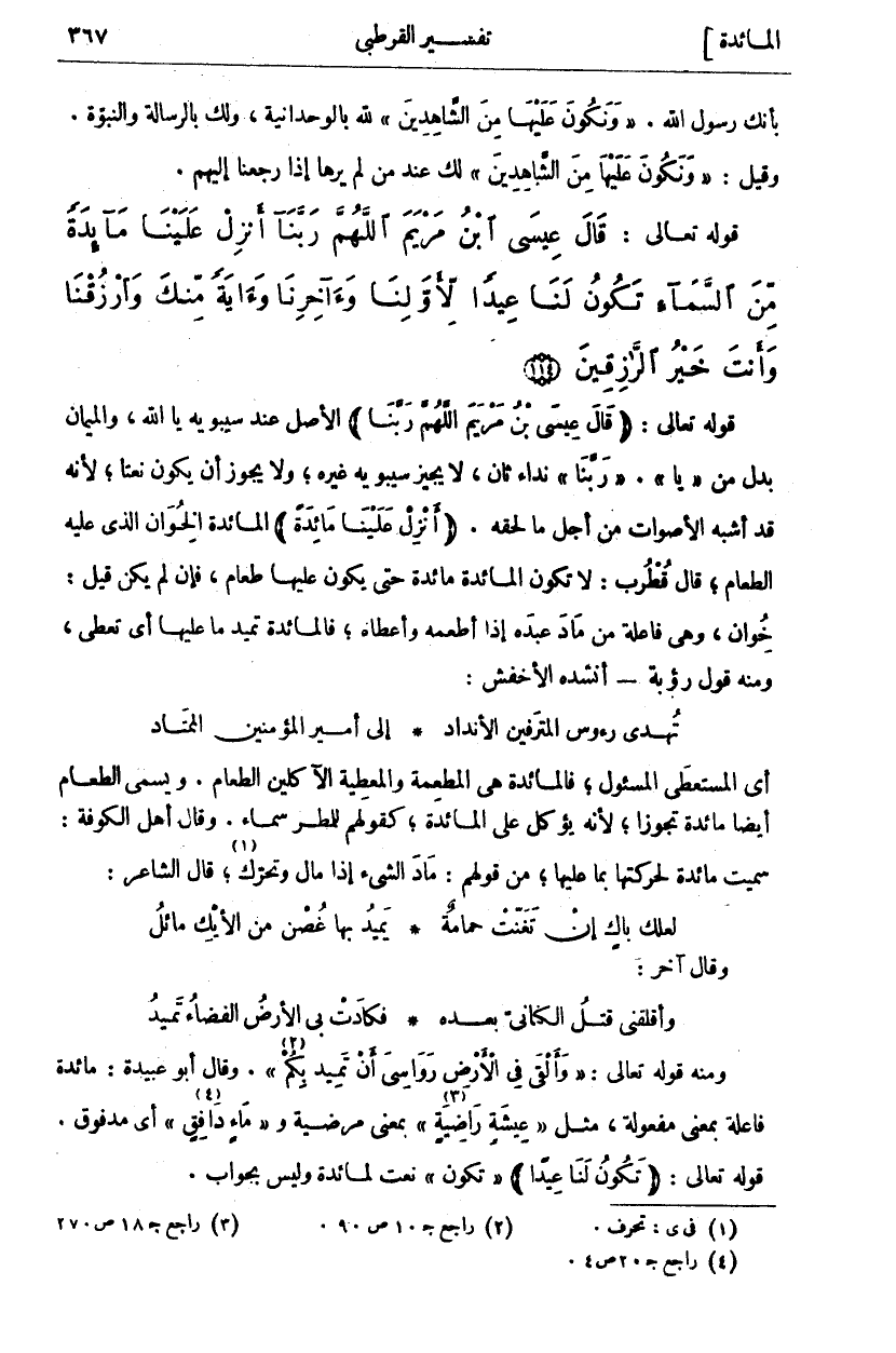 قَوْلُهُ تَعَالَى: (قالَ عِيسَى ابْنُ مَرْيَمَ اللَّهُمَّ رَبَّنا) الْأَصْلُ عِنْدَ سِيبَوَيْهِ يَا اللَّهُ، وَالْمِيمَانِ بَدَلٌ مِنْ" يَا"" رَبَّنا" نِدَاءٌ ثَانٍ، لَا يُجِيزُ سِيبَوَيْهِ غَيْرَهُ وَلَا يَجُوزُ أَنْ يَكُونَ نَعْتًا لِأَنَّهُ قَدْ أَشْبَهَ الْأَصْوَاتَ مِنْ أَجْلِ مَا لَحِقَهُ. (أَنْزِلْ عَلَيْنا مائِدَةً) الْمَائِدَةُ الْخِوَانُ الَّذِي عَلَيْهِ الطَّعَامُ قَالَ قُطْرُبٌ: لَا تَكُونُ الْمَائِدَةُ مَائِدَةً حَتَّى يَكُونَ عَلَيْهَا طَعَامٌ فَإِنْ لَمْ يَكُنْ قِيلَ: خِوَانٌ وَهِيَ فَاعِلَةٌ مِنْ مَادَ عَبْدُهُ إِذَا أَطْعَمَهُ وَأَعْطَاهُ، فَالْمَائِدَةُ تَمِيدُ مَا عَلَيْهَا أَيْ تُعْطِي وَمِنْهُ قَوْلُ رُؤْبَةَ أَنْشَدَهُ الْأَخْفَشُ: