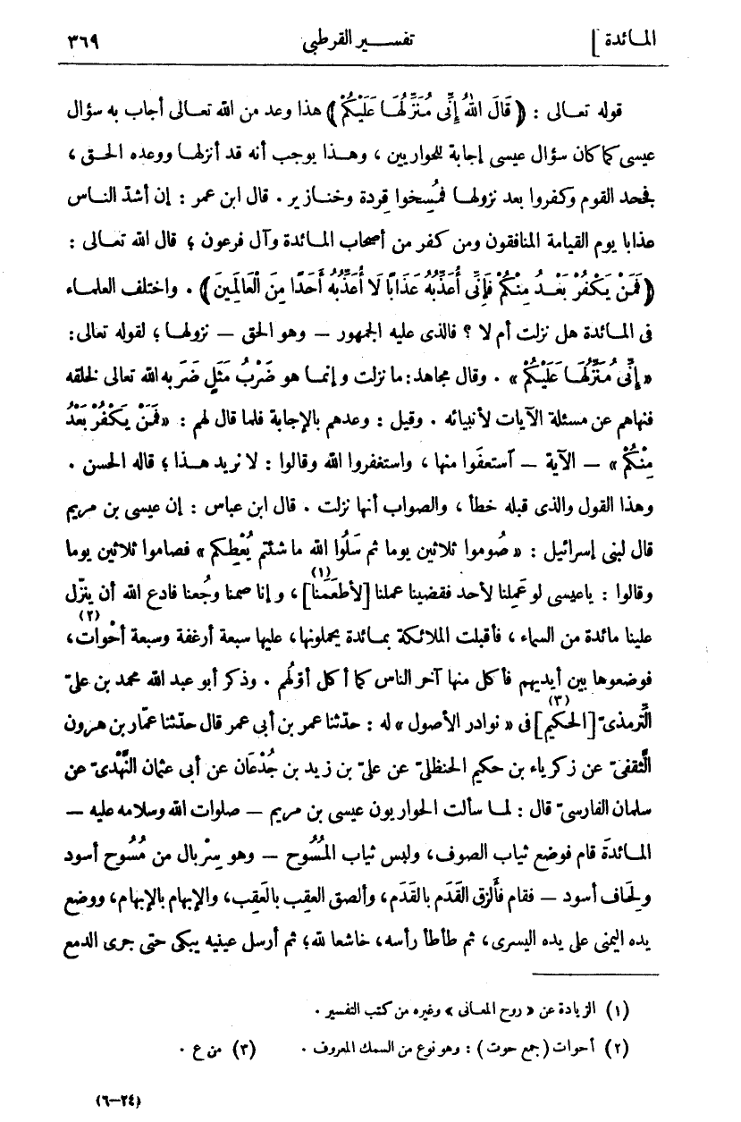 قَوْلُهُ تَعَالَى" قالَ اللَّهُ إِنِّي مُنَزِّلُها عَلَيْكُمْ" هَذَا وَعْدٌ مِنَ اللَّهِ تَعَالَى أَجَابَ بِهِ سُؤَالَ عِيسَى كَمَا كَانَ سُؤَالُ عِيسَى إِجَابَةً لِلْحَوَارِيِّينَ وَهَذَا يُوجِبُ أَنَّهُ قَدْ أَنْزَلَهَا وَوَعْدُهُ الْحَقُّ، فَجَحَدَ الْقَوْمُ وَكَفَرُوا بَعْدَ نُزُولِهَا فَمُسِخُوا قِرَدَةً وَخَنَازِيرَ. قَالَ ابْنُ عُمَرَ: إِنَّ أَشَدَّ النَّاسِ عَذَابًا يَوْمَ الْقِيَامَةِ الْمُنَافِقُونَ وَمَنْ كَفَرَ مِنْ أَصْحَابِ الْمَائِدَةِ وَآلُ فِرْعَوْنَ قَالَ اللَّهُ تَعَالَى:" فَمَنْ يَكْفُرْ بَعْدُ مِنْكُمْ فَإِنِّي أُعَذِّبُهُ عَذاباً لَا أُعَذِّبُهُ أَحَداً مِنَ الْعالَمِينَ". وَاخْتَلَفَ الْعُلَمَاءُ فِي الْمَائِدَةِ هَلْ نَزَلَتْ أَمْ لَا؟ فَالَّذِي عَلَيْهِ الْجُمْهُورُ- وَهُوَ الْحَقُّ- نُزُولُهَا لِقَوْلُهُ تَعَالَى:" إِنِّي مُنَزِّلُها عَلَيْكُمْ". وَقَالَ مُجَاهِدٌ: مَا نَزَلَتْ وَإِنَّمَا هُوَ ضَرْبُ مَثَلٍ ضَرَبَهُ اللَّهُ تَعَالَى لِخَلْقِهِ فَنَهَاهُمْ عَنْ مَسْأَلَةِ الْآيَاتِ لِأَنْبِيَائِهِ. وَقِيلَ: وَعَدَهُمْ بِالْإِجَابَةِ فَلَمَّا قَالَ لَهُمْ:" فَمَنْ يَكْفُرْ بَعْدُ مِنْكُمْ" الْآيَةَ اسْتَعْفَوْا مِنْهَا، وَاسْتَغْفَرُوا اللَّهَ وَقَالُوا: لَا نُرِيدُ هَذَا، قَالَهُ الْحَسَنُ. وهذا القول الذي قَبْلَهُ خَطَأٌ وَالصَّوَابُ أَنَّهَا نَزَلَتْ. قَالَ ابْنُ عَبَّاسٍ: إِنَّ عِيسَى ابْنَ مَرْيَمَ قَالَ لِبَنِي إِسْرَائِيلَ:] صُومُوا ثَلَاثِينَ يَوْمًا ثُمَّ سَلُوا اللَّهَ مَا شِئْتُمْ يُعْطِكُمْ [فَصَامُوا ثَلَاثِينَ يَوْمًا وَقَالُوا: يَا عِيسَى لَوْ عَمِلْنَا لِأَحَدٍ فَقَضَيْنَا عَمَلَنَا [لَأَطْعَمَنَا] «١»، وَإِنَّا صُمْنَا وَجُعْنَا فَادْعُ اللَّهَ أَنْ يُنَزِّلَ عَلَيْنَا مَائِدَةً مِنَ السَّمَاءِ فَأَقْبَلَتِ الْمَلَائِكَةُ بِمَائِدَةٍ يَحْمِلُونَهَا، عَلَيْهَا سَبْعَةُ أَرْغِفَةٍ وَسَبْعَةُ أَحْوَاتٍ «٢» فَوَضَعُوهَا بَيْنَ أَيْدِيهِمْ فَأَكَلَ مِنْهَا آخِرُ النَّاسِ كَمَا أَكَلَ أَوَّلُهُمْ. وَذَكَرَ أَبُو عَبْدِ اللَّهِ مُحَمَّدُ بْنُ عَلِيٍّ التِّرْمِذِيُّ [الْحَكِيمُ] «٣» فِي" نَوَادِرِ الْأُصُولِ" لَهُ: حَدَّثَنَا عُمَرُ بْنُ أَبِي عُمَرَ قَالَ حَدَّثَنَا عمار بن هرون الثَّقَفِيُّ عَنْ زَكَرِيَّاءَ بْنِ حَكِيمٍ الْحَنْظَلِيِّ عَنْ عَلِيِّ بْنِ زَيْدِ بْنِ جُدْعَانَ عَنْ أَبِي عُثْمَانَ النَّهْدِيِّ عَنْ سَلْمَانَ الْفَارِسِيِّ قَالَ: لَمَّا سألت الحواريون عيسى بن مَرْيَمَ- صَلَوَاتُ اللَّهِ وَسَلَامُهُ عَلَيْهِ- الْمَائِدَةَ قَامَ فَوَضَعَ ثِيَابَ الصُّوفِ وَلَبِسَ ثِيَابَ الْمُسُوحِ- وَهُوَ سِرْبَالٌ مِنْ مُسُوحٍ أَسْوَدَ وَلِحَافٍ أَسْوَدَ- فَقَامَ فَأَلْزَقَ الْقَدَمَ بِالْقَدَمِ وَأَلْصَقَ الْعَقِبَ بِالْعَقِبِ وَالْإِبْهَامَ بِالْإِبْهَامِ، وَوَضَعَ يَدَهُ الْيُمْنَى عَلَى يَدِهِ الْيُسْرَى ثُمَّ طَأْطَأَ رَأْسَهُ خَاشِعًا لِلَّهِ ثُمَّ أَرْسَلَ عينيه يبكى حتى جرى الدمع