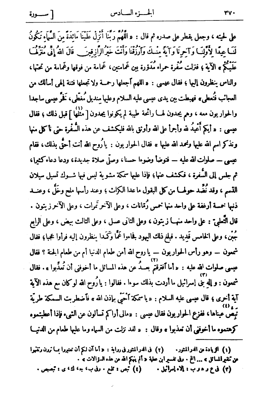 عَلَى لِحْيَتِهِ وَجَعَلَ يَقْطُرُ عَلَى صَدْرِهِ ثُمَّ قَالَ:" اللَّهُمَّ رَبَّنا أَنْزِلْ عَلَيْنا مائِدَةً مِنَ السَّماءِ تَكُونُ لَنا عِيداً لِأَوَّلِنا وَآخِرِنا وَآيَةً مِنْكَ وَارْزُقْنا وَأَنْتَ خَيْرُ الرَّازِقِينَ قالَ اللَّهُ إِنِّي مُنَزِّلُها عَلَيْكُمْ" الْآيَةَ فَنَزَلَتْ سُفْرَةٌ حَمْرَاءُ مُدَوَّرَةٌ بَيْنَ غَمَامَتَيْنِ غَمَامَةٍ مِنْ فَوْقِهَا وَغَمَامَةٍ مِنْ تَحْتِهَا وَالنَّاسُ يَنْظُرُونَ إِلَيْهَا، فَقَالَ عِيسَى: [اللَّهُمَّ اجْعَلْهَا رَحْمَةً وَلَا تَجْعَلْهَا فِتْنَةً إِلَهِي أَسْأَلُكَ مِنَ الْعَجَائِبِ فَتُعْطِي] فَهَبَطَتْ بَيْنَ يَدَيْ عِيسَى عَلَيْهِ السَّلَامُ وَعَلَيْهَا مِنْدِيلٌ مُغَطًّى فَخَرَّ عِيسَى سَاجِدًا وَالْحَوَارِيُّونَ مَعَهُ وَهُمْ يَجِدُونَ لَهَا رائحة طيبة ولم يَكُونُوا يَجِدُونَ [مِثْلَهَا] «١» قَبْلَ ذَلِكَ فَقَالَ عِيسَى: [أَيُّكُمْ أَعْبَدُ لِلَّهِ وَأَجْرَأُ عَلَى اللَّهِ وَأَوْثَقُ بِاللَّهِ فَلْيَكْشِفْ عَنْ هَذِهِ السُّفْرَةِ حَتَّى نَأْكُلَ مِنْهَا وَنَذْكُرَ اسْمَ اللَّهِ عَلَيْهَا وَنَحْمَدَ اللَّهَ عَلَيْهَا] فَقَالَ الْحَوَارِيُّونَ: يَا رُوحَ اللَّهِ أَنْتَ أَحَقُّ بِذَلِكَ فَقَامَ عِيسَى- صَلَوَاتُ اللَّهِ عَلَيْهِ- فَتَوَضَّأَ وُضُوءًا حَسَنًا وَصَلَّى صَلَاةً جَدِيدَةً وَدَعَا دُعَاءً كَثِيرًا ثُمَّ جَلَسَ إِلَى السُّفْرَةِ فَكَشَفَ عَنْهَا فَإِذَا عَلَيْهَا سَمَكَةٌ مَشْوِيَّةٌ لَيْسَ فِيهَا شَوْكٌ تَسِيلُ سَيَلَانَ الدَّسَمِ وَقَدْ نُضِّدَ حَوْلَهَا مِنْ كُلِّ الْبُقُولِ مَا عَدَا الْكُرَّاثَ وَعِنْدَ رَأْسِهَا مِلْحٌ وَخَلٌّ وَعِنْدَ ذَنَبِهَا خَمْسَةُ أَرْغِفَةٍ على واحد منها خمس رُمَّانَاتٍ وَعَلَى الْآخَرِ تَمَرَاتٌ وَعَلَى الْآخَرِ زَيْتُونٌ. قَالَ الثَّعْلَبِيُّ: عَلَى وَاحِدٍ مِنْهَا زَيْتُونٌ، وَعَلَى الثَّانِي عَسَلٌ وَعَلَى الثَّالِثِ بَيْضٌ وَعَلَى الرَّابِعِ جُبْنٌ وَعَلَى الْخَامِسِ قَدِيدٌ. فَبَلَغَ ذَلِكَ الْيَهُودَ فَجَاءُوا غَمًّا وَكَمَدًا يَنْظُرُونَ إِلَيْهِ فَرَأَوْا عَجَبًا فَقَالَ شَمْعُونُ وَهُوَ رَأْسُ الْحَوَارِيِّينَ- يَا رُوحَ اللَّهِ أَمِنْ طَعَامِ الدُّنْيَا أَمْ مِنْ طَعَامِ الْجَنَّةِ؟ فَقَالَ عِيسَى صَلَوَاتُ اللَّهِ عَلَيْهِ: [أَمَا افْتَرَقْتُمْ «٢» بَعْدُ عَنْ هَذِهِ الْمَسَائِلِ مَا أَخْوَفَنِي أَنْ تُعَذَّبُوا]. فَقَالَ شَمْعُونُ: وَإِلَهِ بَنِي «٣» إِسْرَائِيلَ مَا أَرَدْتُ بِذَلِكَ سُوءًا. فَقَالُوا: يَا رُوحَ اللَّهِ لَوْ كَانَ مَعَ هَذِهِ الْآيَةِ آيَةٌ أُخْرَى قَالَ عِيسَى عَلَيْهِ السَّلَامُ:] يَا سَمَكَةُ احْيَيْ بِإِذْنِ اللَّهِ [فَاضْطَرَبَتِ السَّمَكَةُ طَرِيَّةً تَبِصُّ «٤» عَيْنَاهَا، فَفَزِعَ الْحَوَارِيُّونَ فَقَالَ عِيسَى:] مَا لِي أَرَاكُمْ تَسْأَلُونَ عَنِ الشَّيْءِ فَإِذَا أُعْطِيتُمُوهُ كَرِهْتُمُوهُ مَا أَخْوَفَنِي أَنْ تُعَذَّبُوا [وَقَالَ:] لَقَدْ نَزَلَتْ مِنَ السَّمَاءِ وَمَا عَلَيْهَا طَعَامٌ مِنَ الدُّنْيَا