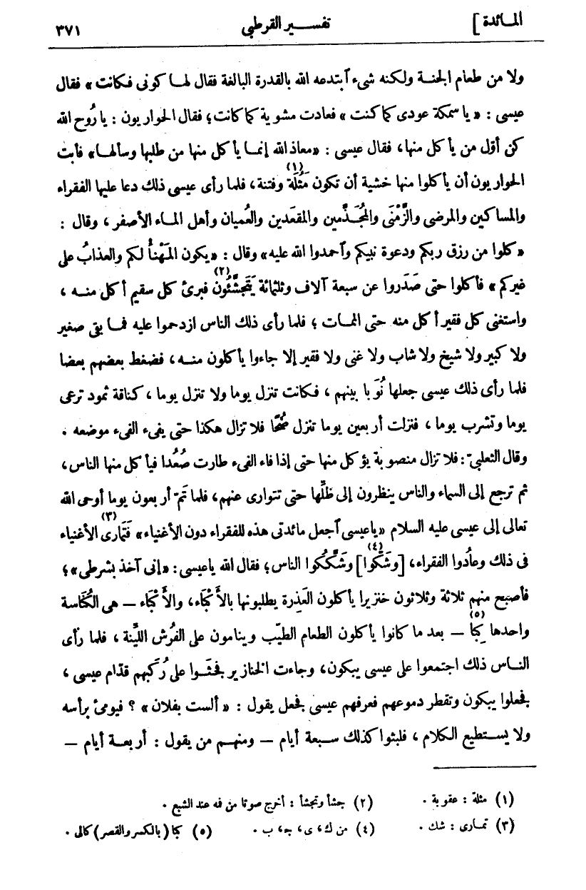 ولا من طعام الجنة ولكنه شي ابْتَدَعَهُ اللَّهُ بِالْقُدْرَةِ الْبَالِغَةِ فَقَالَ لَهَا كُونِي فَكَانَتْ [فَقَالَ عِيسَى:] يَا سَمَكَةُ عُودِي كَمَا كُنْتِ [فَعَادَتْ مَشْوِيَّةً كَمَا كَانَتْ فَقَالَ الْحَوَارِيُّونَ: يَا رُوحَ اللَّهِ كُنْ أَوَّلَ مَنْ يَأْكُلُ مِنْهَا، فَقَالَ عِيسَى:] مَعَاذَ اللَّهِ إِنَّمَا يَأْكُلُ منها من طلبها وسألها [فأبت الْحَوَارِيُّونَ أَنْ يَأْكُلُوا مِنْهَا خَشْيَةَ أَنْ تَكُونَ مُثْلَةً «١» وَفِتْنَةً فَلَمَّا رَأَى عِيسَى ذَلِكَ دَعَا عَلَيْهَا الْفُقَرَاءَ وَالْمَسَاكِينَ وَالْمَرْضَى وَالزَّمْنَى وَالْمُجَذَّمِينَ وَالْمُقْعَدِينَ وَالْعُمْيَانَ وَأَهْلَ الْمَاءِ الْأَصْفَرِ، وَقَالَ:] كُلُوا مِنْ رِزْقِ رَبِّكُمْ وَدَعْوَةِ نَبِيِّكُمْ وَاحْمَدُوا اللَّهَ عَلَيْهِ [وَقَالَ:] يَكُونُ الْمَهْنَأُ لَكُمْ وَالْعَذَابُ عَلَى غَيْرِكُمْ [فأكلوا حتى صدروا عن سبعة آلاف وثلاثمائة يَتَجَشَّئُونَ «٢» فَبَرِئَ كُلُّ سَقِيمٍ أَكَلَ مِنْهُ، وَاسْتَغْنَى كله فَقِيرٍ أَكَلَ مِنْهُ حَتَّى الْمَمَاتِ فَلَمَّا رَأَى ذَلِكَ النَّاسُ ازْدَحَمُوا عَلَيْهِ فَمَا بَقِيَ صَغِيرٌ وَلَا كَبِيرٌ وَلَا شَيْخٌ وَلَا شَابٌّ وَلَا غَنِيٌّ وَلَا فَقِيرٌ إِلَّا جَاءُوا يَأْكُلُونَ مِنْهُ فَضَغَطَ بَعْضُهُمْ بَعْضًا فَلَمَّا رَأَى ذَلِكَ عِيسَى جَعَلَهَا نُوَبًا بَيْنَهُمْ فَكَانَتْ تَنْزِلُ يَوْمًا وَلَا تَنْزِلُ يَوْمًا كَنَاقَةِ ثَمُودَ تَرْعَى يَوْمًا وَتَشْرَبُ يوما فنزلت أربعين يوما تنزل ضحا فلا تزال حتى يفئ الْفَيْءُ مَوْضِعَهُ وَقَالَ الثَّعْلَبِيُّ: فَلَا تَزَالُ مَنْصُوبَةً يُؤْكَلُ مِنْهَا حَتَّى إِذَا فَاءَ الْفَيْءُ طَارَتْ صُعُدًا فَيَأْكُلُ مِنْهَا النَّاسُ ثُمَّ تَرْجِعُ إِلَى السَّمَاءِ وَالنَّاسُ يَنْظُرُونَ إِلَى ظِلِّهَا حَتَّى تَتَوَارَى عَنْهُمْ فَلَمَّا تَمَّ أَرْبَعُونَ يَوْمًا أَوْحَى اللَّهُ تَعَالَى إِلَى عِيسَى عَلَيْهِ السَّلَامُ] يَا عِيسَى اجْعَلْ مَائِدَتِي هَذِهِ لِلْفُقَرَاءِ دُونَ الْأَغْنِيَاءِ [فَتَمَارَى «٣» الْأَغْنِيَاءُ فِي ذَلِكَ وَعَادَوُا الْفُقَرَاءَ] وَشَكُّوا [«٤» وَشَكَّكُوا النَّاسَ فَقَالَ اللَّهُ يَا عِيسَى:] إِنِّي آخِذٌ بِشَرْطِي [فَأَصْبَحَ مِنْهُمْ ثَلَاثَةٌ وَثَلَاثُونَ خِنْزِيرًا يَأْكُلُونَ الْعَذِرَةَ يَطْلُبُونَهَا بِالْأَكْبَاءِ وَالْأَكْبَاءُ هِيَ الْكُنَاسَةُ وَاحِدُهَا كبا «٥» بعد ما كَانُوا يَأْكُلُونَ الطَّعَامَ الطَّيِّبَ وَيَنَامُونَ عَلَى الْفُرُشِ اللَّيِّنَةِ فَلَمَّا رَأَى النَّاسُ ذَلِكَ اجْتَمَعُوا عَلَى عِيسَى يَبْكُونَ، وَجَاءَتِ الْخَنَازِيرُ فَجَثَوْا عَلَى رُكَبِهِمْ قُدَّامَ عِيسَى فَجَعَلُوا يَبْكُونَ وَتَقْطُرُ دُمُوعُهُمْ فَعَرَفَهُمْ عِيسَى فَجَعَلَ يَقُولُ:] أَلَسْتَ بِفُلَانٍ [؟ فَيُومِئُ بِرَأْسِهِ وَلَا يَسْتَطِيعُ الْكَلَامَ فَلَبِثُوا كَذَلِكَ سَبْعَةَ أَيَّامٍ ومنهم من يقول: أربعة أيام،
