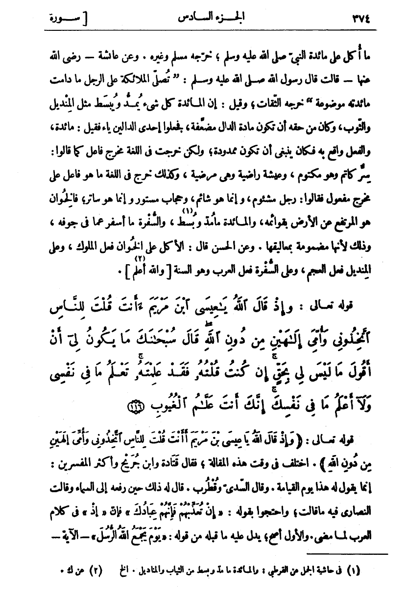 (١). في حاشية الجمل عن القرطبي: والمائدة ما مد وبسط من الثياب والمناديل. إلخ.