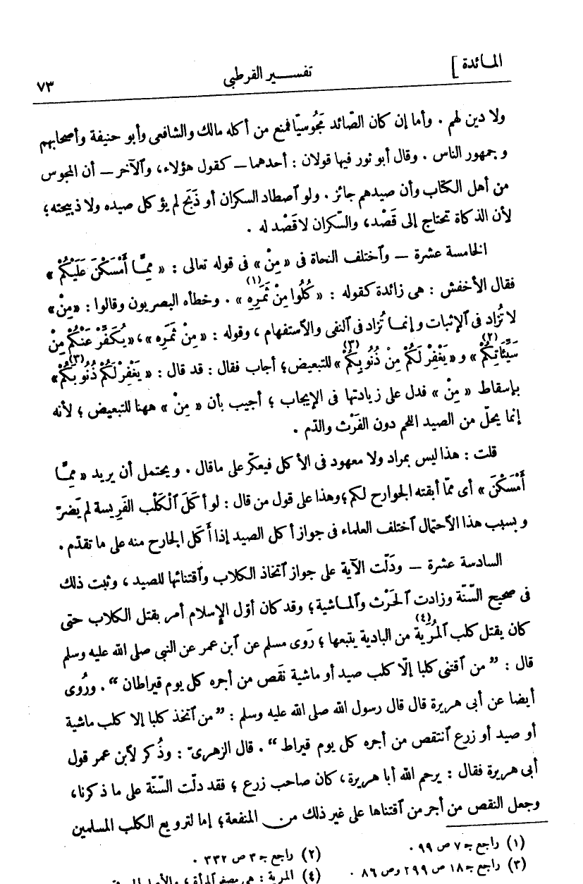 وَلَا دِينَ لَهُمْ. وَأَمَّا إِنْ كَانَ الصَّائِدُ مجوسا فَمَنَعَ مِنْ أَكْلِهِ مَالِكٌ وَالشَّافِعِيُّ وَأَبُو حَنِيفَةَ وَأَصْحَابُهُمْ وَجُمْهُورُ النَّاسِ. وَقَالَ أَبُو ثَوْرٍ فِيهَا قَوْلَانِ: أَحَدُهُمَا- كَقَوْلِ هَؤُلَاءِ، وَالْآخَرُ: أَنَّ الْمَجُوسَ مِنْ أَهْلِ الْكِتَابِ وَأَنَّ صَيْدَهُمْ جَائِزٌ. وَلَوْ اصْطَادَ السَّكْرَانُ أَوْ ذَبَحَ لَمْ يُؤْكَلْ صَيْدُهُ وَلَا ذَبِيحَتُهُ، لِأَنَّ الذَّكَاةَ تَحْتَاجُ إِلَى قَصْدٍ، وَالسَّكْرَانُ لَا قَصْدَ لَهُ. الْخَامِسَةَ عَشْرَةَ: وَاخْتَلَفَ النُّحَاةُ فِي" مِنْ" فِي قَوْلِهِ تَعَالَى:" مِمَّا أَمْسَكْنَ عَلَيْكُمْ" فَقَالَ الْأَخْفَشُ: هِيَ زَائِدَةٌ كَقَوْلِهِ:" كُلُوا مِنْ ثَمَرِهِ" «١»] الانعام: ١٤١]. وَخَطَّأَهُ الْبَصْرِيُّونَ وَقَالُوا:" مِنْ" لَا تُزَادُ فِي الْإِثْبَاتِ وَإِنَّمَا تُزَادُ فِي النَّفْيِ وَالِاسْتِفْهَامِ، وَقَوْلُهُ:" مِنْ ثَمَرَةٍ"،" يُكَفِّرُ عَنْكُمْ مِنْ سَيِّئاتِكُمْ" «٢»] البقرة: ٢٧١] و" لِيَغْفِرَ لَكُمْ مِنْ ذُنُوبِكُمْ «٣» ١٠"] الأحقاف: ٣١] لِلتَّبْعِيضِ، أَجَابَ فَقَالَ: قَدْ قَالَ:" يَغْفِرْ لَكُمْ ذُنُوبَكُمْ «٤» "] نوح: ٤] بِإِسْقَاطِ" مِنْ" فَدَلَّ عَلَى زِيَادَتِهَا فِي الْإِيجَابِ، أُجِيبُ بِأَنَّ" مِنْ" هَاهُنَا لِلتَّبْعِيضِ، لِأَنَّهُ إِنَّمَا يَحِلُّ مِنَ الصَّيْدِ اللَّحْمُ دُونَ الْفَرْثِ وَالدَّمِ. قُلْتُ: هَذَا لَيْسَ بِمُرَادٍ وَلَا مَعْهُودٍ فِي الْأَكْلِ فَيُعَكِّرُ عَلَى مَا قَالَ. وَيَحْتَمِلُ أَنْ يُرِيدَ" مِمَّا أَمْسَكْنَ" أَيْ مِمَّا أَبْقَتْهُ الْجَوَارِحُ لَكُمْ، وَهَذَا عَلَى قَوْلِ مَنْ قَالَ: لَوْ أَكَلَ الْكَلْبُ الْفَرِيسَةَ لَمْ يَضُرْ وَبِسَبَبِ هَذَا الِاحْتِمَالِ اخْتَلَفَ الْعُلَمَاءُ فِي جَوَازِ أَكْلِ الصَّيْدِ إِذَا أَكَلَ الْجَارِحُ مِنْهُ عَلَى مَا تَقَدَّمَ. السَّادِسَةَ عَشْرَةَ: وَدَلَّتِ الْآيَةُ عَلَى جَوَازِ اتِّخَاذِ الْكِلَابِ وَاقْتِنَائِهَا لِلصَّيْدِ، وَثَبَتَ ذَلِكَ فِي صَحِيحِ السُّنَّةِ وَزَادَتِ الْحَرْثَ وَالْمَاشِيَةَ، وَقَدْ كَانَ أَوَّلَ الْإِسْلَامِ أَمْرٌ بِقَتْلِ الْكِلَابِ حَتَّى كَانَ يُقْتَلُ كَلْبُ الْمُرَيَةِ «٥» مِنَ الْبَادِيَةِ يَتْبَعُهَا، رَوَى مُسْلِمٌ عَنِ ابْنِ عُمَرَ عَنِ النَّبِيِّ صَلَّى اللَّهُ عَلَيْهِ وَسَلَّمَ قَالَ: (مَنِ اقْتَنَى كَلْبًا إِلَّا كَلْبَ صَيْدٍ أَوْ مَاشِيَةٍ نَقَصَ مِنْ أَجْرِهِ كُلَّ يَوْمٍ قِيرَاطَانِ). وَرُوِيَ أَيْضًا عَنْ أَبِي هُرَيْرَةَ قَالَ قَالَ رَسُولُ اللَّهِ صَلَّى اللَّهُ عَلَيْهِ وَسَلَّمَ: (مَنِ اتَّخَذَ كَلْبًا إِلَّا كَلْبَ مَاشِيَةٍ أَوْ صَيْدٍ أَوْ زَرْعٍ انْتَقَصَ مِنْ أَجْرِهِ كُلَّ يَوْمٍ قِيرَاطٌ). قَالَ الزُّهْرِيُّ: وَذُكِرَ لِابْنِ عُمَرَ قَوْلُ أَبِي هُرَيْرَةَ فَقَالَ: يَرْحَمُ اللَّهُ أَبَا هُرَيْرَةَ، كَانَ صَاحِبَ زَرْعٍ، فَقَدْ دَلَّتِ السُّنَّةُ عَلَى مَا ذَكَرْنَا، وَجُعِلَ النَّقْصُ مِنْ أَجْرِ مَنِ اقْتَنَاهَا عَلَى غَيْرِ ذَلِكَ مِنَ المنفعة، إما لترويع الكلب المسلمين