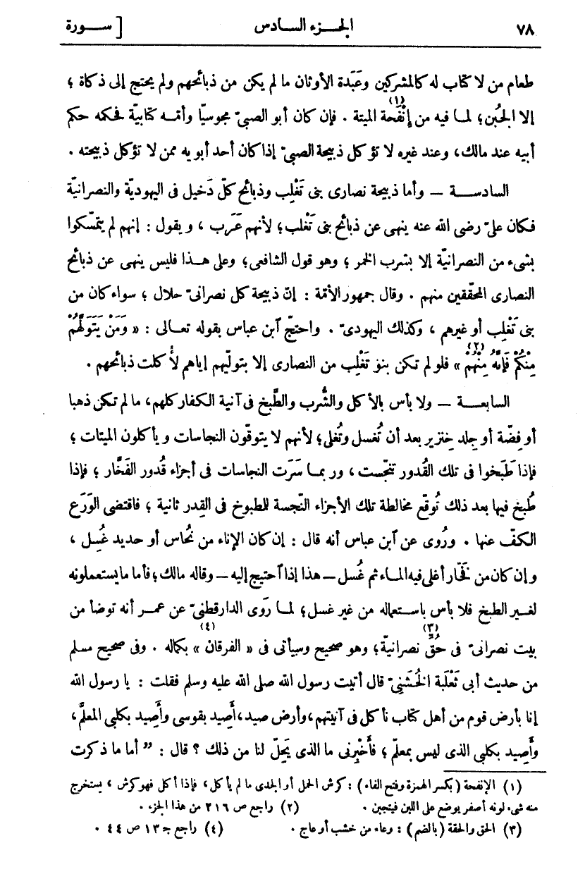 طَعَامِ مَنْ لَا كِتَابَ لَهُ كَالْمُشْرِكِينَ وَعَبَدَةِ الْأَوْثَانِ مَا لَمْ يَكُنْ مِنْ ذَبَائِحِهِمْ وَلَمْ يَحْتَجْ إِلَى ذَكَاةٍ، إِلَّا الْجُبْنَ، لِمَا فِيهِ مِنْ إِنْفَحَةِ «١» الْمَيْتَةِ. فَإِنْ كَانَ أَبُو الصَّبِيِّ مَجُوسِيًّا وَأُمُّهُ كِتَابِيَّةٌ فَحُكْمُهُ حُكْمُ أَبِيهِ عِنْدَ مَالِكٍ، وَعِنْدَ غَيْرِهِ لَا تُؤْكَلُ ذَبِيحَةُ الصَّبِيِّ إِذَا كَانَ أَحَدُ أَبَوَيْهِ مِمَّنْ لَا تُؤْكَلُ ذَبِيحَتُهُ. السَّادِسَةُ- وَأَمَّا ذَبِيحَةُ نَصَارَى بَنِي تَغْلِبَ وَذَبَائِحُ كُلِّ دَخِيلٍ فِي الْيَهُودِيَّةِ وَالنَّصْرَانِيَّةِ فَكَانَ عَلِيٌّ رَضِيَ اللَّهُ عَنْهُ يَنْهَى عَنْ ذَبَائِحِ بَنِي تَغْلِبَ، لِأَنَّهُمْ عَرَبٌ، وَيَقُولُ: إِنَّهُمْ لَمْ يَتَمَسَّكُوا بِشَيْءٍ مِنَ النَّصْرَانِيَّةِ إِلَّا بِشُرْبِ الْخَمْرِ، وَهُوَ قَوْلُ الشَّافِعِيِّ، وَعَلَى هَذَا فَلَيْسَ يُنْهَى عَنْ ذَبَائِحِ النَّصَارَى الْمُحَقَّقِينَ مِنْهُمْ. وَقَالَ جُمْهُورُ الْأُمَّةِ: إِنَّ ذَبِيحَةَ كُلِّ نَصْرَانِيٍّ حَلَالٌ، سَوَاءٌ كَانَ مِنْ بَنِي تَغْلِبَ أَوْ غَيْرِهِمْ، وَكَذَلِكَ الْيَهُودِيُّ. وَاحْتَجَّ ابْنُ عَبَّاسٍ بِقَوْلِهِ تَعَالَى:" وَمَنْ يَتَوَلَّهُمْ مِنْكُمْ فَإِنَّهُ مِنْهُمْ"»