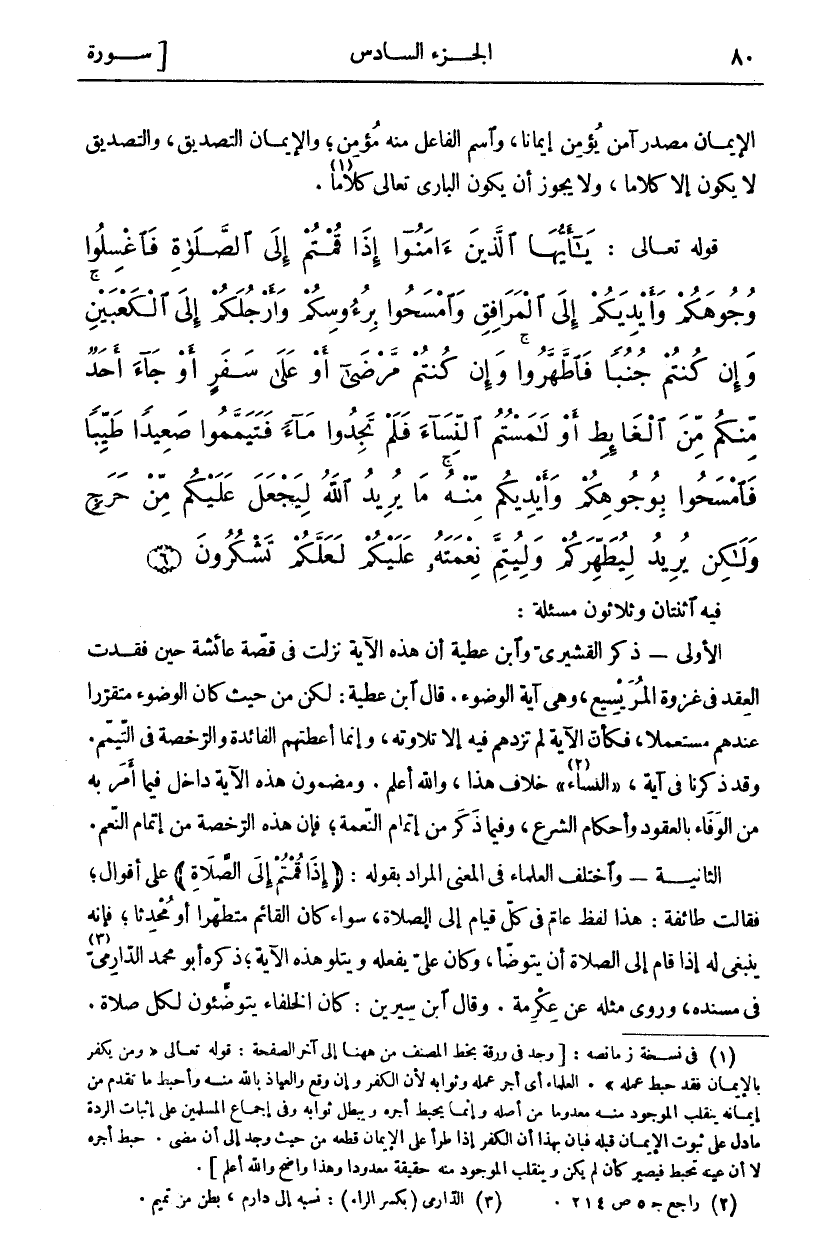 يَا أَيُّهَا الَّذِينَ آمَنُوا إِذا قُمْتُمْ إِلَى الصَّلاةِ فَاغْسِلُوا وُجُوهَكُمْ وَأَيْدِيَكُمْ إِلَى الْمَرافِقِ وَامْسَحُوا بِرُؤُسِكُمْ وَأَرْجُلَكُمْ إِلَى الْكَعْبَيْنِ وَإِنْ كُنْتُمْ جُنُباً فَاطَّهَّرُوا وَإِنْ كُنْتُمْ مَرْضى أَوْ عَلى سَفَرٍ أَوْ جاءَ أَحَدٌ مِنْكُمْ مِنَ الْغائِطِ أَوْ لامَسْتُمُ النِّساءَ فَلَمْ تَجِدُوا مَاءً فَتَيَمَّمُوا صَعِيداً طَيِّباً فَامْسَحُوا بِوُجُوهِكُمْ وَأَيْدِيكُمْ مِنْهُ مَا يُرِيدُ اللَّهُ لِيَجْعَلَ عَلَيْكُمْ مِنْ حَرَجٍ وَلكِنْ يُرِيدُ لِيُطَهِّرَكُمْ وَلِيُتِمَّ نِعْمَتَهُ عَلَيْكُمْ لَعَلَّكُمْ تَشْكُرُونَ (٦)