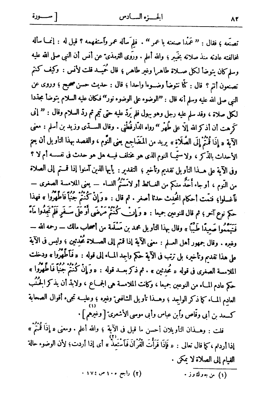 تَصْنَعُهُ، فَقَالَ: (عَمْدًا صَنَعْتُهُ يَا عُمَرُ). فَلِمَ سَأَلَهُ عُمَرُ وَاسْتَفْهَمَهُ؟ قِيلَ لَهُ: إِنَّمَا سَأَلَهُ لِمُخَالَفَتِهِ عَادَتَهُ مُنْذُ صَلَاتِهِ بِخَيْبَرَ، وَاللَّهُ أَعْلَمُ. وَرَوَى التِّرْمِذِيُّ عَنْ أَنَسٍ أَنَّ النَّبِيَّ صَلَّى اللَّهُ عَلَيْهِ وَسَلَّمَ كَانَ يَتَوَضَّأُ لِكُلِّ صَلَاةٍ طَاهِرًا وَغَيْرَ طَاهِرٍ، قَالَ حُمَيْدٌ: قُلْتُ لِأَنَسٍ: وَكَيْفَ كُنْتُمْ تَصْنَعُونَ أَنْتُمْ؟ قَالَ: كُنَّا نَتَوَضَّأُ وُضُوءًا وَاحِدًا، قَالَ: حَدِيثٌ حَسَنٌ صَحِيحٌ، وَرُوِيَ عَنِ النَّبِيِّ صَلَّى اللَّهُ عَلَيْهِ وَسَلَّمَ أَنَّهُ قَالَ: (الْوُضُوءُ عَلَى الْوُضُوءِ نُورٌ) فَكَانَ عَلَيْهِ السَّلَامُ يَتَوَضَّأُ مُجَدِّدًا لِكُلِّ صَلَاةٍ، وَقَدْ سَلَّمَ عليه وجل وَهُوَ يَبُولُ فَلَمْ يَرُدَّ عَلَيْهِ حَتَّى تَيَمَّمَ ثُمَّ رَدَّ السَّلَامِ وَقَالَ: (إِنِّي كَرِهْتُ أَنْ أَذْكُرَ اللَّهَ إِلَّا عَلَى طُهْرٍ) رَوَاهُ الدَّارَقُطْنِيُّ. وَقَالَ السُّدِّيُّ وَزَيْدُ بْنُ أَسْلَمَ: مَعْنَى الْآيَةِ" إِذا قُمْتُمْ إِلَى الصَّلاةِ" يُرِيدُ مِنَ الْمَضَاجِعِ يَعْنِي النَّوْمَ، وَالْقَصْدُ بِهَذَا التَّأْوِيلِ أَنْ يَعُمَّ الْأَحْدَاثُ بِالذِّكْرِ، وَلَا سِيَّمَا النَّوْمُ الَّذِي هُوَ مُخْتَلَفٌ فِيهِ هَلْ هُوَ حَدَثٌ فِي نَفْسِهِ أَمْ لَا؟ وَفِي الْآيَةِ عَلَى هَذَا التَّأْوِيلِ تَقْدِيمٌ وَتَأْخِيرٌ، التَّقْدِيرُ: يَا أَيُّهَا الَّذِينَ آمَنُوا إِذَا قُمْتُمْ إِلَى الصَّلَاةِ مِنَ النَّوْمِ، أَوْ جاء أحد منكم من الغائط أو لامستم النِّسَاءَ- يَعْنِي الْمُلَامَسَةَ الصُّغْرَى- فَاغْسِلُوا، فَتَمَّتْ أَحْكَامُ الْمُحْدِثِ حَدَثًا أَصْغَرَ. ثُمَّ قَالَ:" وَإِنْ كُنْتُمْ جُنُباً فَاطَّهَّرُوا" فَهَذَا حُكْمُ نَوْعٍ آخَرَ، ثُمَّ قَالَ لِلنَّوْعَيْنِ جَمِيعًا:" وَإِنْ كُنْتُمْ مَرْضى أَوْ عَلى سَفَرٍ فَلَمْ تَجِدُوا ماءً فَتَيَمَّمُوا صَعِيداً طَيِّباً"] النساء: ٤٣]. وَقَالَ بِهَذَا التَّأْوِيلِ مُحَمَّدُ بْنُ مَسْلَمَةَ مِنْ أَصْحَابِ مَالِكٍ- رَحِمَهُ اللَّهُ- وَغَيْرُهُ. وَقَالَ جُمْهُورُ أَهْلِ الْعِلْمِ: مَعْنَى الْآيَةِ إِذَا قُمْتُمْ إِلَى الصَّلَاةِ مُحْدِثِينَ، وَلَيْسَ فِي الْآيَةِ عَلَى هَذَا تَقْدِيمٌ وَتَأْخِيرٌ، بَلْ تَرَتَّبَ فِي الْآيَةِ حُكْمُ وَاجِدِ الْمَاءِ إِلَى قَوْلِهِ: فَاطَّهَّرُوا" وَدَخَلَتِ الْمُلَامَسَةُ الصُّغْرَى فِي قَوْلِهِ" مُحْدِثِينَ". ثُمَّ ذَكَرَ بَعْدَ قَوْلِهِ:" وَإِنْ كُنْتُمْ جُنُباً فَاطَّهَّرُوا" حُكْمَ عَادِمِ الْمَاءِ مِنَ النَّوْعَيْنِ جَمِيعًا، وَكَانَتِ الْمُلَامَسَةُ هِيَ الْجِمَاعَ، وَلَا بُدَّ أَنْ يَذْكُرَ الْجُنُبَ الْعَادِمَ الْمَاءَ كَمَا ذَكَرَ الْوَاجِدَ، وَهَذَا تَأْوِيلُ الشَّافِعِيِّ وغيره، وعليه تجئ أَقْوَالُ الصَّحَابَةِ كَسَعْدِ بْنِ أَبِي وَقَّاصٍ وَابْنِ عَبَّاسٍ وَأَبِي مُوسَى الْأَشْعَرِيِّ] وَغَيْرِهِمْ [«١». قُلْتُ: وَهَذَانَ التَّأْوِيلَانِ أَحْسَنُ مَا قِيلَ فِي الْآيَةِ، وَاللَّهُ أَعْلَمُ. وَمَعْنَى" إِذا قُمْتُمْ" إِذَا أَرَدْتُمْ، كَمَا قال تعالى:" فَإِذا قَرَأْتَ الْقُرْآنَ فَاسْتَعِذْ" «٢»] النحل: ٩٨]، أَيْ إِذَا أَرَدْتَ، لِأَنَّ الْوُضُوءَ حَالَةَ الْقِيَامِ إلى الصلاة لا يمكن.