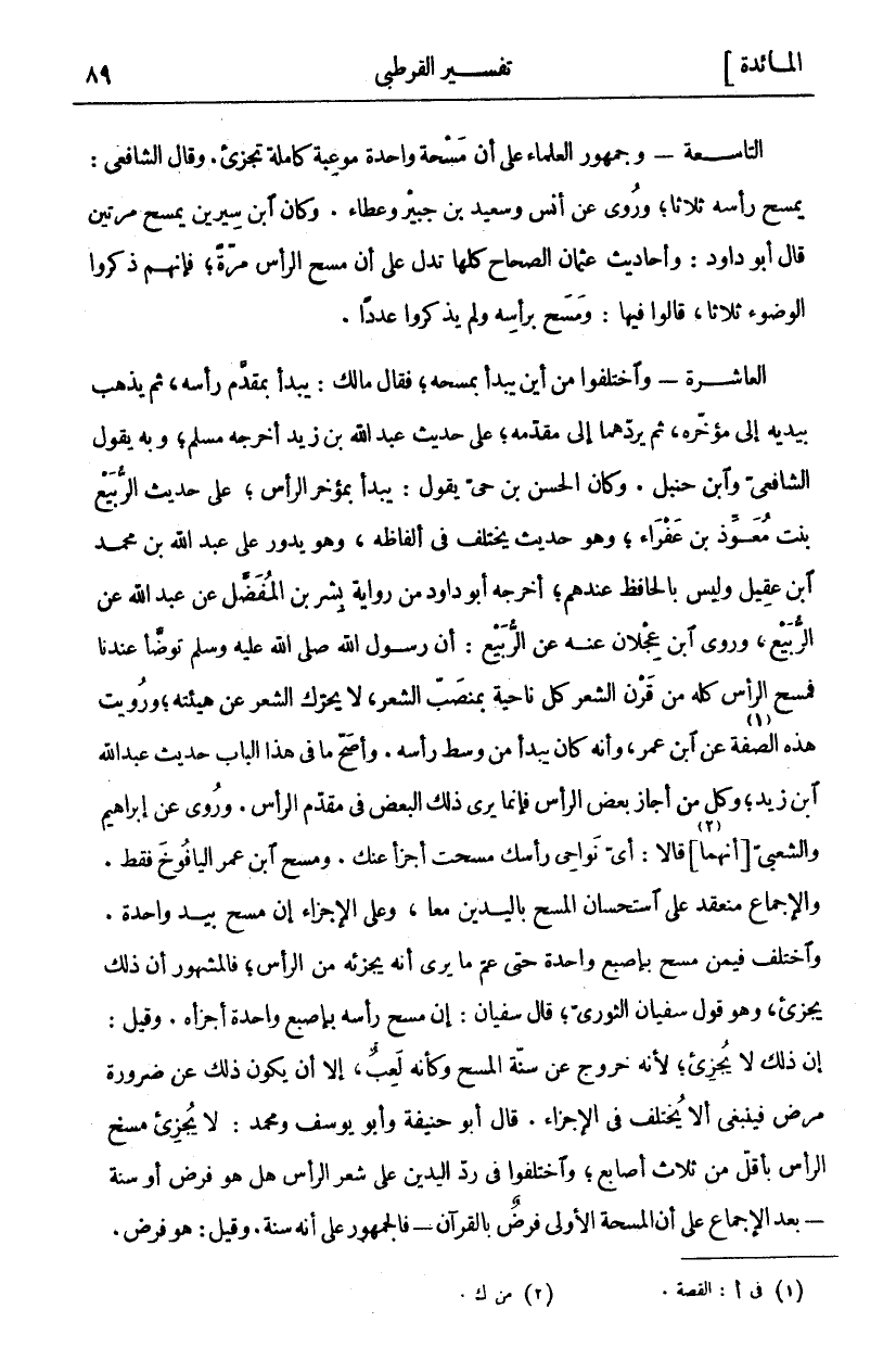 التَّاسِعَةُ- وَجُمْهُورُ الْعُلَمَاءِ عَلَى أَنَّ مَسْحَةً وَاحِدَةً مُوعِبَةً كَامِلَةً تُجْزِئُ. وَقَالَ الشَّافِعِيُّ: يَمْسَحُ رَأْسَهُ ثَلَاثًا، وَرُوِيَ عَنْ أَنَسٍ وَسَعِيدِ بْنِ جُبَيْرٍ وَعَطَاءٍ. وَكَانَ ابْنُ سِيرِينَ يَمْسَحُ مَرَّتَيْنِ. قَالَ أَبُو دَاوُدَ: وَأَحَادِيثُ عُثْمَانَ الصِّحَاحُ كُلُّهَا تَدُلُّ عَلَى أَنَّ مَسْحَ الرَّأْسِ مَرَّةً، فَإِنَّهُمْ ذَكَرُوا الْوُضُوءَ ثَلَاثًا، قَالُوا فِيهَا: وَمَسَحَ بِرَأْسِهِ وَلَمْ يَذْكُرُوا عَدَدًا. الْعَاشِرَةُ- وَاخْتَلَفُوا مِنْ أَيْنَ يَبْدَأُ بِمَسْحِهِ، فَقَالَ مَالِكٌ: يَبْدَأُ بِمُقَدَّمِ رَأْسِهِ، ثُمَّ يَذْهَبُ بِيَدَيْهِ إِلَى مُؤَخَّرِهِ، ثُمَّ يَرُدُّهُمَا إِلَى مُقَدَّمِهِ، عَلَى حَدِيثِ عَبْدِ اللَّهِ بْنِ زَيْدٍ أَخْرَجَهُ مُسْلِمٌ، وَبِهِ يَقُولُ الشَّافِعِيُّ وَابْنُ حَنْبَلٍ. وَكَانَ الْحَسَنُ بْنُ حَيٍّ يَقُولُ: يَبْدَأُ بِمُؤَخَّرِ الرَّأْسِ، عَلَى حَدِيثِ الرُّبَيِّعِ بِنْتِ مُعَوِّذٍ بْنِ عَفْرَاءَ، وَهُوَ حَدِيثٌ يُخْتَلَفُ فِي أَلْفَاظِهِ، وَهُوَ يدور على عبد الله بن محمد ابن عَقِيلٍ وَلَيْسَ بِالْحَافِظِ عِنْدَهُمْ، أَخْرَجَهُ أَبُو دَاوُدَ مِنْ رِوَايَةِ بِشْرِ بْنِ الْمُفَضَّلِ عَنْ عَبْدِ اللَّهِ عَنِ الرُّبَيِّعِ، وَرَوَى ابْنُ عَجْلَانَ عَنْهُ عَنِ الرُّبَيِّعِ: أَنَّ رَسُولَ اللَّهِ صَلَّى اللَّهُ عَلَيْهِ وَسَلَّمَ تَوَضَّأَ عِنْدَنَا فَمَسَحَ الرَّأْسَ كُلَّهُ مِنْ قَرْنِ الشَّعْرِ كُلِّ نَاحِيَةٍ بِمُنْصَبِّ الشَّعْرِ، لَا يُحَرِّكُ الشَّعْرَ عَنْ هَيْئَتِهِ، وَرُوِيَتْ هَذِهِ الصِّفَةُ «١» عَنِ ابْنِ عُمَرَ، وَأَنَّهُ كَانَ يَبْدَأُ مِنْ وَسَطِ رَأْسِهِ. وَأَصَحُّ مَا فِي هَذَا الباب حديث عبد الله ابن زَيْدٍ، وَكُلُّ مَنْ أَجَازَ بَعْضَ الرَّأْسِ فَإِنَّمَا يَرَى ذَلِكَ الْبَعْضَ فِي مُقَدَّمِ الرَّأْسِ. وَرُوِيَ عَنْ إِبْرَاهِيمَ وَالشَّعْبِيِّ] أَنَّهُمَا [«٢» قَالَا: أَيُّ نَوَاحِي رَأْسِكَ مَسَحْتَ أَجْزَأَ عَنْكَ. وَمَسَحَ عُمَرُ الْيَافُوخَ فَقَطْ. وَالْإِجْمَاعُ مُنْعَقِدٌ عَلَى اسْتِحْسَانِ الْمَسْحِ بِالْيَدَيْنِ مَعًا، وَعَلَى الْإِجْزَاءِ إِنْ مَسَحَ بِيَدٍ وَاحِدَةٍ. وَاخْتُلِفَ فِيمَنْ مَسَحَ بِإِصْبَعٍ وَاحِدَةٍ حَتَّى عَمَّ مَا يَرَى أَنَّهُ يُجْزِئُهُ مِنَ الرَّأْسِ، فَالْمَشْهُورُ أَنَّ ذَلِكَ يُجْزِئُ، وَهُوَ قَوْلُ سُفْيَانَ الثَّوْرِيِّ، قَالَ سُفْيَانُ: إِنْ مَسَحَ رَأْسَهُ بِإِصْبَعٍ وَاحِدَةٍ أَجْزَأَهُ. وَقِيلَ: إِنَّ ذَلِكَ لَا يُجْزِئُ، لِأَنَّهُ خُرُوجٌ عَنْ سُنَّةِ الْمَسْحِ وَكَأَنَّهُ لَعِبَ، إِلَّا أَنْ يَكُونَ ذَلِكَ عَنْ ضَرُورَةِ مَرَضٍ فَيَنْبَغِي أَلَّا يُخْتَلَفَ فِي الْإِجْزَاءِ. قَالَ أَبُو حَنِيفَةَ وَأَبُو يُوسُفَ وَمُحَمَّدٌ: لَا يُجْزِئُ مَسْحُ الرَّأْسِ بأقل من ثلاث أَصَابِعَ، وَاخْتَلَفُوا فِي رَدِّ الْيَدَيْنِ عَلَى شَعْرِ الرَّأْسِ هَلْ هُوَ فَرْضٌ أَوْ سُنَّةٌ- بَعْدَ الْإِجْمَاعِ عَلَى أَنَّ الْمَسْحَةَ الْأُولَى فَرْضٌ بِالْقُرْآنِ- فَالْجُمْهُورُ عَلَى أَنَّهُ سُنَّةٌ. وَقِيلَ: هُوَ فَرْضٌ.