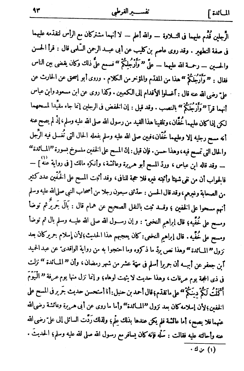 الرِّجْلَيْنِ قُدِّمَ عَلَيْهِمَا فِي التِّلَاوَةِ- وَاللَّهُ أَعْلَمُ- لَا أَنَّهُمَا مُشْتَرِكَانَ مَعَ الرَّأْسِ لِتَقَدُّمِهِ عَلَيْهِمَا فِي صِفَةِ التَّطْهِيرِ. وَقَدْ رَوَى عَاصِمُ بْنُ كُلَيْبٍ عَنْ أَبِي عَبْدِ الرَّحْمَنِ السُّلَمِيِّ قَالَ: قَرَأَ الْحَسَنُ وَالْحُسَيْنُ- رَحْمَةُ اللَّهِ عَلَيْهِمَا- عَلَيَّ (وَأَرْجُلِكُمْ) فَسَمِعَ عَلِيٌّ ذَلِكَ وَكَانَ يَقْضِي بَيْنَ النَّاسِ فَقَالَ: (وَأَرْجُلَكُمْ) هَذَا مِنَ الْمُقَدَّمِ وَالْمُؤَخَّرِ مِنَ الْكَلَامِ. وَرَوَى أَبُو إِسْحَاقَ عَنِ الْحَارِثِ عَنْ عَلِيٍّ رَضِيَ اللَّهُ عَنْهُ قَالَ: اغْسِلُوا الْأَقْدَامَ إِلَى الْكَعْبَيْنِ. وَكَذَا رُوِيَ عَنِ ابْنِ مسعود وابن عباس أنهما قرءا (وَأَرْجُلَكُمْ) بِالنَّصْبِ. وَقَدْ قِيلَ: إِنَّ الْخَفْضَ فِي الرِّجْلَيْنِ إِنَّمَا جَاءَ مُقَيَّدًا لِمَسْحِهِمَا لَكِنْ إِذَا كَانَ عَلَيْهِمَا خُفَّانِ، وَتَلَقَّيْنَا هَذَا الْقَيْدَ مِنْ رَسُولِ اللَّهِ صَلَّى اللَّهُ عَلَيْهِ وَسَلَّمَ، إِذْ لَمْ يَصِحْ عَنْهُ أَنَّهُ مَسَحَ رِجْلَيْهِ إِلَّا وَعَلَيْهِمَا خُفَّانِ، فَبَيَّنَ صَلَّى اللَّهُ عَلَيْهِ وَسَلَّمَ بِفِعْلِهِ الْحَالَ الَّتِي تُغْسَلُ فِيهِ الرِّجْلُ وَالْحَالَ الَّتِي تُمْسَحُ فِيهِ، وَهَذَا حَسَنٌ. فَإِنْ قِيلَ: إِنَّ الْمَسْحَ عَلَى الْخُفَّيْنِ مَنْسُوخٌ بِسُورَةِ (الْمَائِدَةِ) - وَقَدْ قَالَهُ ابْنُ عَبَّاسٍ، وَرَدَّ الْمَسْحَ أَبُو هُرَيْرَةَ وَعَائِشَةُ، وَأَنْكَرَهُ مَالِكٌ] فِي رِوَايَةٍ عَنْهُ [«١» - فَالْجَوَابُ أَنَّ مَنْ نَفَى شَيْئًا وَأَثْبَتَهُ غَيْرُهُ فَلَا حُجَّةَ لِلنَّافِي، وَقَدْ أَثْبَتَ الْمَسْحَ عَلَى الْخُفَّيْنِ عَدَدٌ كَثِيرٌ مِنَ الصَّحَابَةِ وَغَيْرِهِمْ، وَقَدْ قَالَ الْحَسَنُ: حَدَّثَنِي سَبْعُونَ رَجُلًا مِنْ أَصْحَابِ النَّبِيِّ صَلَّى اللَّهُ عَلَيْهِ وَسَلَّمَ أَنَّهُمْ مَسَحُوا عَلَى الْخُفَّيْنِ، وَقَدْ ثَبَتَ بِالنَّقْلِ الصَّحِيحِ عَنْ هَمَّامٍ قَالَ: بَالَ جَرِيرٌ ثُمَّ تَوَضَّأَ وَمَسَحَ عَلَى خُفَّيْهِ، قَالَ إِبْرَاهِيمُ النَّخَعِيُّ: وَأَنَّ رَسُولَ اللَّهِ صَلَّى اللَّهُ عَلَيْهِ وَسَلَّمَ بَالَ ثُمَّ تَوَضَّأَ وَمَسَحَ عَلَى خُفَّيْهِ. قَالَ إِبْرَاهِيمُ النَّخَعِيُّ: كَانَ يُعْجِبُهُمْ هَذَا الْحَدِيثُ، لِأَنَّ إِسْلَامَ جَرِيرٍ كَانَ بَعْدَ نُزُولِ (الْمَائِدَةِ) وَهَذَا نَصٌّ يَرُدُّ مَا ذَكَرُوهُ وَمَا احْتَجُّوا بِهِ مِنْ رِوَايَةِ الواقدي عن عبد الحميد ابن جَعْفَرٍ عَنْ أَبِيهِ أَنَّ جَرِيرًا أَسْلَمَ فِي سِتَّةَ عَشَرَ مِنْ شَهْرِ رَمَضَانَ، وَأَنَّ (الْمَائِدَةَ) نَزَلَتْ فِي ذِي الْحِجَّةِ يَوْمَ عَرَفَاتٍ، وَهَذَا حَدِيثٌ لَا يَثْبُتُ لِوَهَاهُ، وَإِنَّمَا نَزَلَ مِنْهَا يَوْمَ عَرَفَةَ" الْيَوْمَ أَكْمَلْتُ لَكُمْ دِينَكُمْ" عَلَى مَا تَقَدَّمَ، قَالَ أَحْمَدُ بْنُ حَنْبَلٍ: أَنَا أَسْتَحْسِنُ حَدِيثَ جَرِيرٍ فِي الْمَسْحِ عَلَى الْخُفَّيْنِ، لِأَنَّ إِسْلَامَهُ كَانَ بَعْدَ نُزُولِ (الْمَائِدَةِ) وَأَمَّا مَا رُوِيَ عَنْ أَبِي هُرَيْرَةَ وَعَائِشَةَ رَضِيَ اللَّهُ عَنْهُمَا فَلَا يَصِحُّ، أَمَّا عَائِشَةُ فَلَمْ يَكُنْ عِنْدَهَا بِذَلِكَ عِلْمٌ، وَلِذَلِكَ رَدَّتِ السَّائِلَ إِلَى عَلِيٍّ رَضِيَ اللَّهُ عَنْهُ وَأَحَالَتْهُ عَلَيْهِ فَقَالَتْ: سَلْهُ فَإِنَّهُ كَانَ يُسَافِرُ مَعَ رَسُولِ اللَّهِ صَلَّى اللَّهُ عَلَيْهِ وَسَلَّمَ، الحديث.