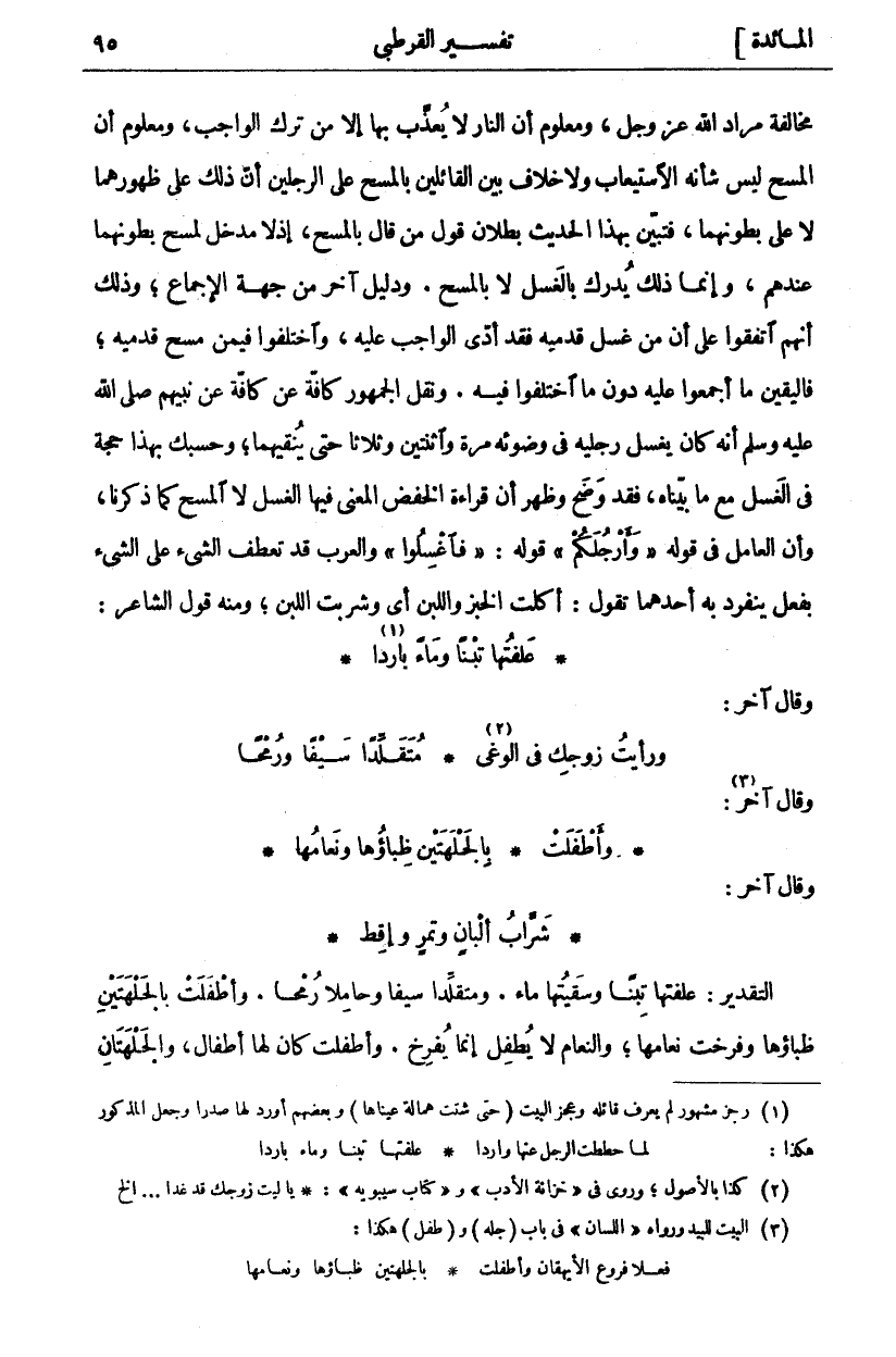 مُخَالَفَةِ مُرَادِ اللَّهِ عَزَّ وَجَلَّ، وَمَعْلُومٌ أَنَّ النَّارَ لَا يُعَذَّبُ بِهَا إِلَّا مَنْ تَرَكَ الْوَاجِبَ، وَمَعْلُومٌ أَنَّ الْمَسْحَ لَيْسَ شَأْنَهُ الِاسْتِيعَابُ وَلَا خِلَافَ بَيْنَ الْقَائِلِينَ بِالْمَسْحِ عَلَى الرِّجْلَيْنِ أَنَّ ذَلِكَ عَلَى ظُهُورِهِمَا لَا عَلَى بُطُونِهِمَا، فَتَبَيَّنَ بِهَذَا الْحَدِيثِ بُطْلَانُ قَوْلِ مَنْ قَالَ بِالْمَسْحِ، إِذْ لَا مَدْخَلَ لِمَسْحِ بُطُونِهِمَا عِنْدَهُمْ، وَإِنَّمَا ذَلِكَ يُدْرَكُ بِالْغَسْلِ لَا بِالْمَسْحِ. وَدَلِيلٌ آخر من وجهة الْإِجْمَاعِ، وَذَلِكَ أَنَّهُمُ اتَّفَقُوا عَلَى أَنَّ مَنْ غَسَلَ قَدَمَيْهِ فَقَدْ أَدَّى الْوَاجِبَ عَلَيْهِ، وَاخْتَلَفُوا فِيمَنْ مَسَحَ قَدَمَيْهِ، فَالْيَقِينُ مَا أَجْمَعُوا عَلَيْهِ دُونَ مَا اخْتَلَفُوا فِيهِ. وَنَقَلَ الْجُمْهُورُ كَافَّةً عَنْ كَافَّةٍ عَنْ نَبِيِّهِمْ صَلَّى اللَّهُ عَلَيْهِ وَسَلَّمَ أَنَّهُ كَانَ يَغْسِلُ رِجْلَيْهِ فِي وُضُوئِهِ مَرَّةً وَاثْنَتَيْنِ وَثَلَاثًا حَتَّى يُنْقِّيَهُمَا، وَحَسْبُكَ بِهَذَا حُجَّةٌ فِي الْغَسْلِ مَعَ مَا بَيَّنَّاهُ، فَقَدْ وَضَحَ وَظَهَرَ أَنَّ قِرَاءَةَ الْخَفْضِ الْمَعْنِيُّ فِيهَا الْغَسْلُ لَا الْمَسْحُ كَمَا ذَكَرْنَا، وَأَنَّ الْعَامِلَ فِي قَوْلِهِ" وَأَرْجُلَكُمْ" قَوْلَهُ:" فَاغْسِلُوا" وَالْعَرَبُ قَدْ تَعْطِفُ الشَّيْءَ عَلَى الشَّيْءِ بِفِعْلٍ يَنْفَرِدُ بِهِ أَحَدُهُمَا تَقُولُ: أَكَلْتُ الْخُبْزَ وَاللَّبَنَ أَيْ وَشَرِبْتُ اللَّبَنَ، وَمِنْهُ قَوْلُ الشَّاعِرِ: