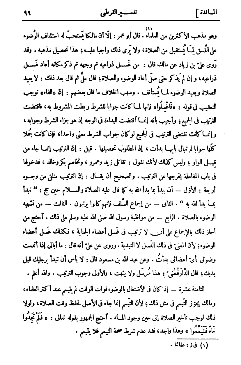 وَهُوَ مَذْهَبُ الْأَكْثَرِينَ مِنَ الْعُلَمَاءِ «١». قَالَ أَبُو عُمَرَ: إِلَّا أَنَّ مَالِكًا يَسْتَحِبُّ لَهُ اسْتِئْنَافُ الْوُضُوءِ عَلَى النَّسَقِ لِمَا يُسْتَقْبَلُ مِنَ الصَّلَاةِ، وَلَا يَرَى ذَلِكَ وَاجِبًا عَلَيْهِ، هَذَا تَحْصِيلُ مَذْهَبِهِ. وَقَدْ رَوَى عَلِيُّ بْنُ زِيَادٍ عَنْ مَالِكٍ قَالَ: مَنْ غَسَلَ ذِرَاعَيْهِ ثُمَّ وَجْهَهُ ثُمَّ ذَكَرَ مَكَانَهُ أَعَادَ غَسْلَ ذِرَاعَيْهِ، وَإِنْ لَمْ يَذْكُرْ حَتَّى صَلَّى أَعَادَ الْوُضُوءَ وَالصَّلَاةَ، قَالَ عَلِيٌّ ثُمَّ قَالَ بَعْدَ ذَلِكَ: لَا يُعِيدُ الصَّلَاةَ وَيُعِيدُ الْوُضُوءَ لِمَا يُسْتَأْنَفُ. وَسَبَبُ الْخِلَافِ مَا قَالَ بَعْضُهُمْ: إِنَّ" الْفَاءَ" تُوجِبُ التَّعْقِيبَ فِي قَوْلِهِ:" فَاغْسِلُوا" فَإِنَّهَا لَمَّا كَانَتْ جَوَابًا لِلشَّرْطِ رَبَطَتِ الْمَشْرُوطَ بِهِ، فَاقْتَضَتِ التَّرْتِيبَ فِي الْجَمِيعِ، وَأُجِيبَ بِأَنَّهُ إِنَّمَا اقْتَضَتِ الْبُدَاءَةَ فِي الْوَجْهِ إِذْ هُوَ جَزَاءُ الشَّرْطِ وَجَوَابُهُ، وَإِنَّمَا كُنْتَ تَقْتَضِي التَّرْتِيبَ فِي الْجَمِيعِ لَوْ كَانَ جَوَابُ الشَّرْطِ مَعْنًى وَاحِدًا، فَإِذَا كَانَتْ جُمَلًا كُلُّهَا جَوَابًا لَمْ تُبَالِ بِأَيِّهَا بَدَأْتَ، إِذِ الْمَطْلُوبُ تَحْصِيلُهَا. قِيلَ: إِنَّ التَّرْتِيبَ إِنَّمَا جَاءَ مِنْ قِبَلِ الْوَاوِ، وَلَيْسَ كَذَلِكَ لِأَنَّكَ تَقُولُ: تَقَاتَلَ زَيْدٌ وَعَمْرٌو، وَتَخَاصَمَ بَكْرٌ وَخَالِدٌ، فَدُخُولُهَا فِي بَابِ الْمُفَاعَلَةِ يُخْرِجُهَا عَنِ التَّرْتِيبِ. وَالصَّحِيحُ أَنْ يُقَالَ: إِنَّ التَّرْتِيبَ مُتَلَقًّى مِنْ وُجُوهٍ أَرْبَعَةٍ: الْأَوَّلُ- أَنْ يَبْدَأَ بِمَا بَدَأَ الله به كم قَالَ عَلَيْهِ الصَّلَاةُ وَالسَّلَامُ حِينَ حَجَّ: (نَبْدَأُ بِمَا بَدَأَ اللَّهُ بِهِ). الثَّانِي- مِنْ إِجْمَاعِ السَّلَفِ فَإِنَّهُمْ كَانُوا يُرَتِّبُونَ. الثَّالِثُ- مِنْ تَشْبِيهِ الْوُضُوءِ بِالصَّلَاةِ. الرَّابِعُ- مِنْ مُوَاظَبَةِ رَسُولِ اللَّهِ صَلَّى اللَّهُ عَلَيْهِ وَسَلَّمَ عَلَى ذَلِكَ. احْتَجَّ مَنْ أَجَازَ ذَلِكَ بِالْإِجْمَاعِ عَلَى أَنْ لَا تَرْتِيبَ فِي غَسْلِ أَعْضَاءِ الْجَنَابَةِ، فَكَذَلِكَ غَسْلُ أَعْضَاءِ الْوُضُوءِ، لِأَنَّ الْمَعْنَى فِي ذَلِكَ الْغَسْلُ لَا التَّبْدِيَةُ. وَرُوِيَ عَنْ عَلِيٍّ أَنَّهُ قَالَ: مَا أُبَالِي إِذَا أَتْمَمْتُ وُضُوئِي بِأَيِ أَعْضَائِي بَدَأْتُ. وَعَنْ عَبْدِ اللَّهِ بْنِ مَسْعُودٍ قَالَ: لَا بَأْسَ أَنْ تَبْدَأَ بِرِجْلَيْكَ قَبْلَ يَدَيْكَ، قَالَ الدَّارَقُطْنِيُّ: هَذَا مُرْسَلٌ وَلَا يَثْبُتُ، وَالْأَوْلَى وُجُوبُ التَّرْتِيبِ. وَاللَّهُ أَعْلَمُ. الثَّامِنَةَ عَشْرَةَ- إِذَا كَانَ فِي الِاشْتِغَالِ بِالْوُضُوءِ فَوَاتُ الْوَقْتِ لَمْ يَتَيَمَّمْ عِنْدَ أَكْثَرِ الْعُلَمَاءِ، وَمَالِكٌ يُجَوِّزُ التَّيَمُّمَ فِي مِثْلِ ذَلِكَ، لِأَنَّ التَّيَمُّمَ إِنَّمَا جَاءَ فِي الْأَصْلِ لِحِفْظِ وَقْتِ الصَّلَاةِ، وَلَوْلَا ذَلِكَ لَوَجَبَ تَأْخِيرُ الصَّلَاةِ إِلَى حِينِ وُجُودِ الْمَاءِ. احْتَجَّ الْجُمْهُورُ بِقَوْلِهِ تَعَالَى:" فَلَمْ تَجِدُوا مَاءً فَتَيَمَّمُوا" وَهَذَا وَاجِدٌ، فَقَدْ عَدِمَ شَرْطَ صِحَّةِ التيمم فلا يتيمم.