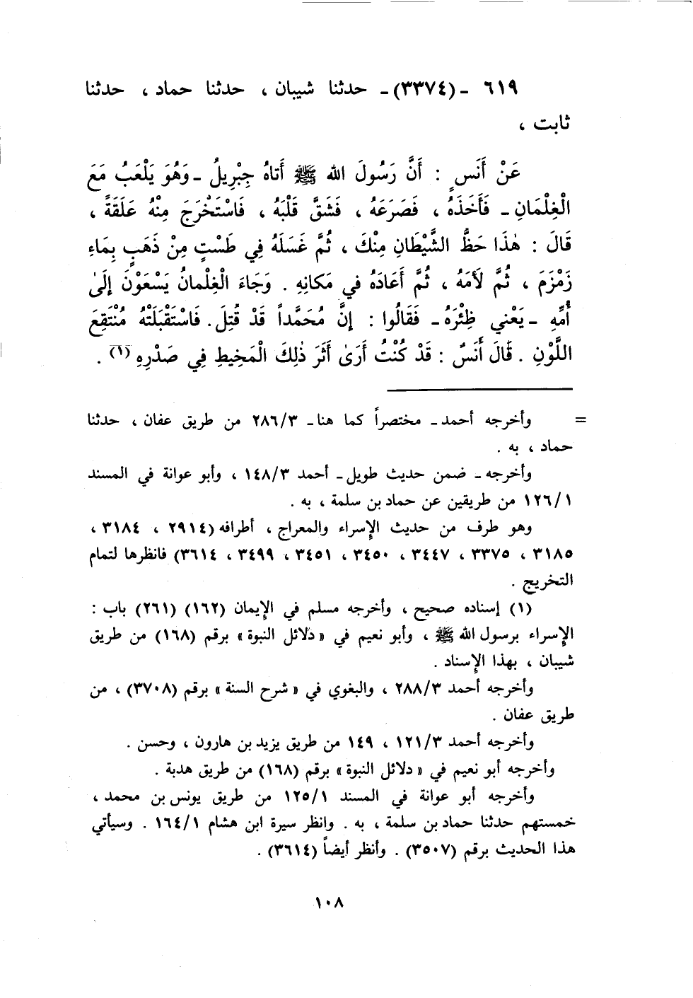 3374 - حَدَّثَنَا شَيْبَانُ، حَدَّثَنَا حَمَّادٌ، حَدَّثَنَا ثَابِتٌ، عَنْ أَنَسٍ: أَنَّ رَسُولَ اللَّهِ صَلَّى اللهُ عَلَيْهِ وَسَلَّمَ " §أَتَاهُ جِبْرِيلُ - وَهُوَ يَلْعَبُ مَعَ الْغِلْمَانِ - فَأَخَذَهُ، فَصَرَعَهُ، فَشَقَّ قَلْبَهُ، فَاسْتَخْرَجَ مِنْهُ عَلَقَةً، قَالَ: هَذَا حَظُّ الشَّيْطَانِ مِنْكَ، ثُمَّ غَسَلَهُ فِي طَسْتٍ مِنْ ذَهَبٍ بِمَاءِ زَمْزَمَ، ثُمَّ لَأَمَهُ، ثُمَّ أَعَادَهُ فِي مَكَانِهِ " وَجَاءَ الْغِلْمَانُ يَسْعَوْنَ إِلَى أُمِّهِ - يَعْنِي: ظِئْرَهُ - فَقَالُوا: إِنَّ مُحَمَّدًا قَدْ قُتِلَ، فَاسْتَقْبَلَتْهُ مُنْتَقِعَ اللَّوْنِ. قَالَ أَنَسٌ: قَدْ كُنْتُ أَرَى أَثَرَ ذَلِكَ الْمِخْيَطِ فِي صَدْرِهِKإسناده صحيح