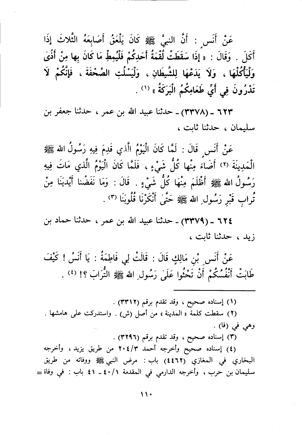 3378 - حَدَّثَنَا عُبَيْدُ اللَّهِ بْنُ عُمَرَ، حَدَّثَنَا جَعْفَرُ بْنُ سُلَيْمَانَ، حَدَّثَنَا ثَابِتٌ، عَنْ أَنَسٍ، قَالَ: «§لَمَّا كَانَ الْيَوْمُ الَّذِي قَدِمَ فِيهِ رَسُولُ اللَّهِ صَلَّى اللهُ عَلَيْهِ وَسَلَّمَ الْمَدِينَةَ أَضَاءَ مِنْهَا كُلُّ شَيْءٍ، فَلَمَّا كَانَ الْيَوْمُ الَّذِي مَاتَ فِيهِ رَسُولُ اللَّهِ صَلَّى اللهُ عَلَيْهِ وَسَلَّمَ أَظْلَمَ مِنْهَا كُلُّ شَيْءٍ» قَالَ: «وَمَا نَفَضْنَا أَيْدِيَنَا مِنْ تُرَابِ قَبْرِ رَسُولِ اللَّهِ صَلَّى اللهُ عَلَيْهِ وَسَلَّمَ حَتَّى أَنْكَرْنَا قُلُوبَنَا» Kإسناده صحيح